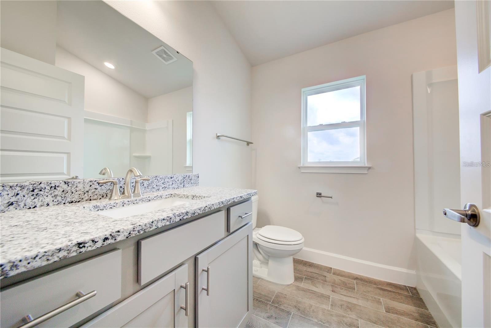 Inside, you’ll find wood-look tile in main areas, carpeted bedrooms, and 10-foot ceilings that create a bright, open feel. The kitchen and bathrooms feature granite countertops and soft-close cabinetry, blending style with everyday functionality.