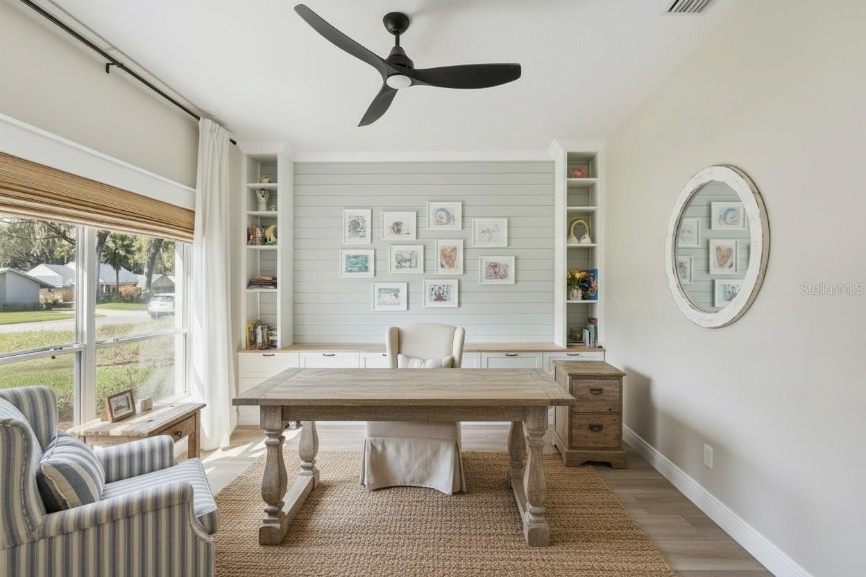 Large office/den/flex room with built-ins — perfect for remote work, media room, or 4th bedroom option
