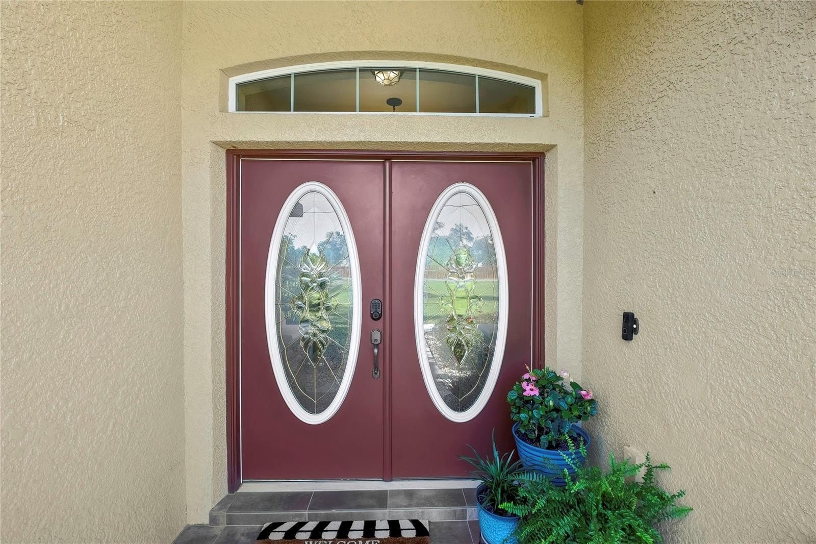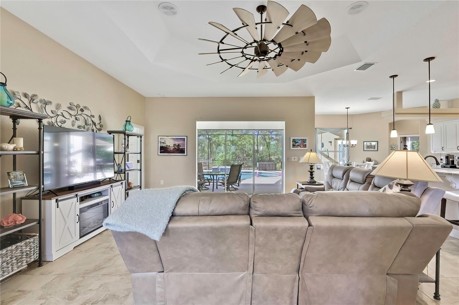 The heart of the home is the great room featuring an elegant tray ceiling and oversized tropical ceiling fan creating an airy, inviting gathering space that flows seamlessly to the kitchen and dining area as well as to the outdoor living area through a three-panel (collapsible) sliding door. The open kitchen features beautiful quartz countertops and a 14-foot two-level bar/island that easily seats six. A suite of GE Profile appliances was installed when construction finished (2019) including an oversized refrigerator with ice maker and beverage center, dishwasher, trash disposal, and stove.