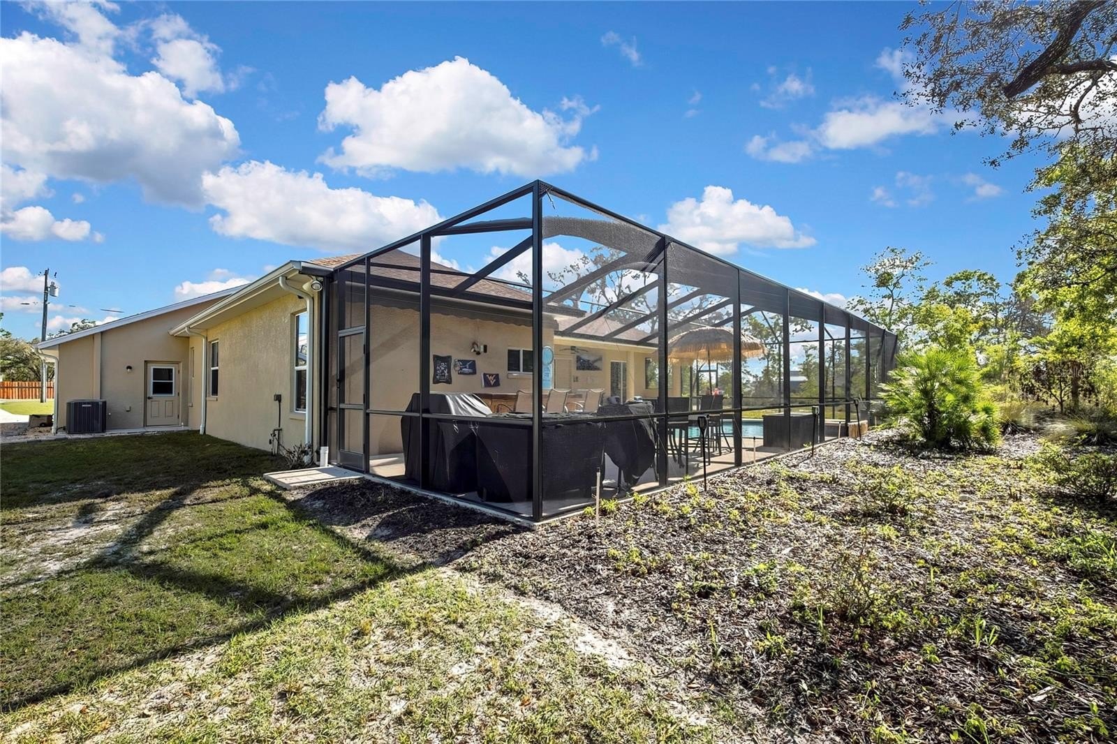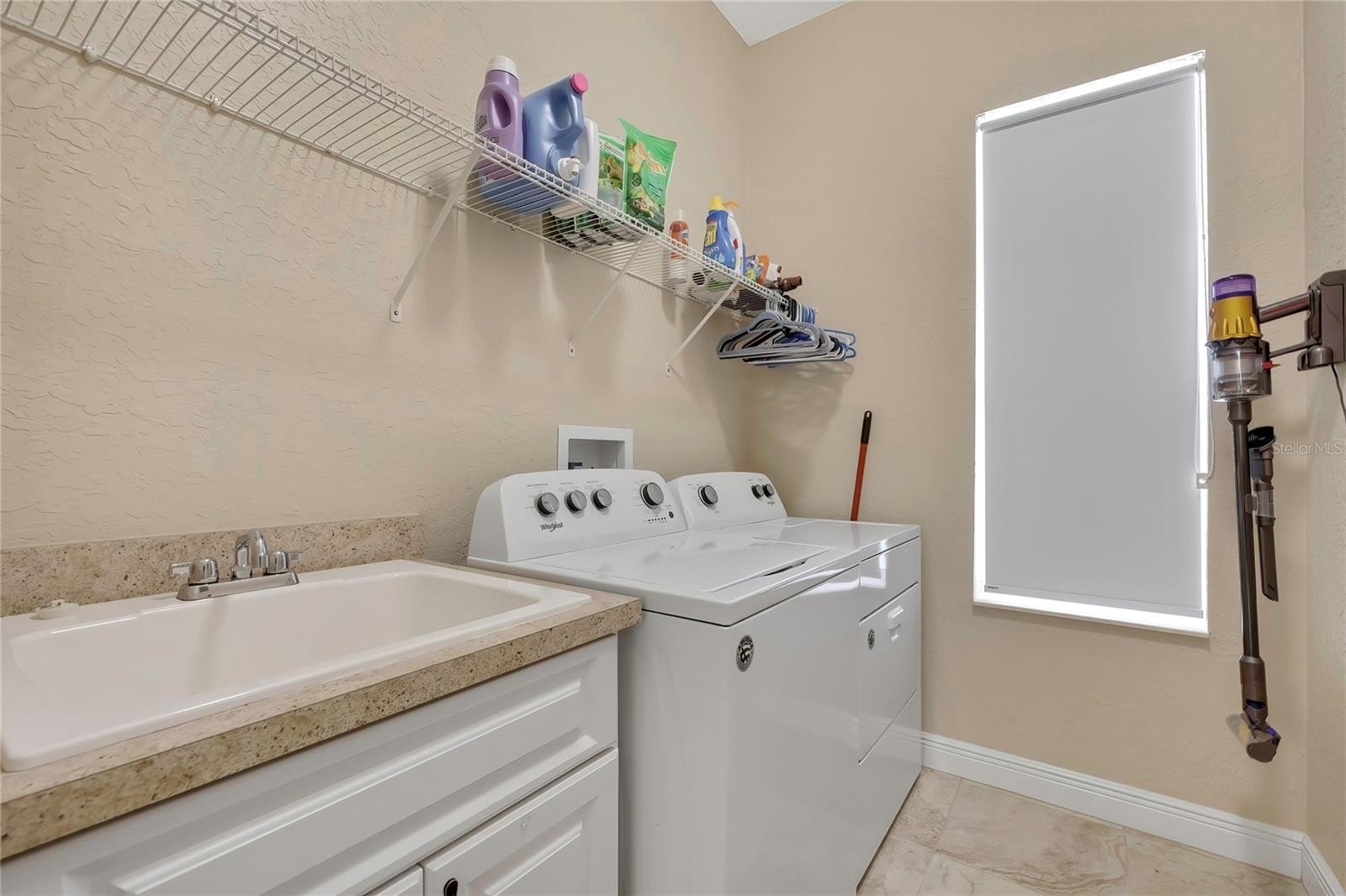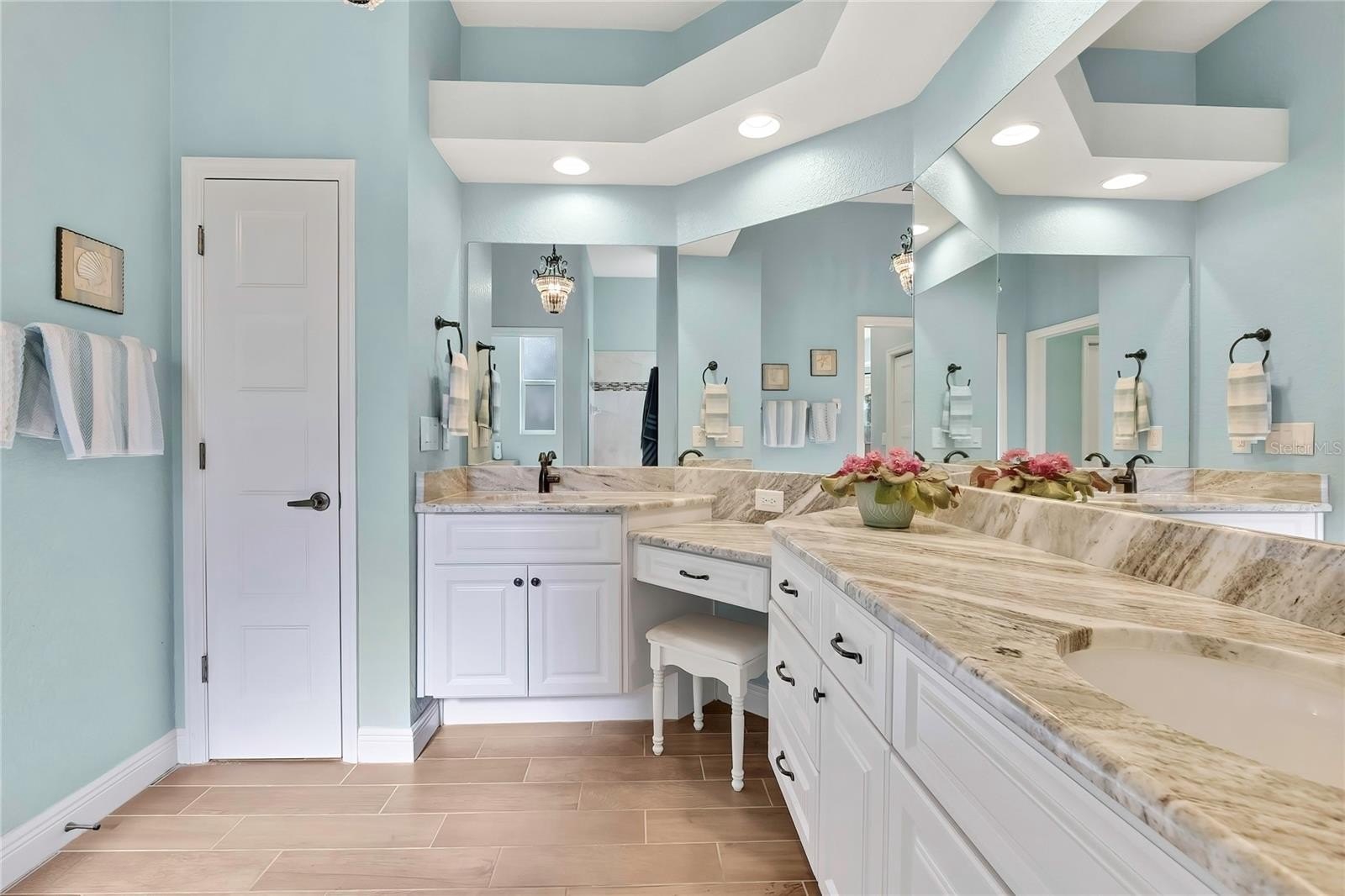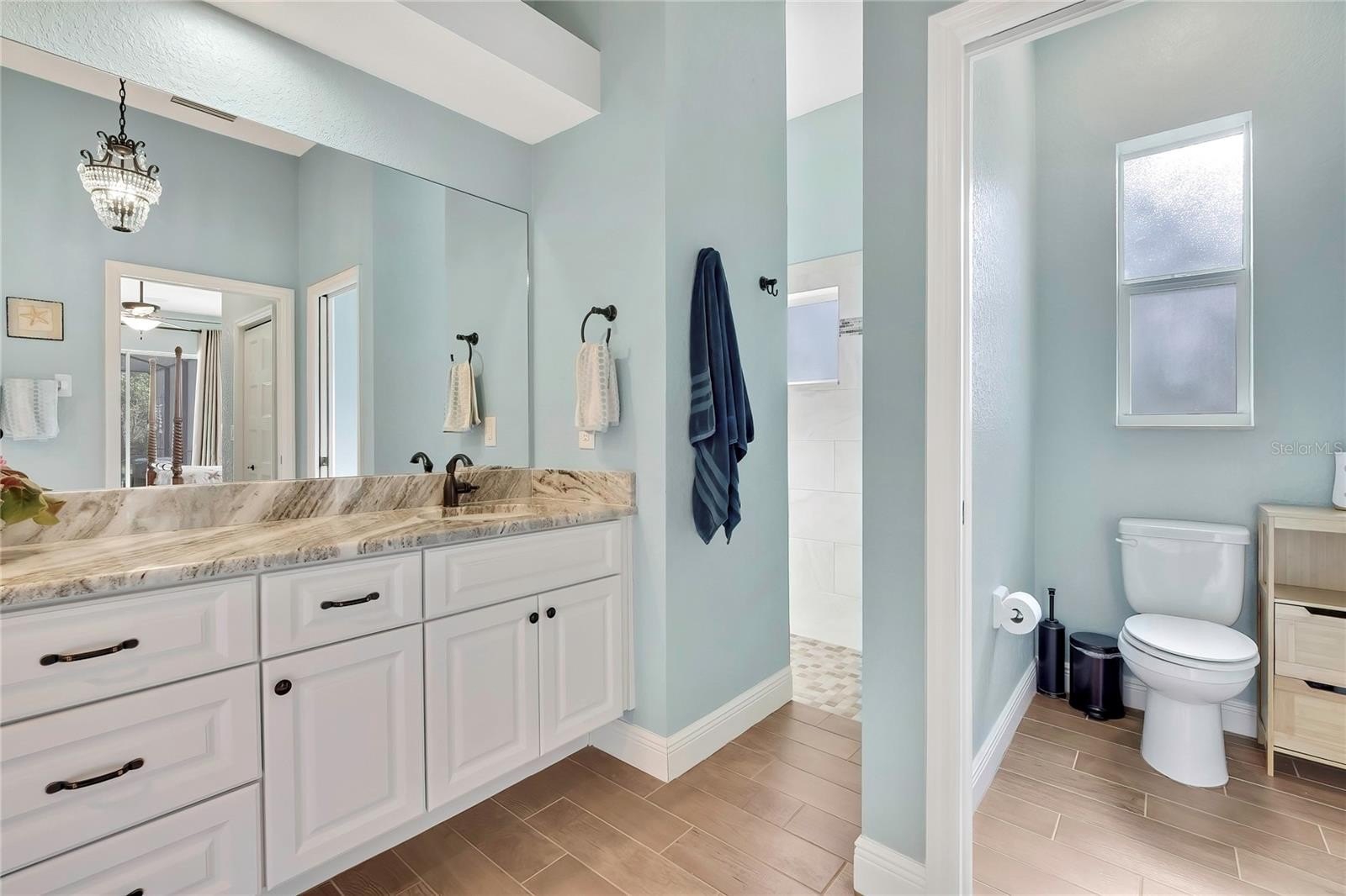 The expansive screened lanai overlooks a stunning salt water “sport” pool with waterfall providing a peaceful retreat where you can relax, entertain, and enjoy the surrounding natural beauty with the sound of running water. Truly a resort-style setting, the outdoor space is perfect for relaxed sunset evenings, weekend gatherings, and a joyful Florida lifestyle. The lanai is also equipped with small sink, and electrical hookup (high) for mounted television (not included), and also has direct access to the guest bathroom.