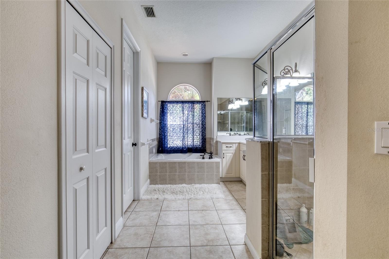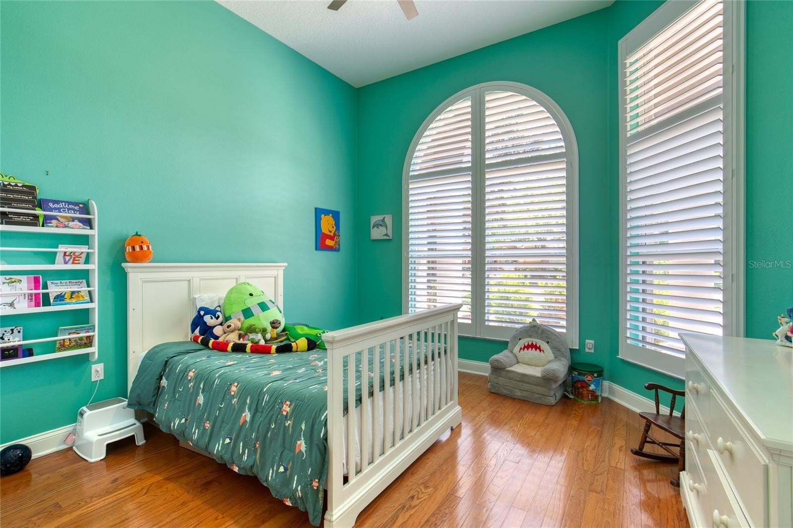 The primary suite serves as a private retreat, highlighted by a sophisticated tray ceiling and custom blinds that are found throughout the home's doors and windows. This wing includes his and her walk-in closets and a spa-like ensuite with his and her vanities. Recent interior updates ensure the home is move-in ready, including a full interior repaint in 2024 and brand-new carpet installed in the bedrooms as of March 2026.