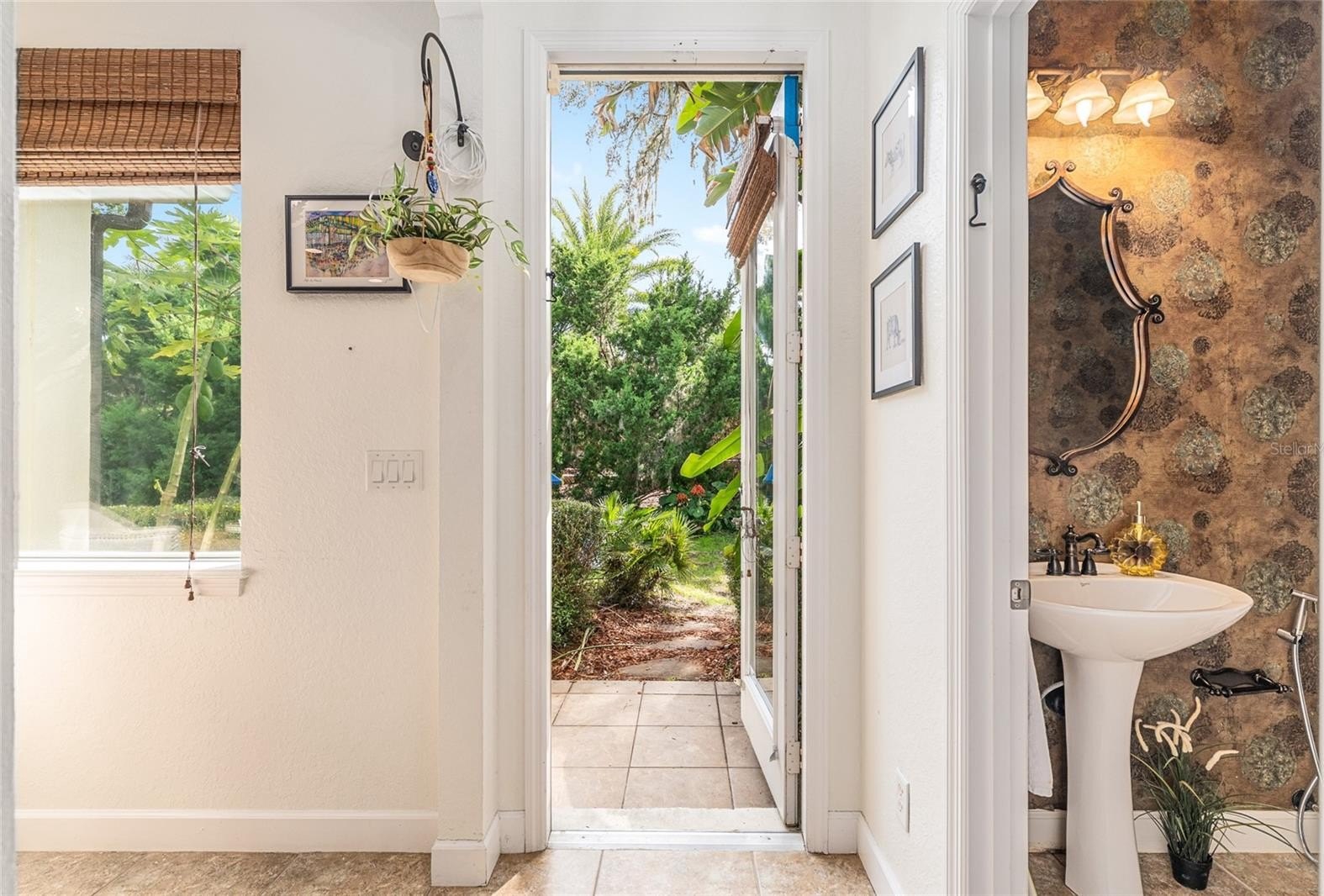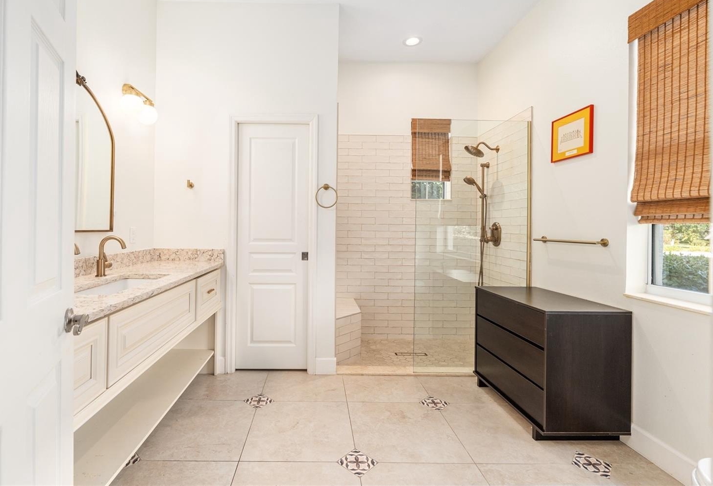 The kitchen features a gas range and modern appliances. The primary bathroom has been fully renovated with a French-inspired design and hand-painted tiles.