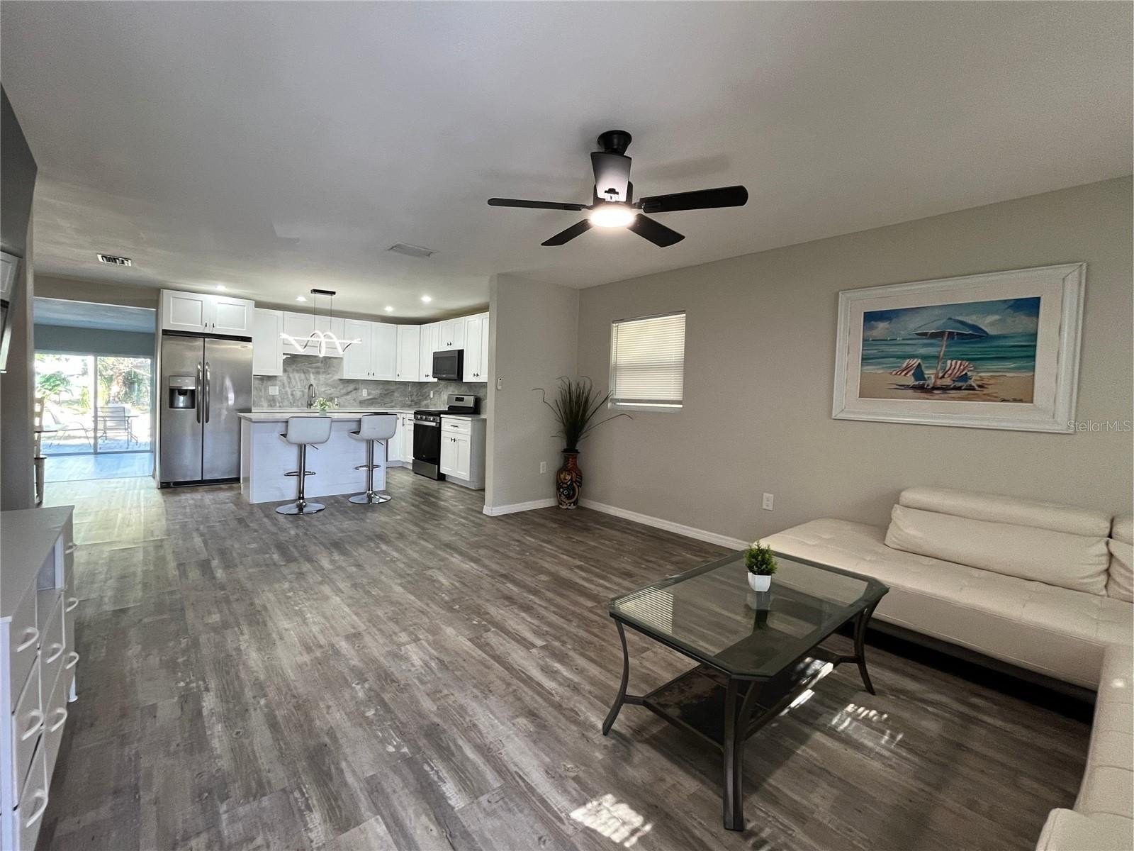 Inside, you’ll find a bright open-concept layout filled with natural light. The spacious living area flows seamlessly into a fully remodeled kitchen featuring modern cabinetry, quartz countertops, stainless steel appliances, and a stylish backsplash—perfect for both everyday living and entertaining.