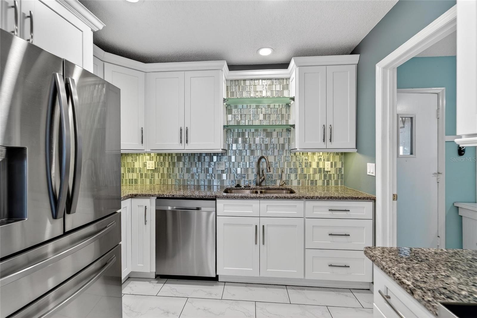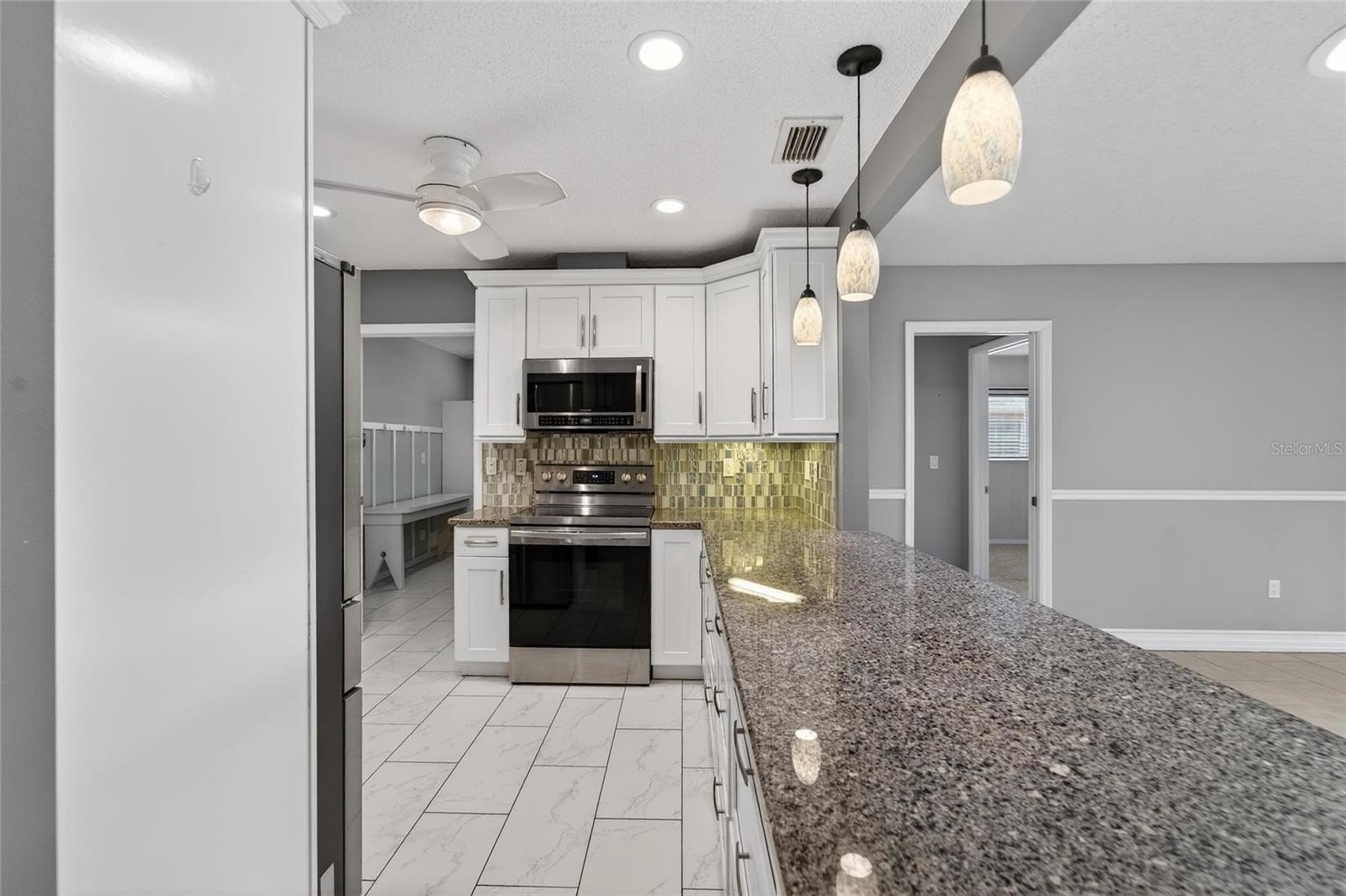 The fully updated kitchen showcases shaker-style cabinetry with deep drawer rollouts, 36-inch upper cabinets with crown molding, granite countertops, a beautiful tiled backsplash, and stainless steel appliances, creating a highly functional and stylish space for everyday living.