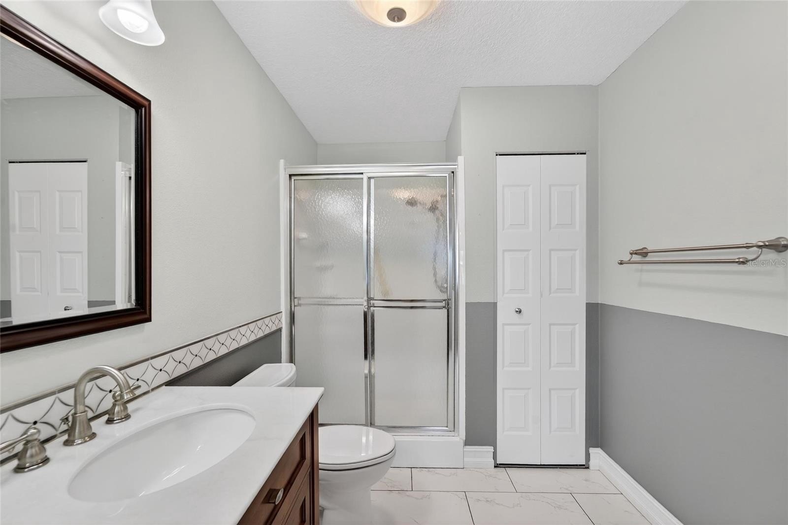 Both bathrooms have been remodeled with new vanities, cabinetry, and walk-in showers, delivering a clean, modern feel.