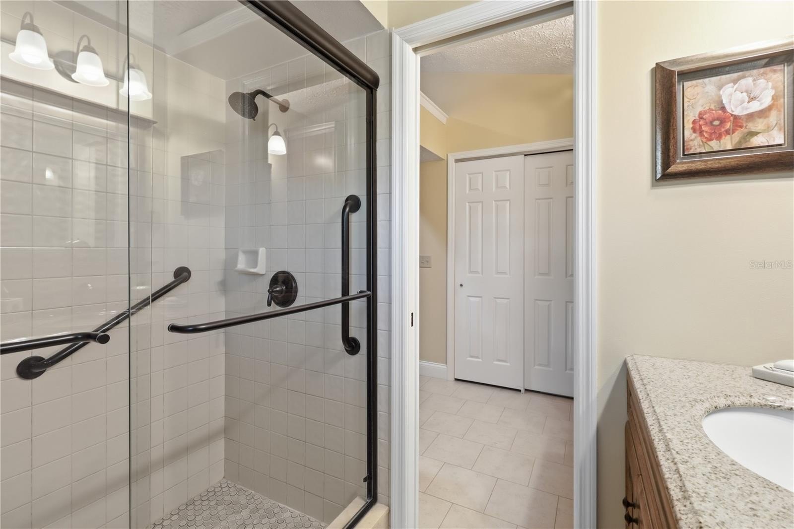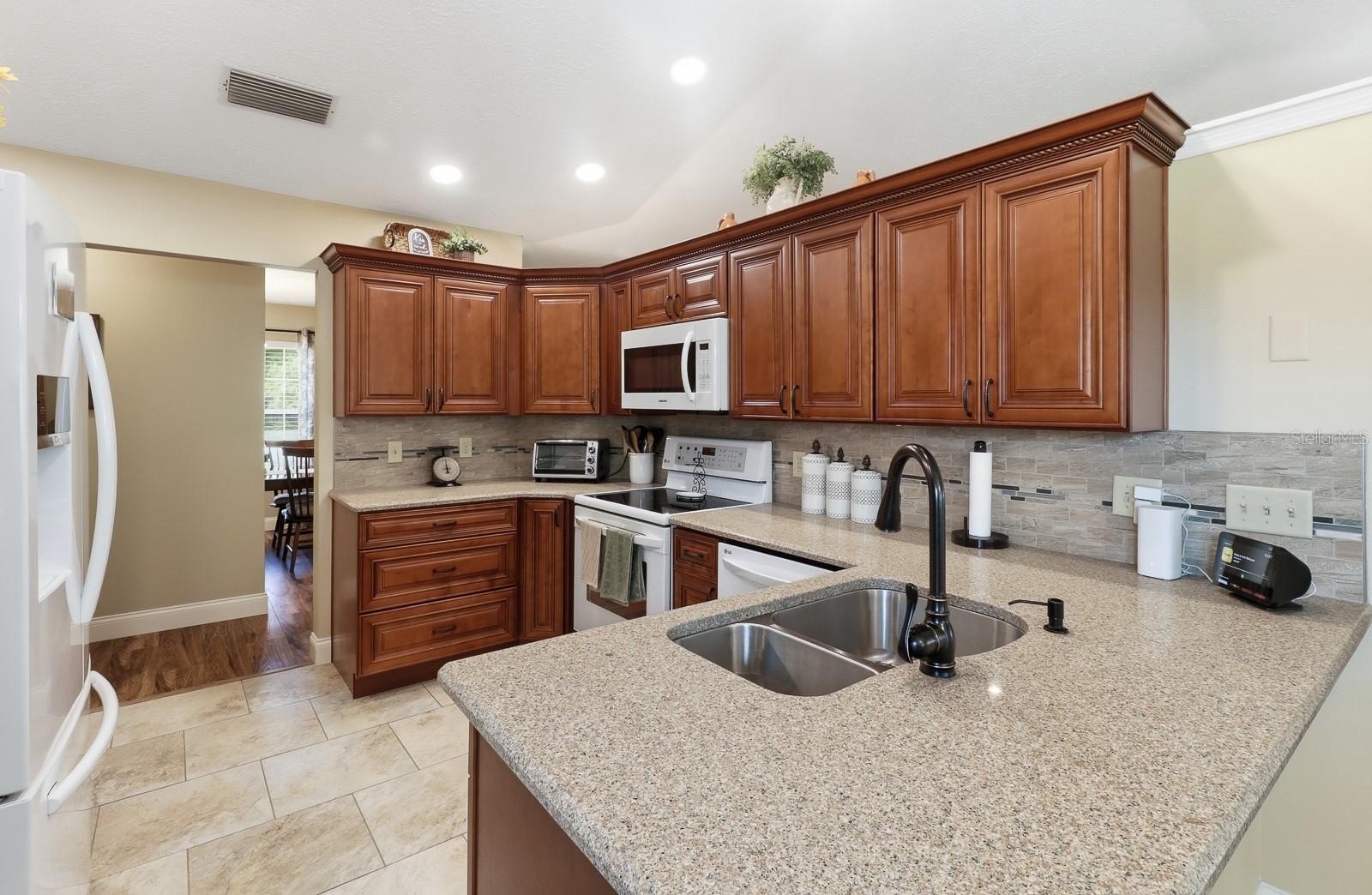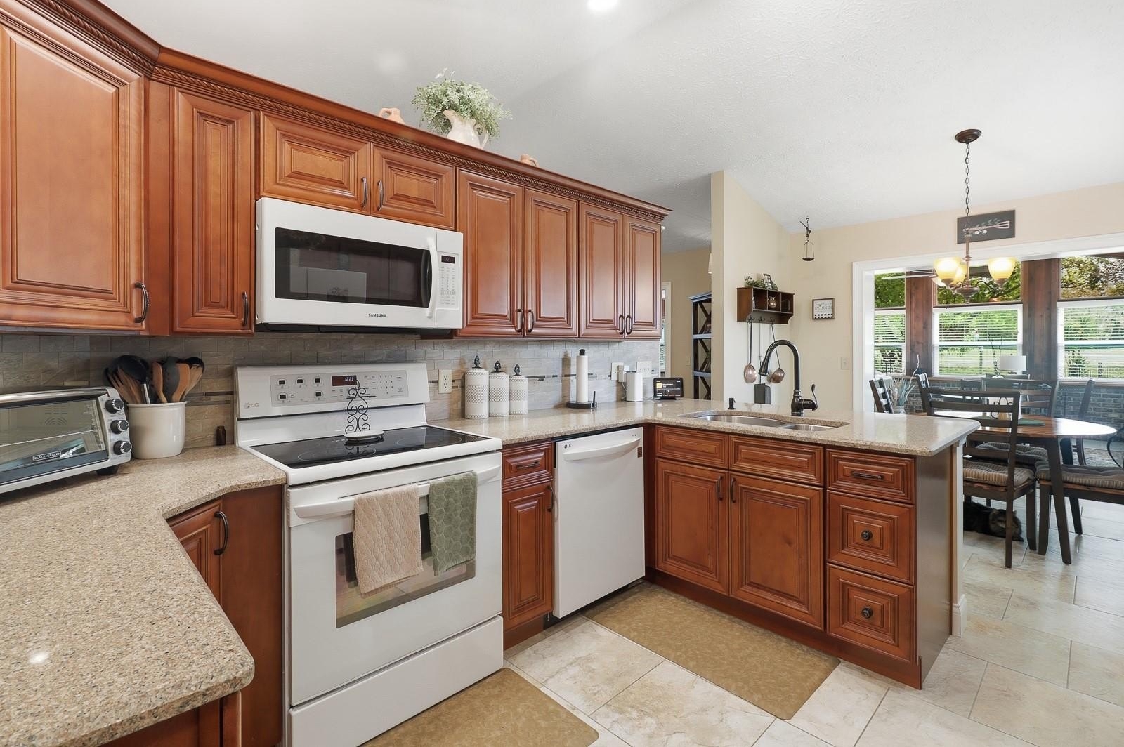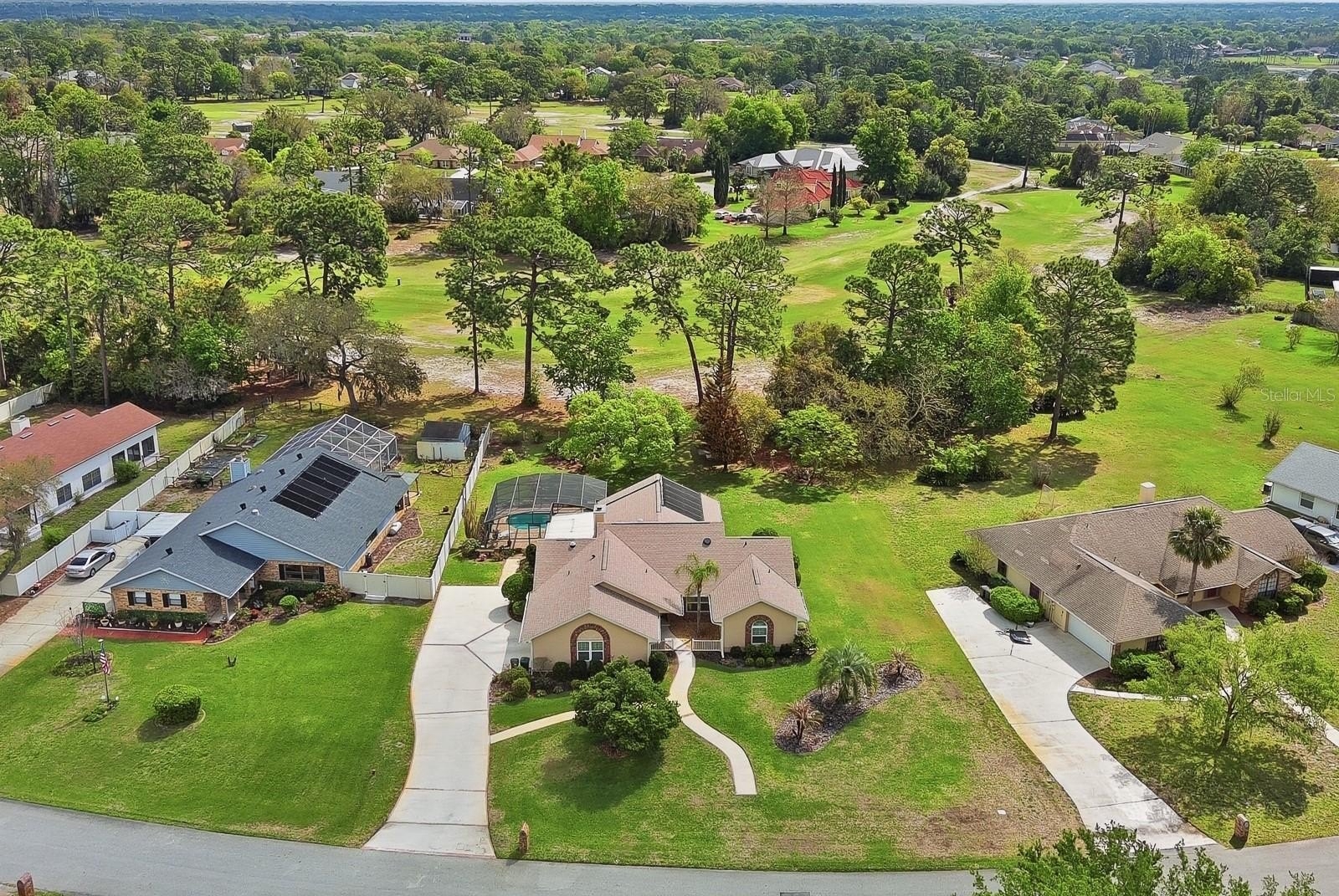 Welcome to your private retreat in the highly sought-after GLEN ABBEY community—where timeless charm meets modern comfort, and with NO HOA the possibilities are endless! Nestled on just over a half an acre and perfectly positioned along the 4th Fairway of Glen Abbey Golf Course, this spacious 3-bedroom, 2-bathroom home offers over 2,500 square feet of thoughtfully designed living space. From the moment you step inside, you’re greeted by a warm, traditional aesthetic that feels both inviting and refined. At the heart of the home, the expansive great room is a true showstopper! This incredible room boasts a wall of windows that flood the space with natural light, while showcasing serene golf course views. This open and airy setting is perfect for both relaxing evenings and entertaining guests. Step through into your spacious living room and cozy up in front of your wood burning, brick fireplace to enjoy on cool, Florida, winter evenings. The kitchen and bathrooms have been tastefully updated with granite countertops, cabinetry, and fixtures complemented by updated flooring throughout the home for a cohesive and modern feel. Comfort and efficiency are top of mind with two air conditioning units, a newer roof (2020), new windows (2020), and a hot water heater just 2 years old. The spacious primary suite is your personal sanctuary, complete with sliding glass doors that lead directly to the outdoor patio and pool area—just step outside to enjoy your own backyard oasis offering tranquil views of the golf course and seamless indoor-outdoor living. The large patio surrounds a solar-heated, screened-in inground pool with a beautiful paver deck, —perfect for year-round enjoyment, entertaining, or simply unwinding- with an outdoor shower so you can wash off your sandy toes! Along with attractive, mature landscaping, this home boasts a well for irrigation to keep utility bills low (pump recently replaced) and a large, outdoor storage shed with connected power and a garage-kept whole house water softener and filtration system. With its generous lot size, prime golf course frontage, NO HOA and blend of classic style with modern updates, this Glen Abbey gem offers a rare opportunity to enjoy space, comfort, and freedom—all in one exceptional home. Schedule your showing today!