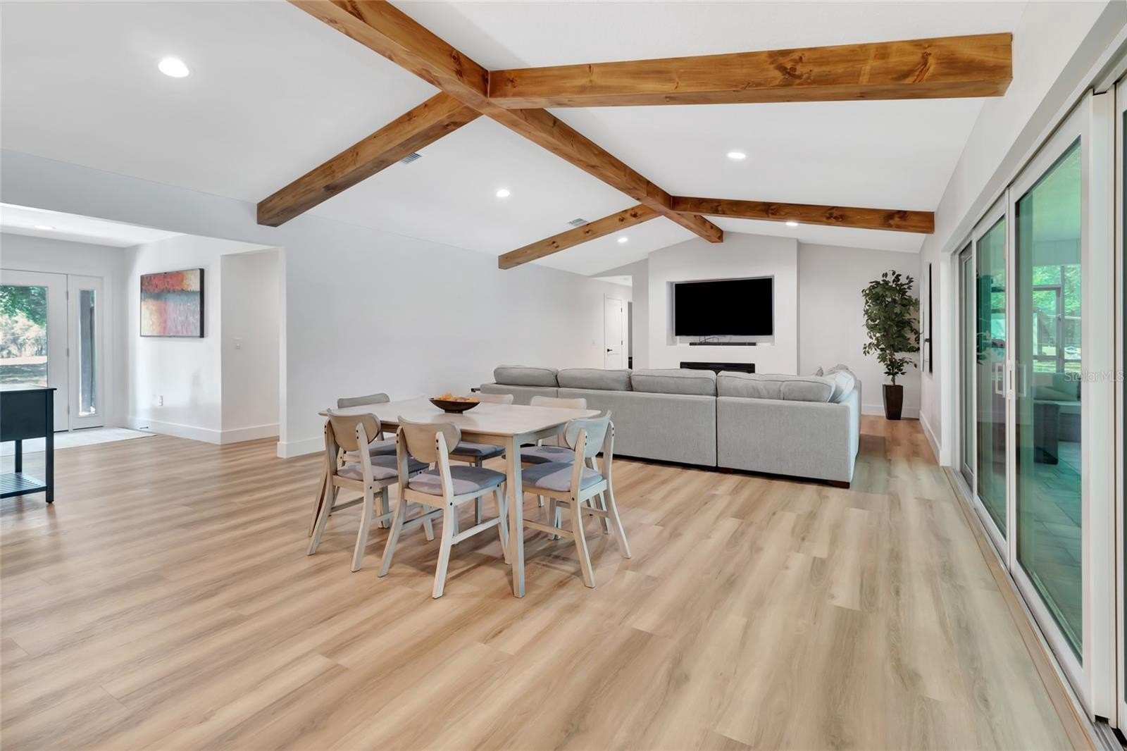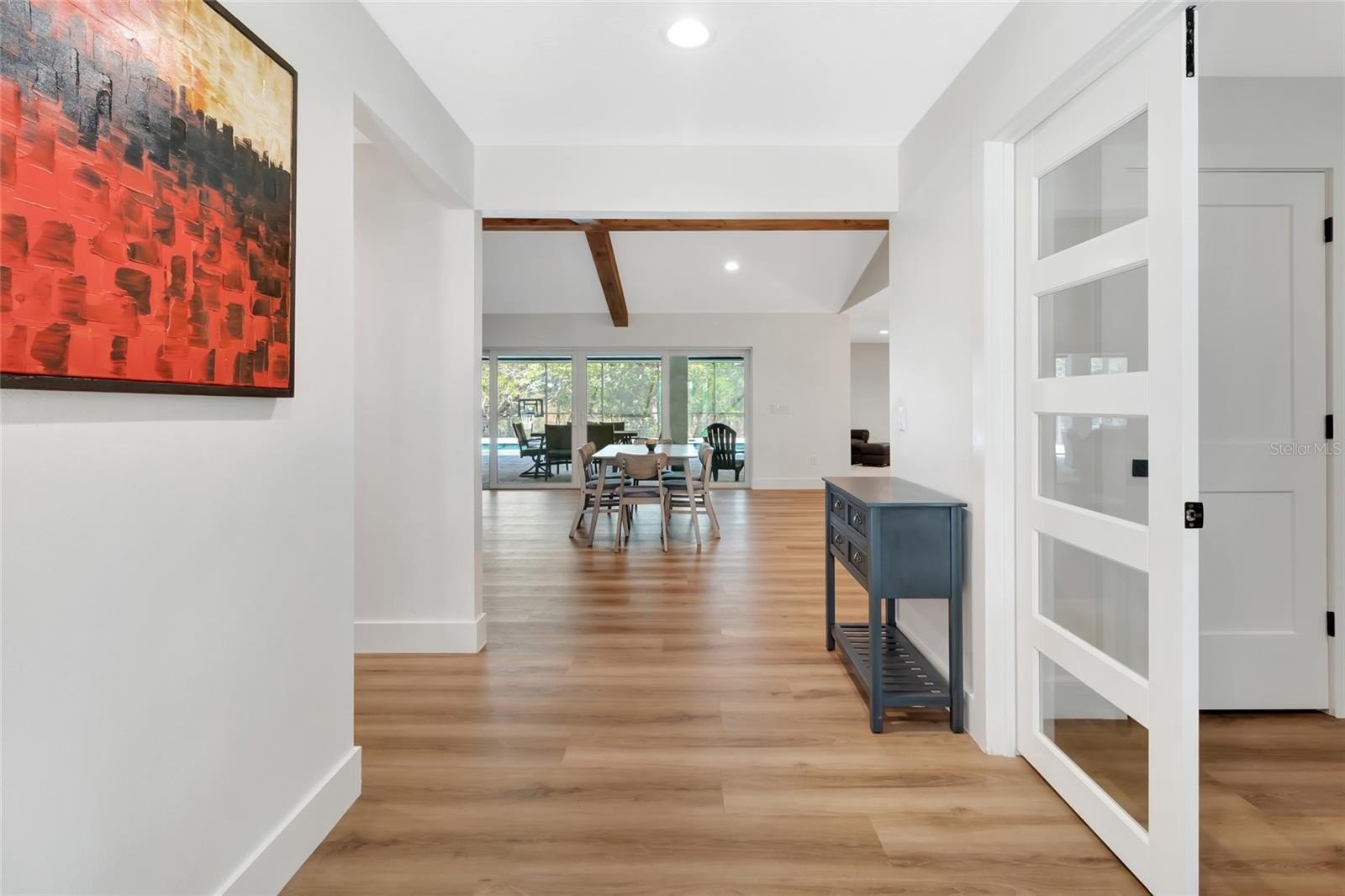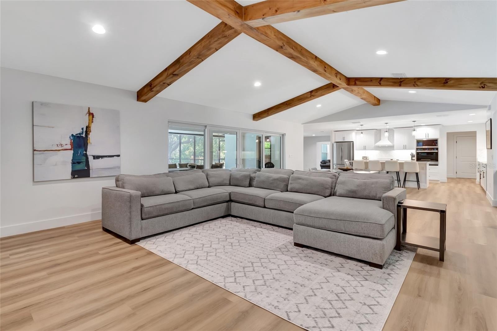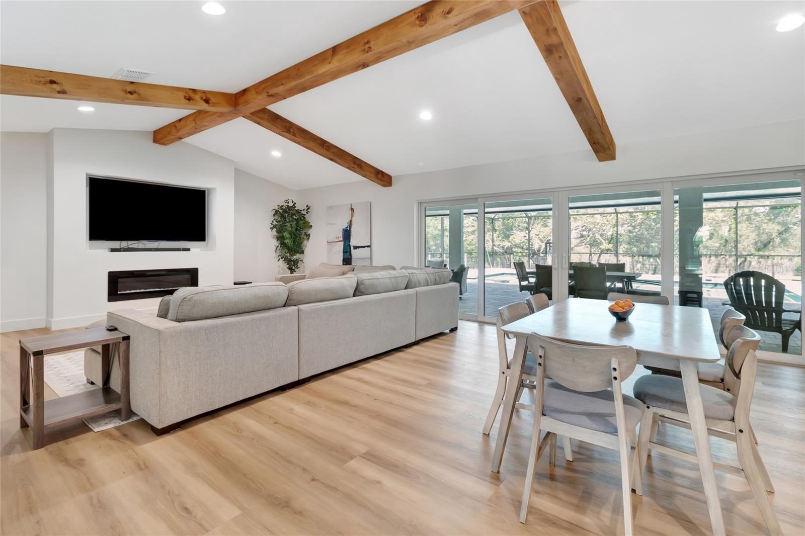 Every inch of this home has been thoughtfully updated, and it shows. Luxury vinyl plank flooring flows throughout, setting a clean, modern foundation that ties every room together. The heart of the home is an open-concept living, kitchen, and dining space anchored by stunning wood beams overhead — warm enough to feel like home, elevated enough to impress. The kitchen itself is a dream, with quartz counter tops, under-mount lighting and 9-foot island. While the walk in pantry will make even the most organized family smile. Double sliders erase the line between indoors and out, opening the living space directly to the screened pool and those sweeping hilltop views beyond.