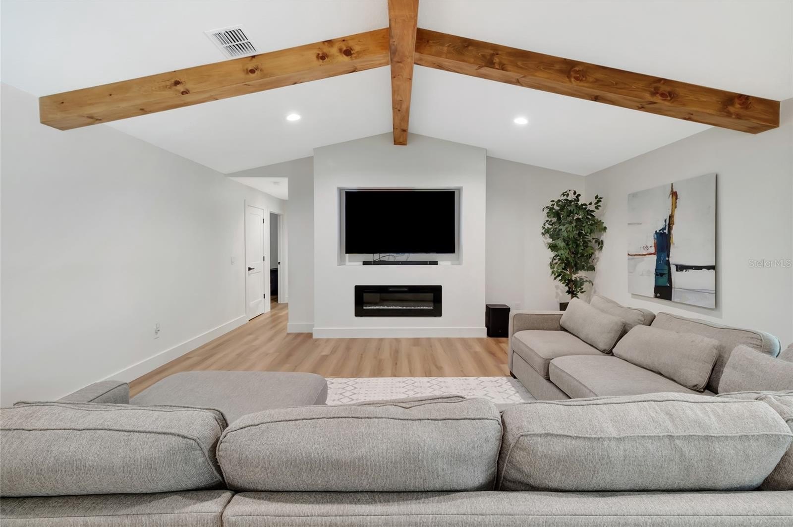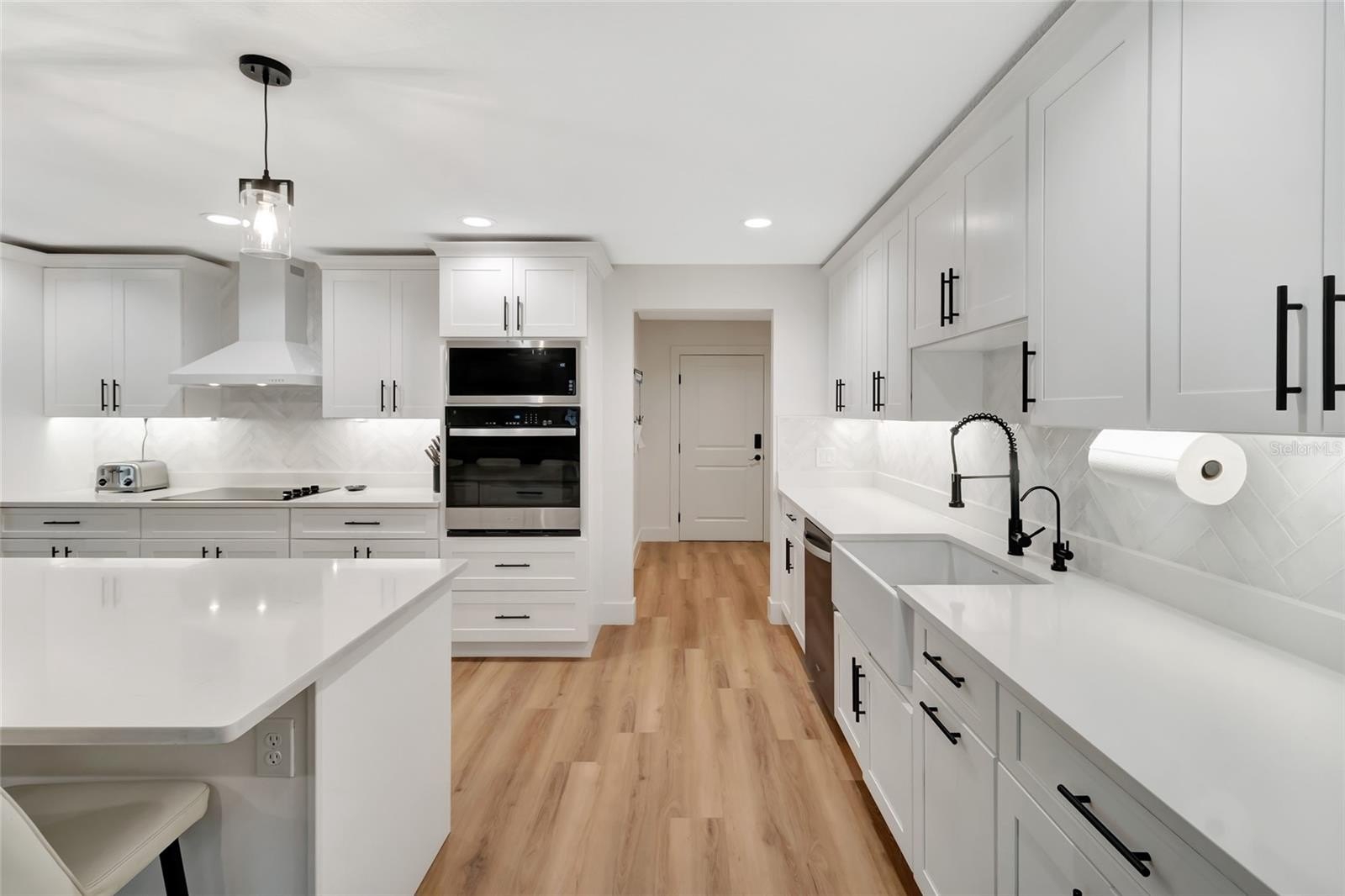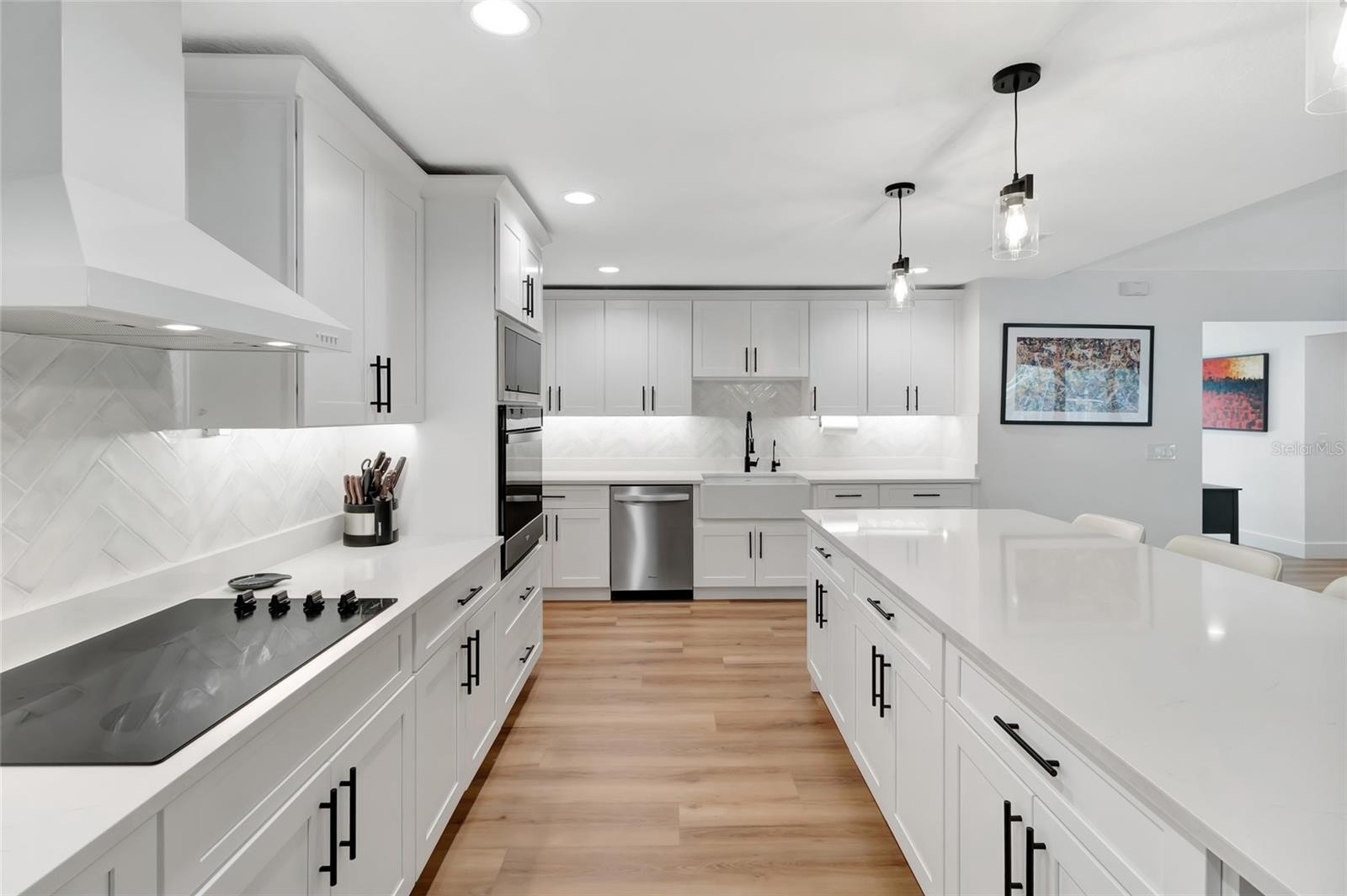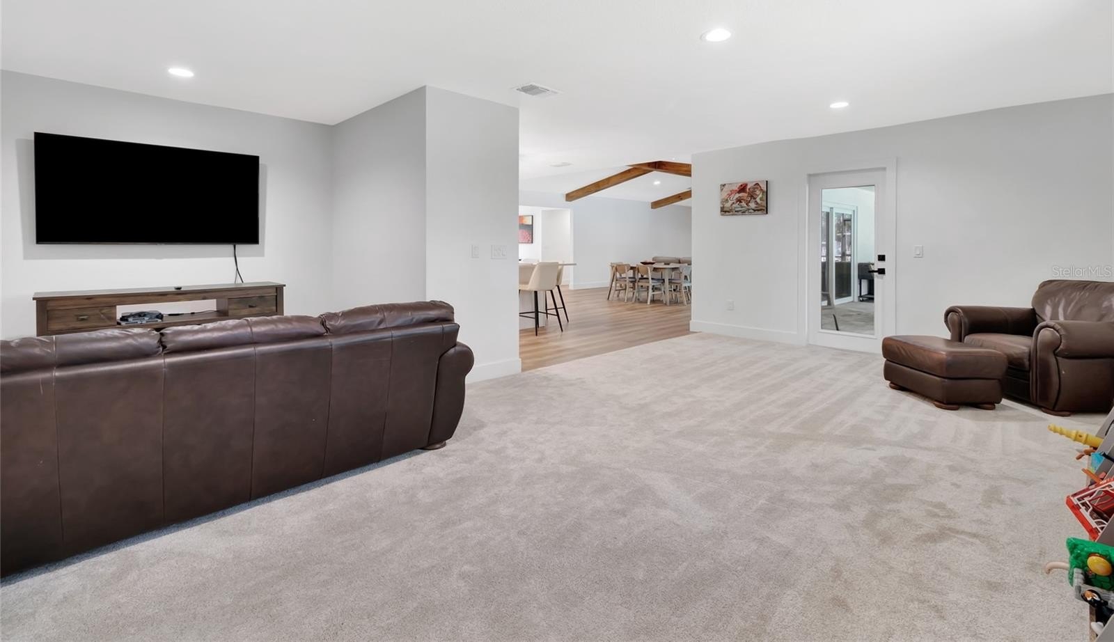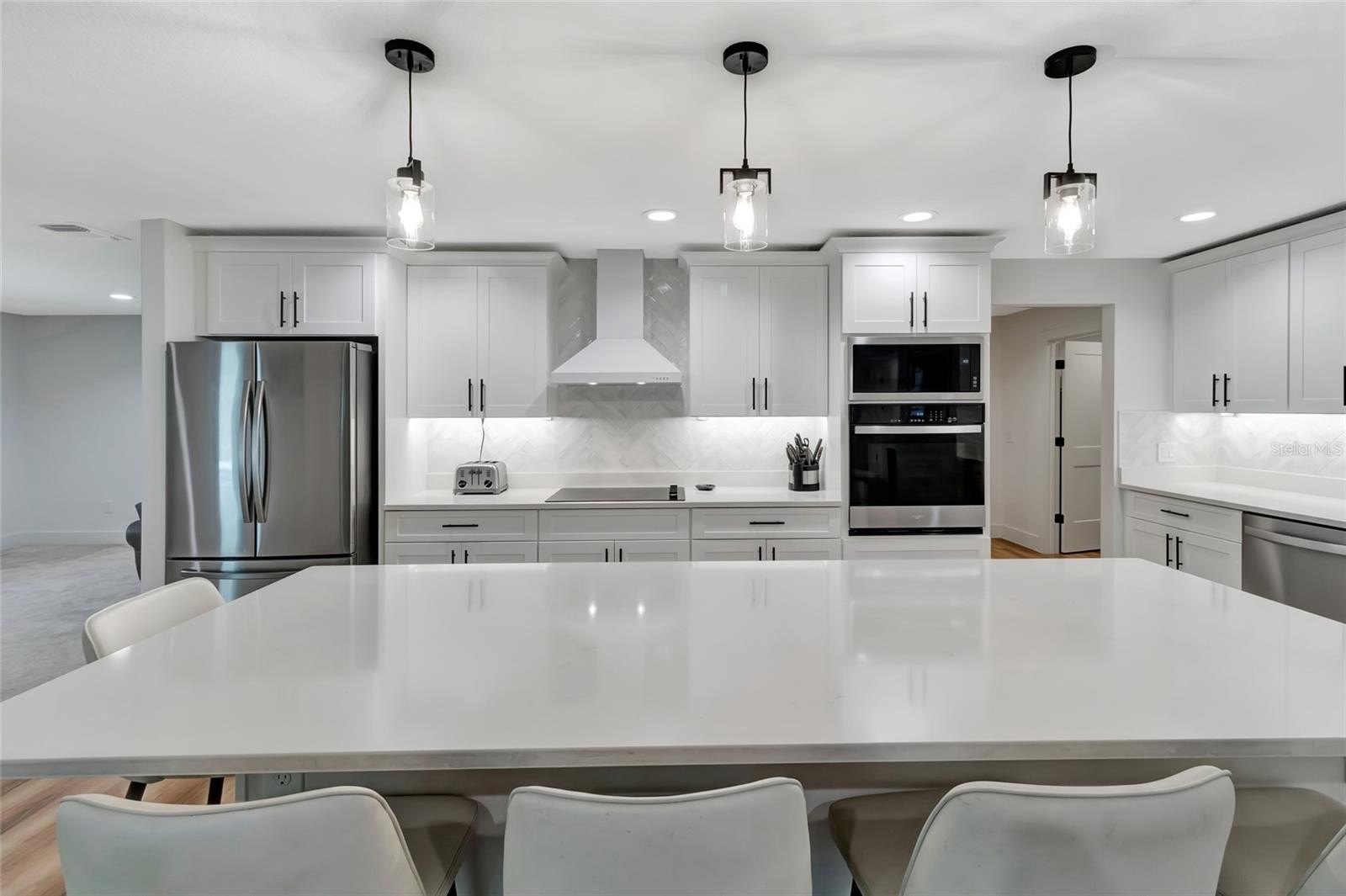 Every inch of this home has been thoughtfully updated, and it shows. Luxury vinyl plank flooring flows throughout, setting a clean, modern foundation that ties every room together. The heart of the home is an open-concept living, kitchen, and dining space anchored by stunning wood beams overhead — warm enough to feel like home, elevated enough to impress. The kitchen itself is a dream, with quartz counter tops, under-mount lighting and 9-foot island. While the walk in pantry will make even the most organized family smile. Double sliders erase the line between indoors and out, opening the living space directly to the screened pool and those sweeping hilltop views beyond.