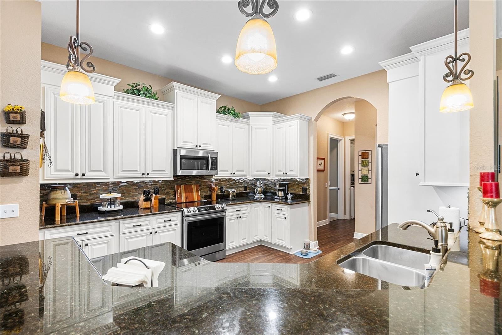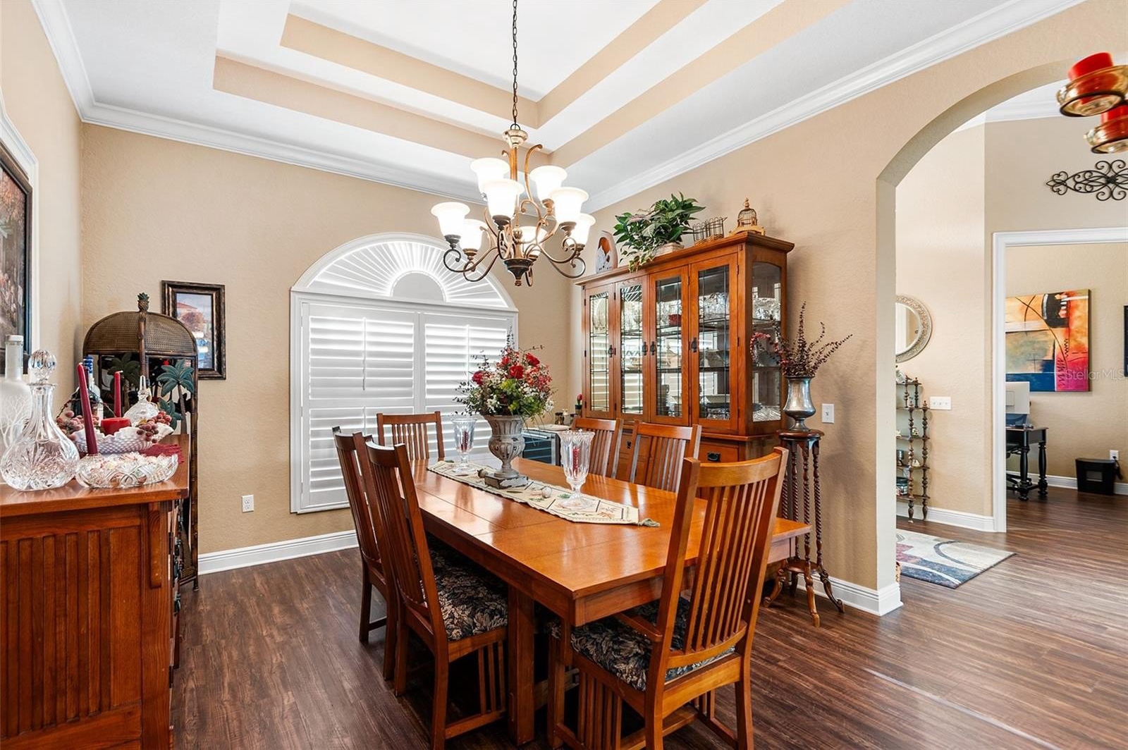 Featuring 3 bedrooms, 3 full bathrooms, and a private office, the layout is ideal for both everyday living and hosting guests. Two spacious primary suites provide flexibility for multi-generational living or an elevated guest experience. Inside, the open-concept floor plan is enhanced by elegant tray ceilings, rich stone accents in the living and kitchen areas, and refinished wood cabinetry. Luxury vinyl plank flooring flows throughout the main living spaces, while new carpeting adds comfort to the bedrooms.