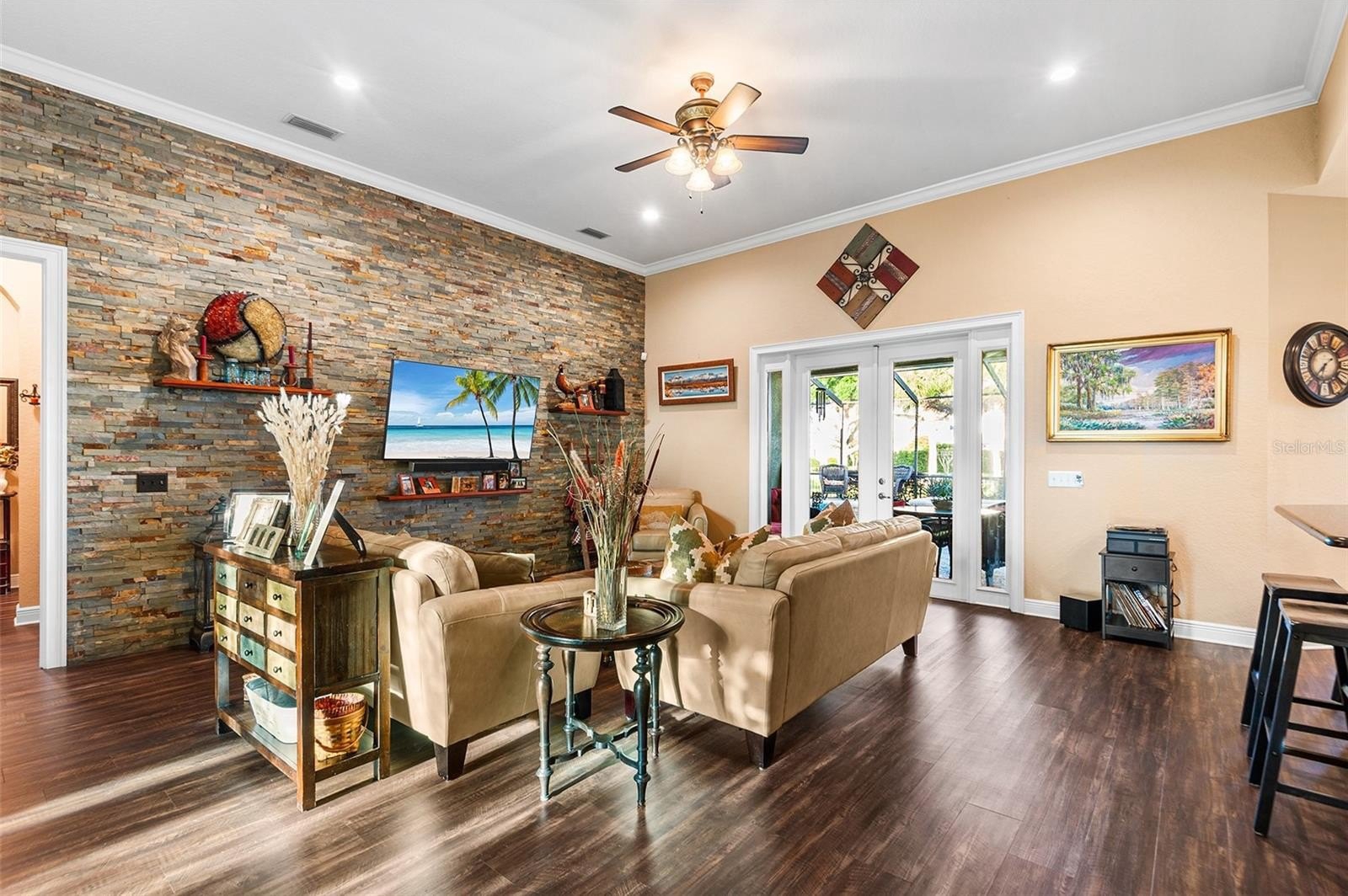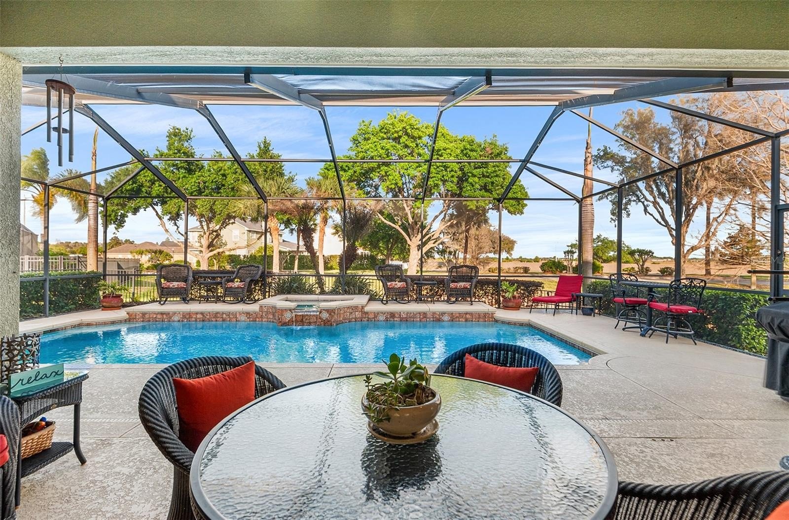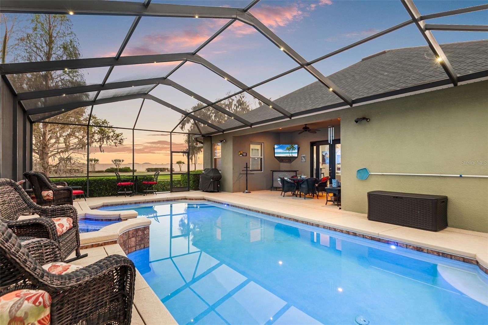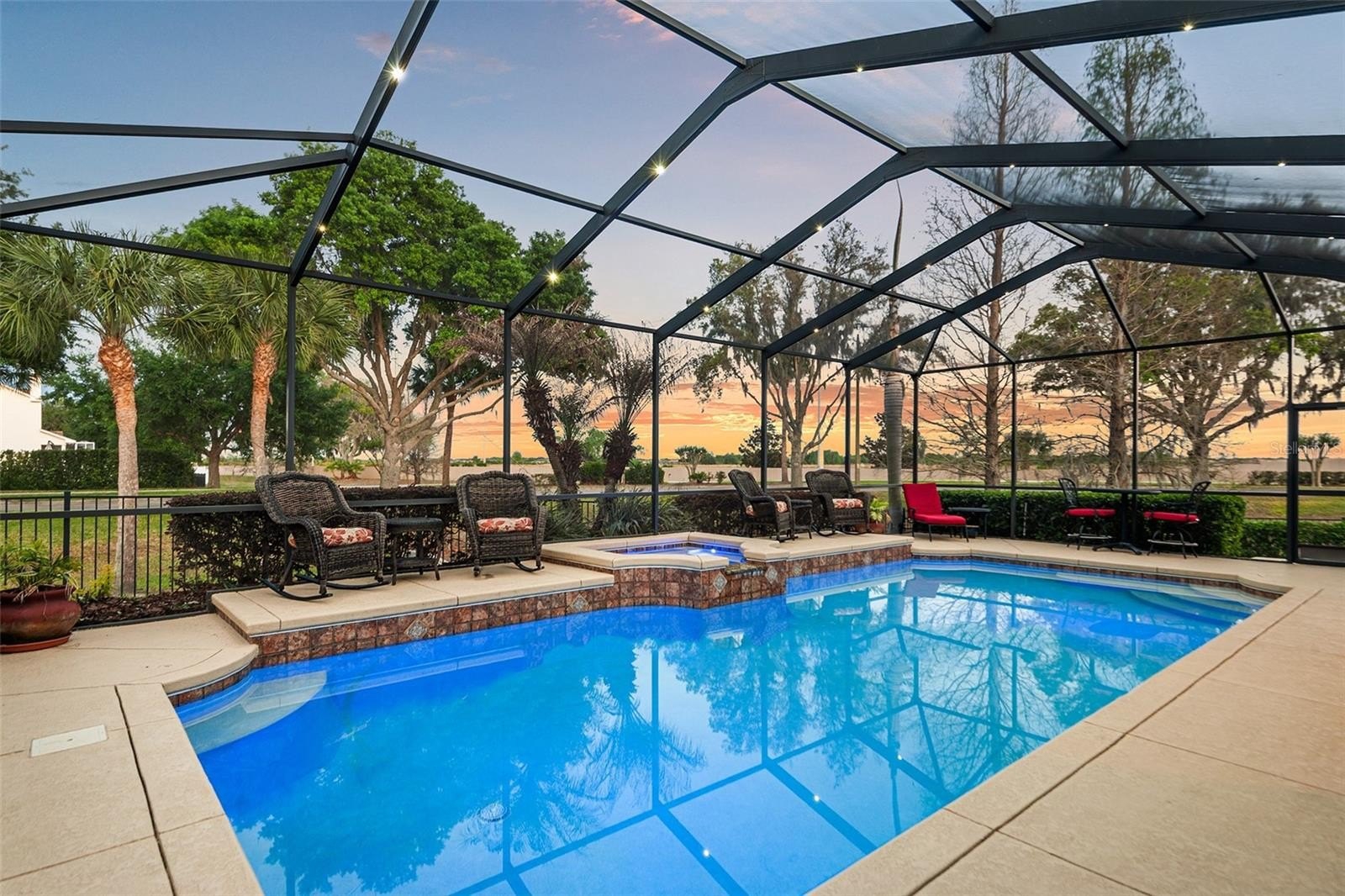 Step outside the French doors to your private backyard retreat—complete with a heated saltwater pool and spa, waterfall features, and a fully screened lanai. The spa can be conveniently controlled from your phone, offering a true resort-style experience at home. Additional enhancements include pool frame track lighting, a newly replaced pool pump (2024), salt cell (2026), and a freshly painted pool deck.