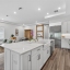 The open-concept layout features a spacious living and dining area with high ceilings, ceramic tile flooring, and abundant natural light, creating a clean and functional flow for everyday living. The kitchen serves as the centerpiece, anchored by an oversized island, solid wood cabinetry, stone countertops, and built-in appliances, making it both a functional workspace and a natural gathering point.