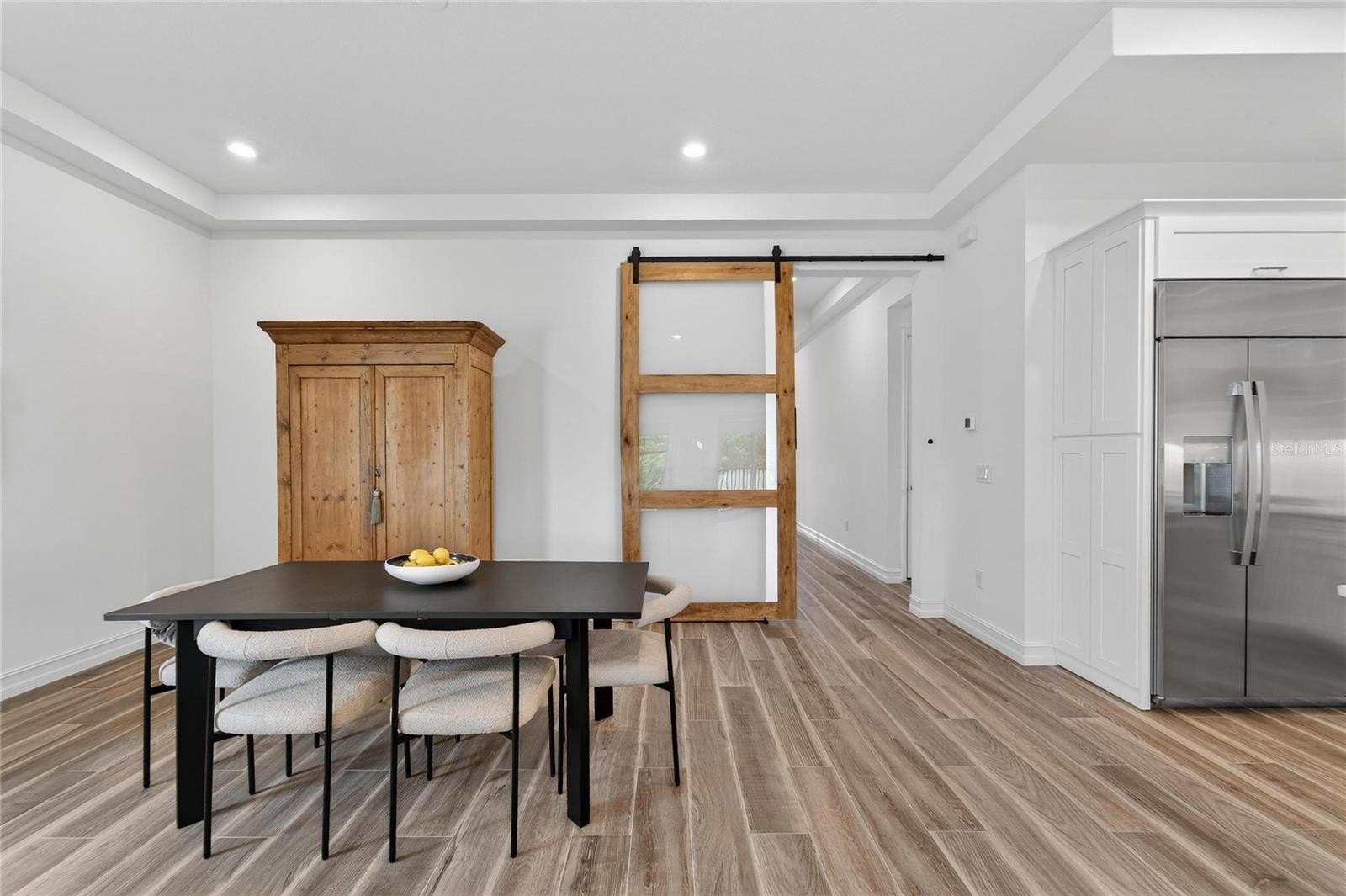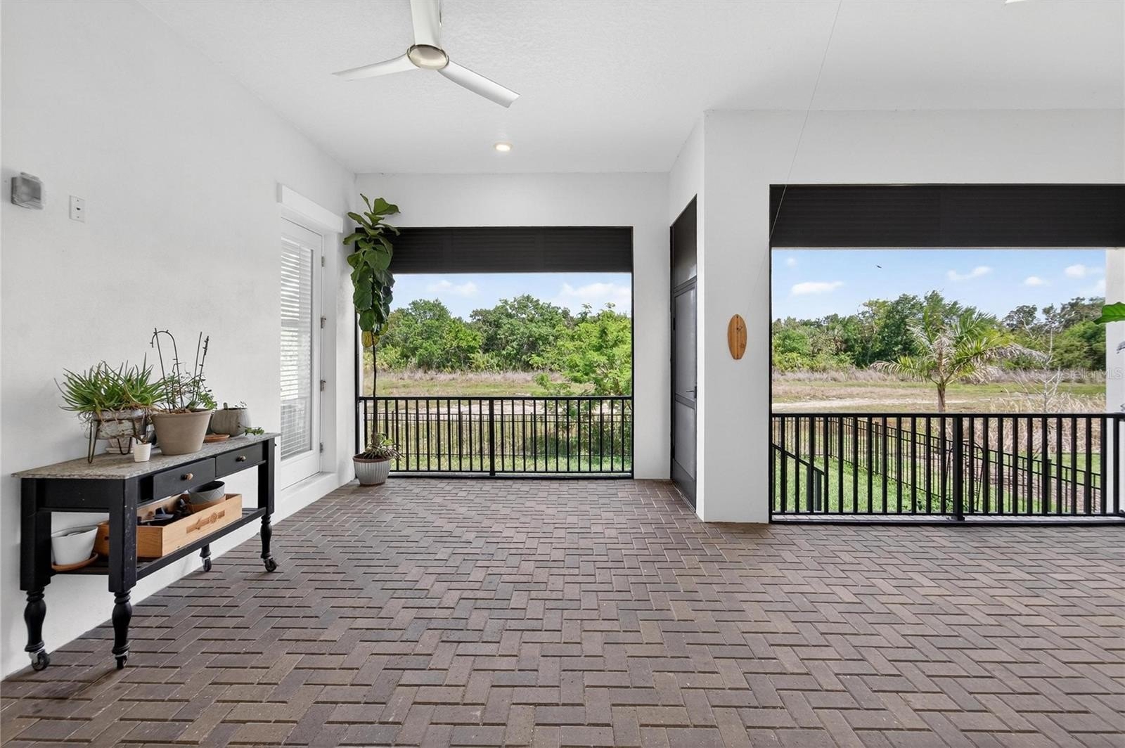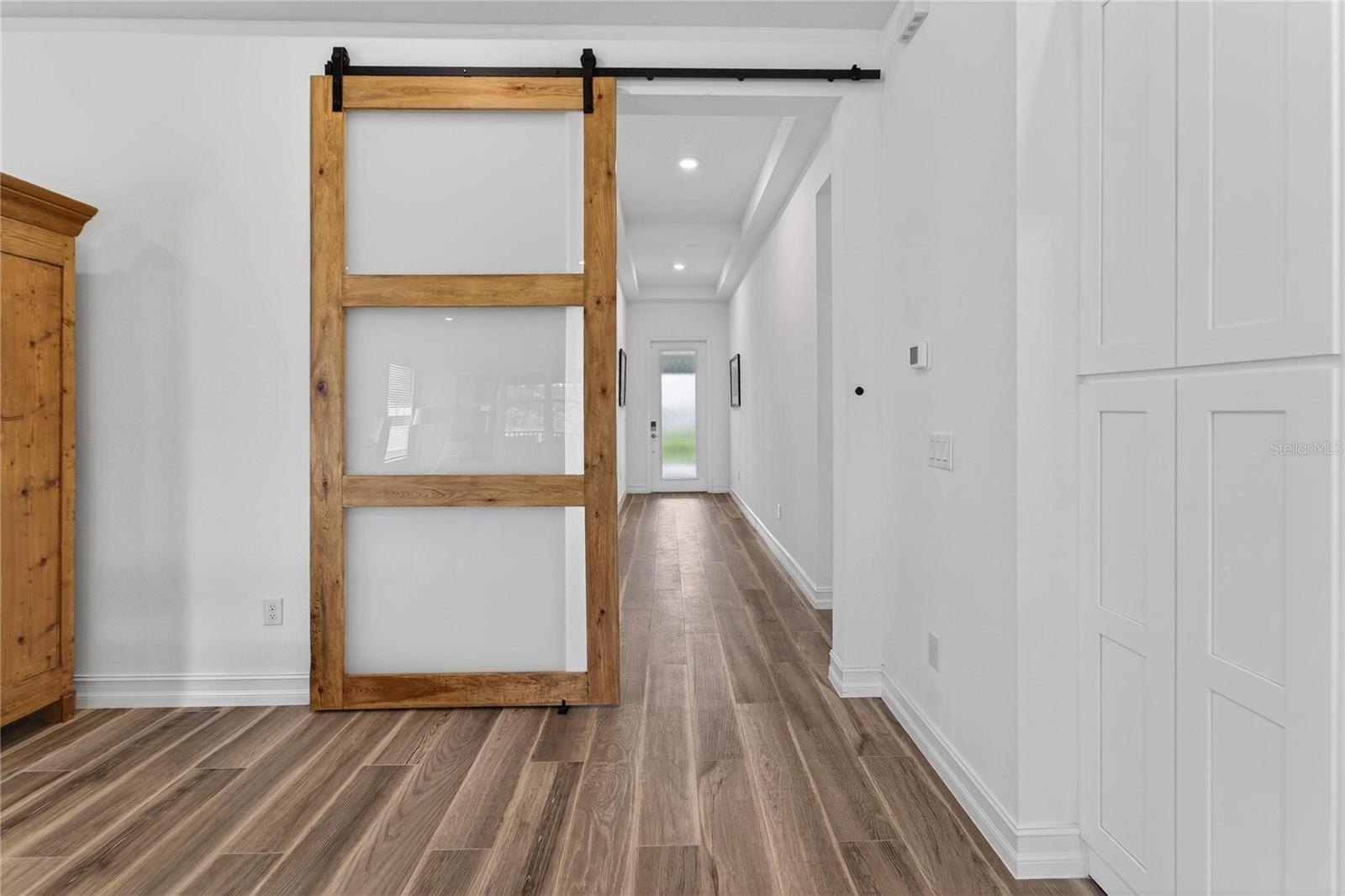 Additional enhancements such as an in-wall pest control system, water softener, and water purification system provide elevated details that support everyday convenience. Large sliding glass doors create a seamless transition between indoor and outdoor living, acting as a defining feature that enhances natural light and flow.