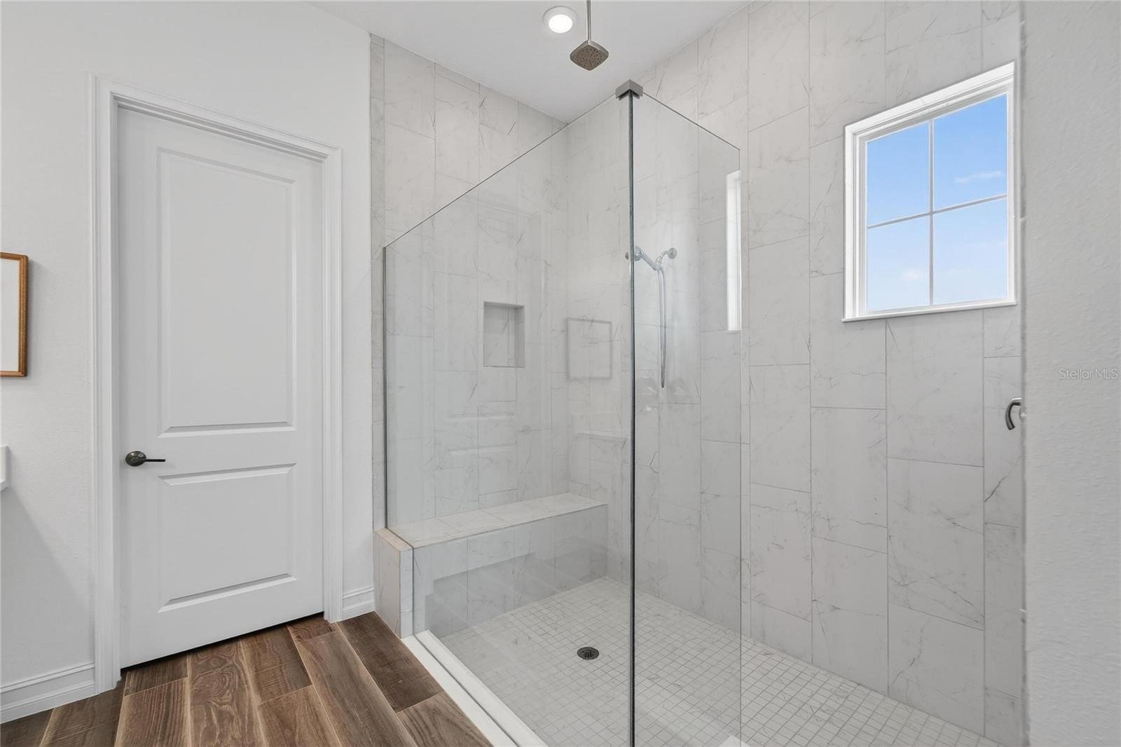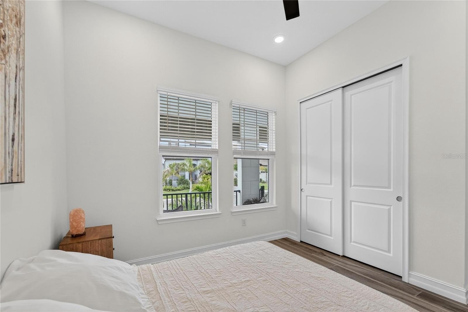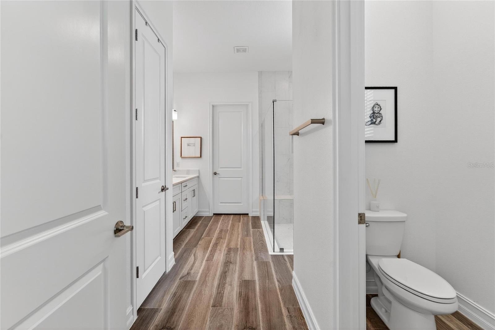 The primary suite is positioned as a private retreat within the split-bedroom design, offering a walk-in closet and a well-appointed en-suite bath. Tray ceilings and recessed lighting act as a subtle design focal point, while cohesive finishes throughout contribute to a clean, modern aesthetic.