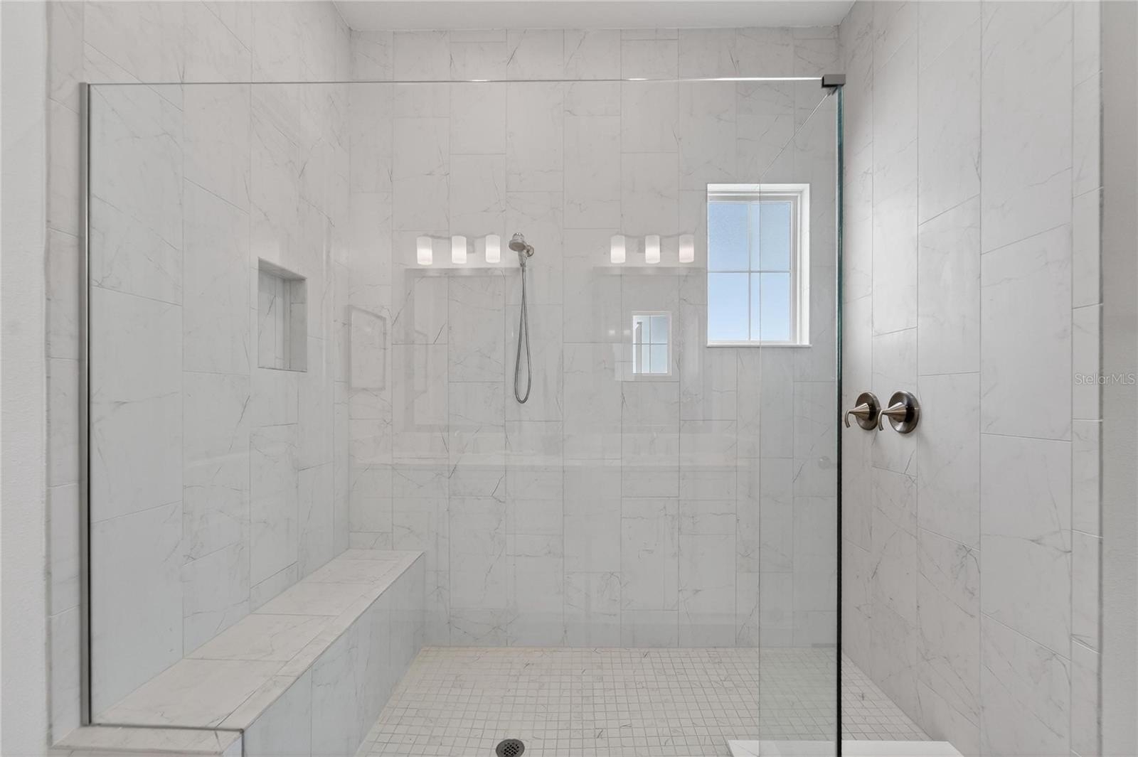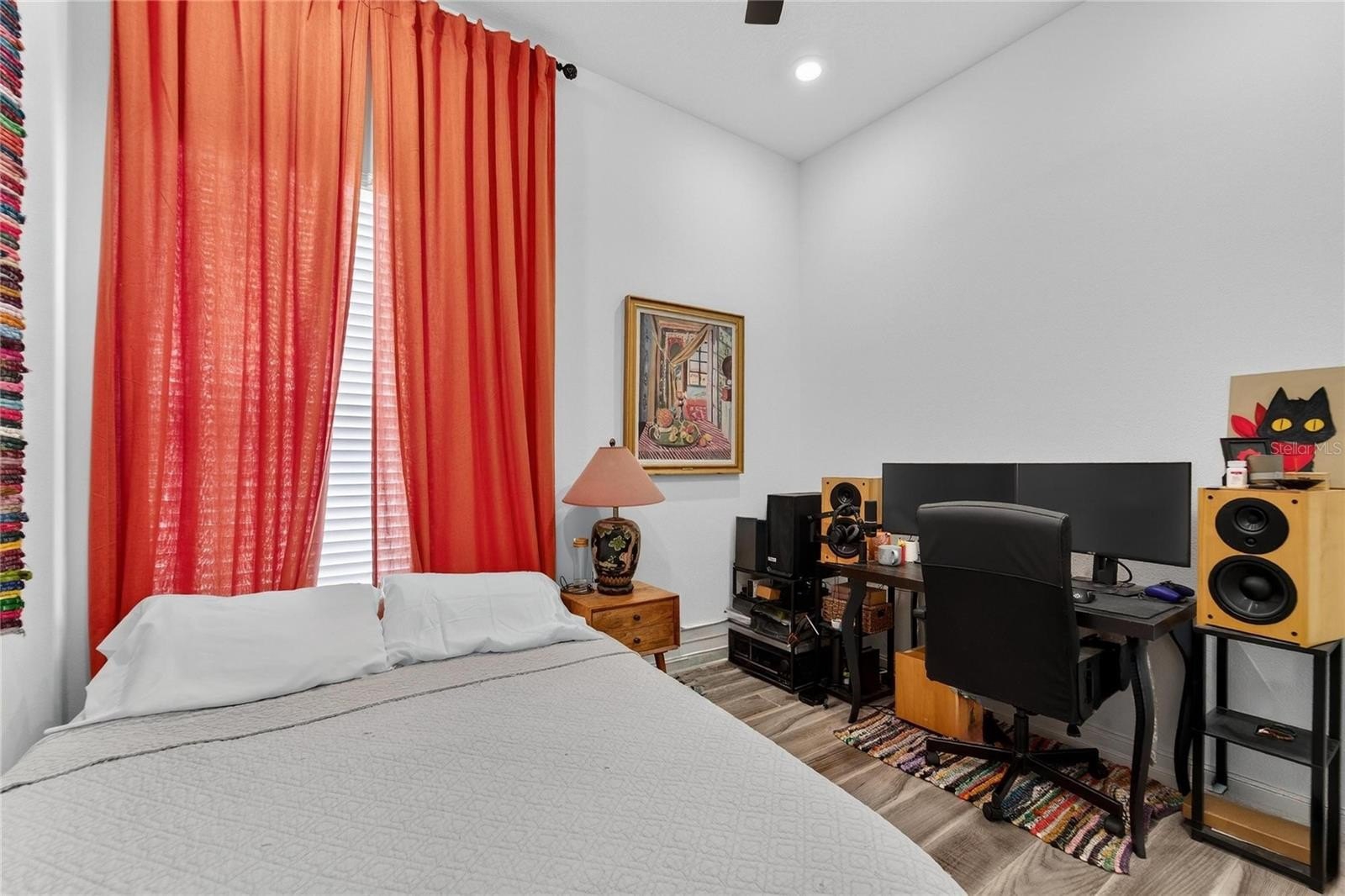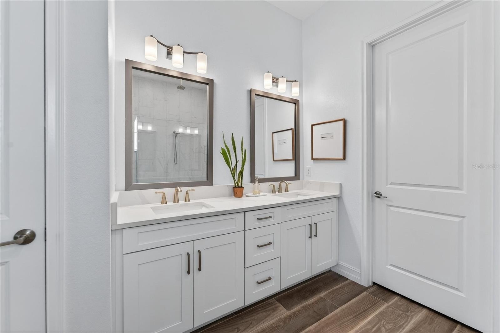 The primary suite is positioned as a private retreat within the split-bedroom design, offering a walk-in closet and a well-appointed en-suite bath. Tray ceilings and recessed lighting act as a subtle design focal point, while cohesive finishes throughout contribute to a clean, modern aesthetic.