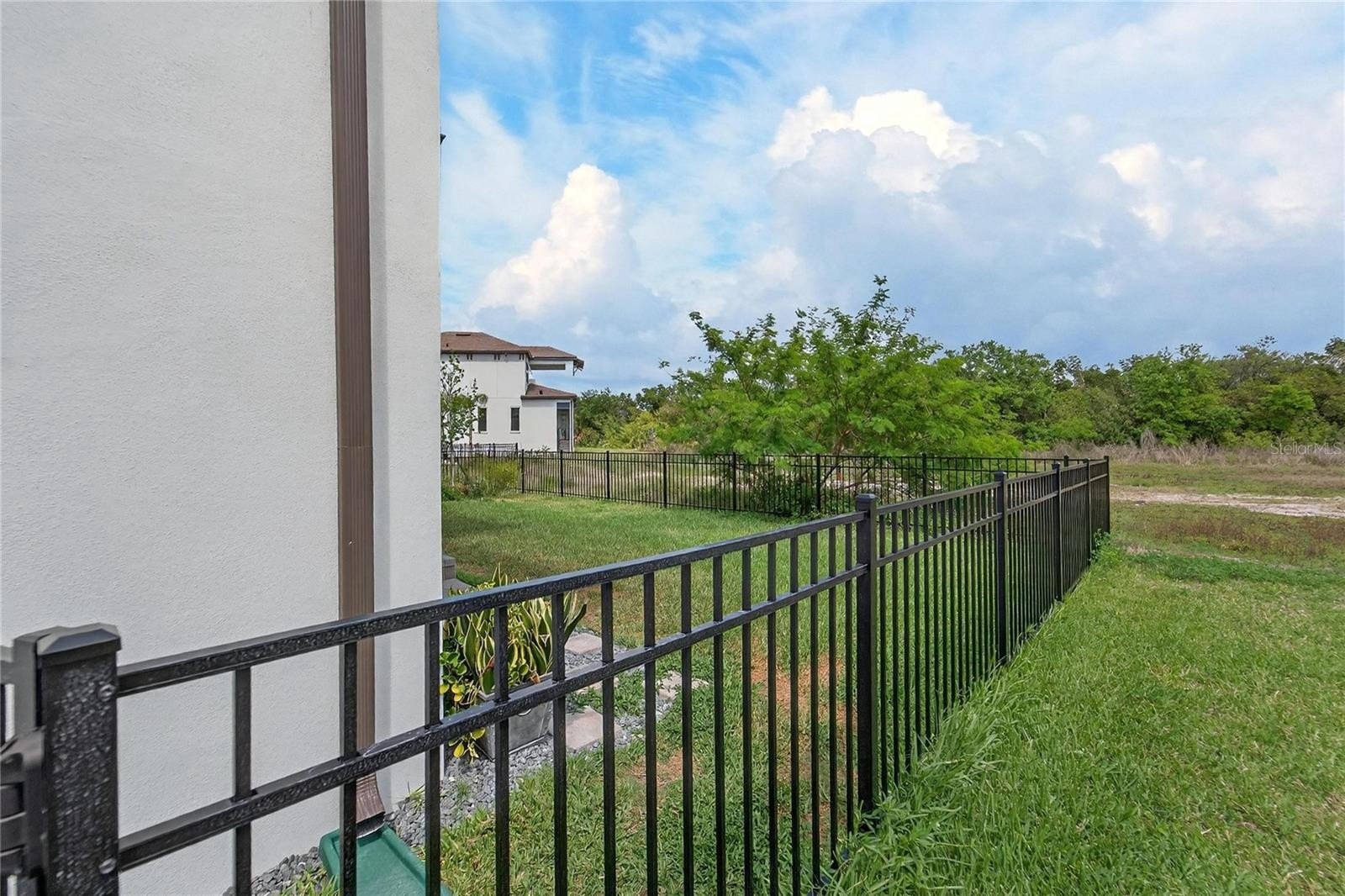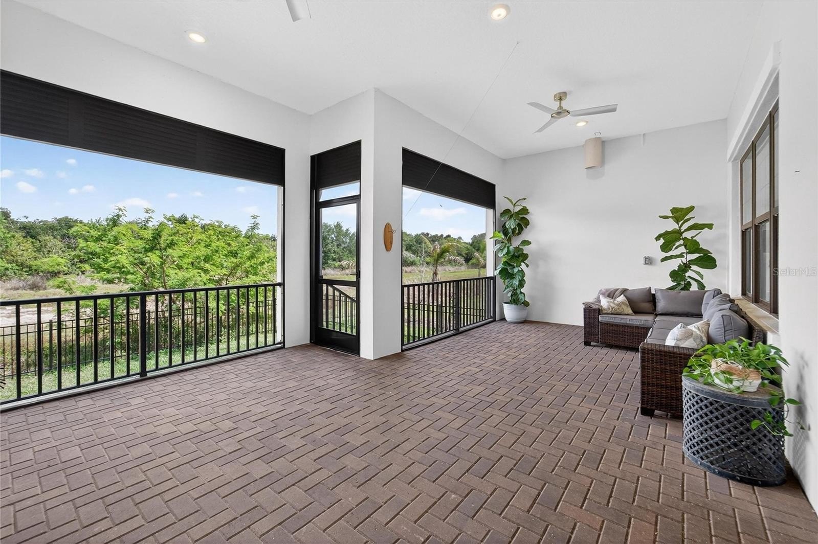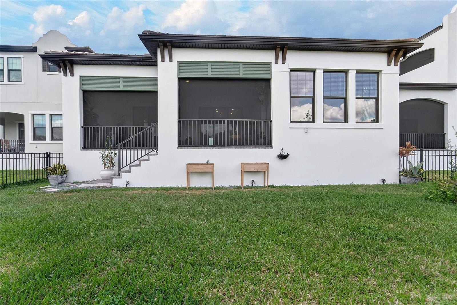 Outdoor living is a standout feature, featuring a covered and screened lanai and a fully fenced backyard, backing to a conservation area that provides added privacy and a natural, open setting. The coastal-inspired exterior presents a strong architectural highlight, complemented by a paver driveway, landscaping, and an elevated entry.