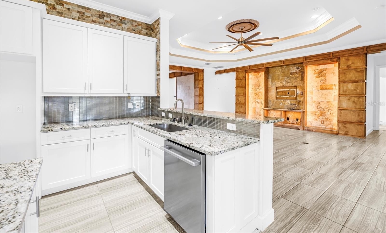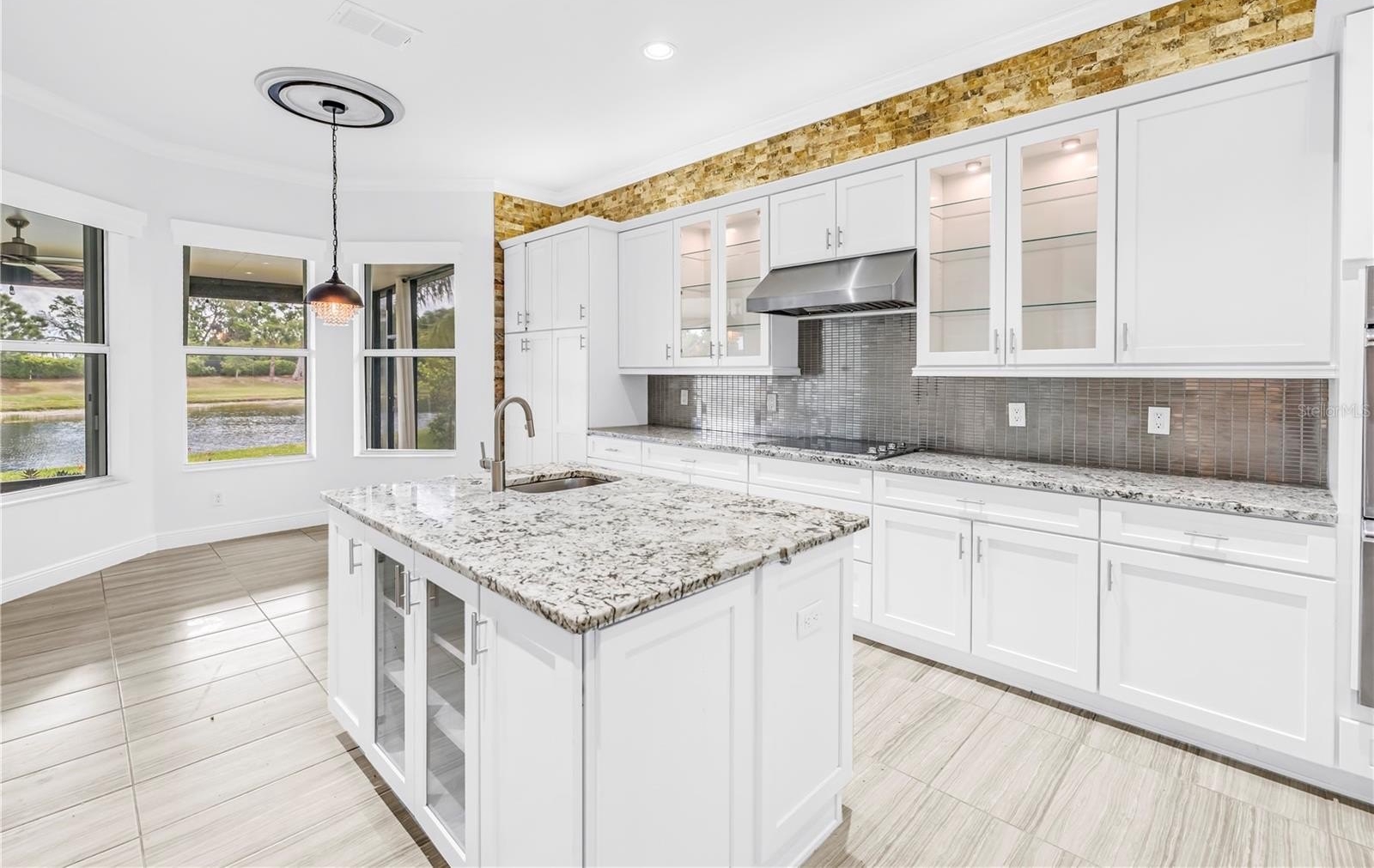 Inside, the home is filled with upscale finishes and custom upgrades, including coffered ceilings, crown molding, designer lighting, custom trim and woodwork, stone accents, built-in closets, and beautiful porcelain tile and luxury vinyl flooring throughout with no carpet. The expansive great room opens seamlessly to the kitchen, casual dining area, and formal dining room, creating an ideal layout for both everyday living and entertaining. A custom wet bar with beverage refrigeration adds another layer of sophistication to the main living space.