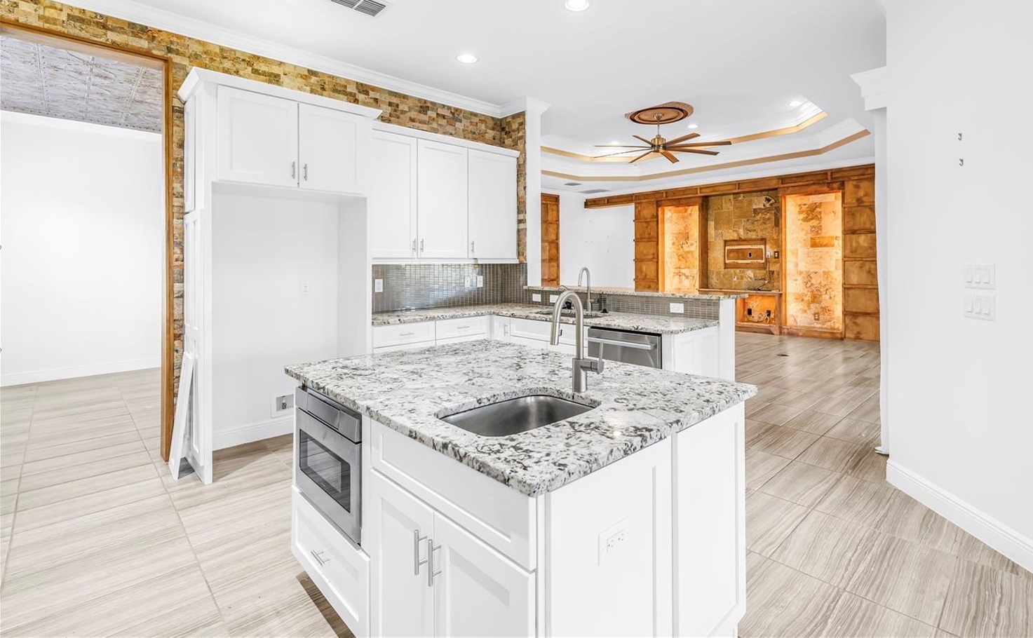 The gourmet kitchen is designed to impress, featuring a large center island with prep sink, granite countertops, a serving bar, 42-inch soft-close white maple cabinetry, designer backsplash, under and over cabinet lighting, pantry storage, and top-of-the-line stainless steel appliances. The formal dining room offers distinctive character with custom barn doors, decorative ceiling details, and accent walls that make the space feel both elegant and inviting.