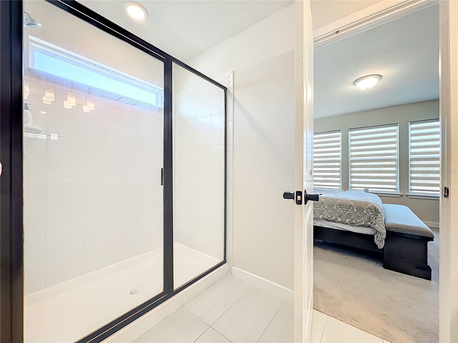Upstairs, all bedrooms are privately situated with plush carpeting throughout. The primary suite includes a walk-in closet and an ensuite bath with dual sinks, a tiled walk-in shower with frameless glass enclosure, and a private water closet. Two additional bedrooms have built-in closets and share a full bathroom with a tiled tub and shower combination.