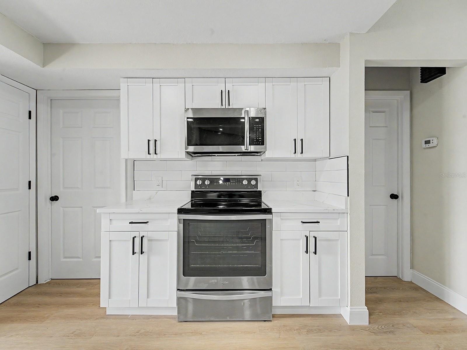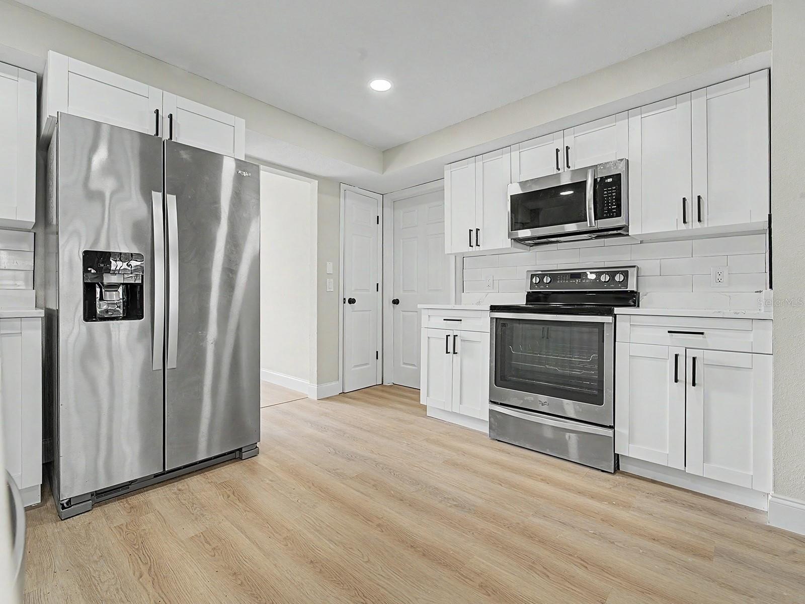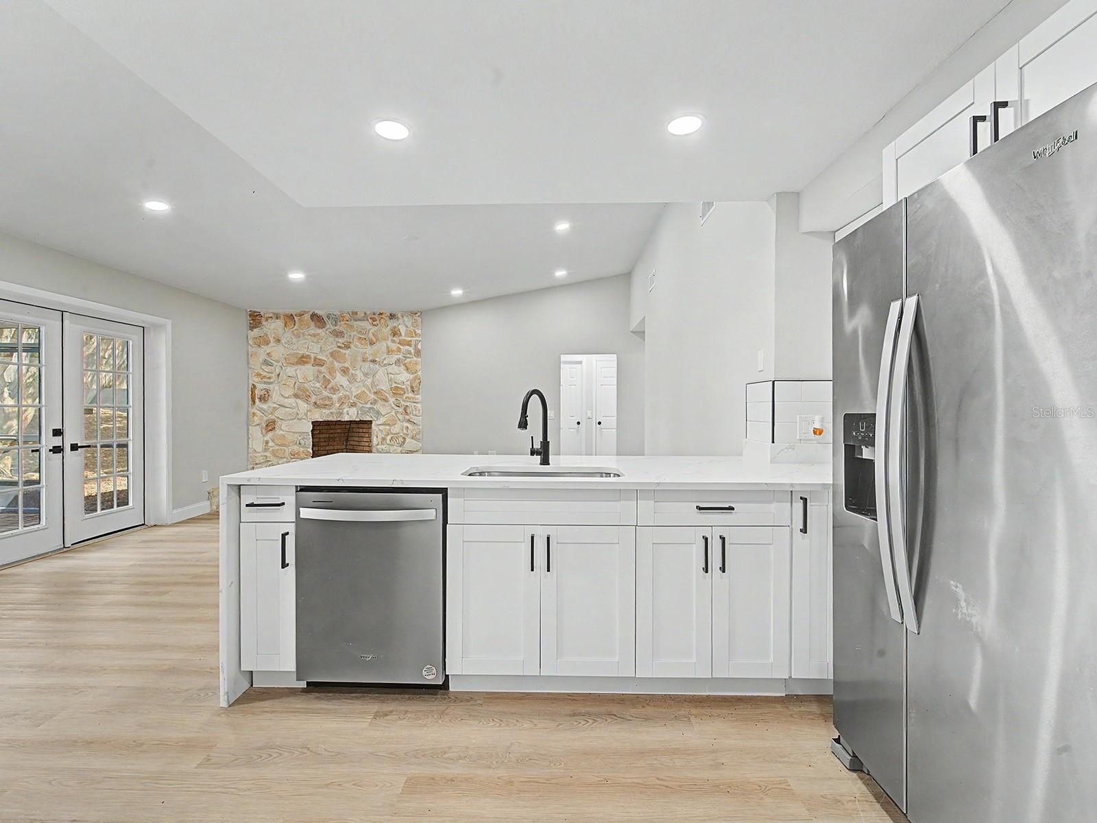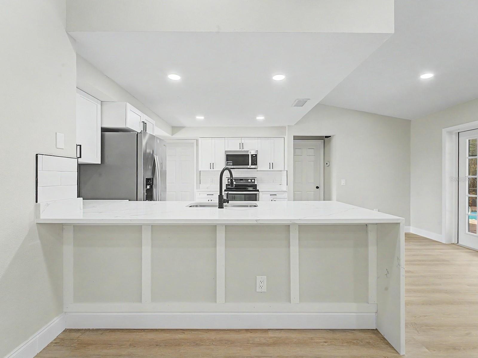 This move-in ready home has been fully updated, featuring fresh interior and exterior paint and luxury vinyl flooring throughout. The modern kitchen offers quartz countertops, a stylish backsplash, included appliances, and is complemented by additional built-in cabinetry and a secondary sink just off the kitchen, providing a versatile space ideal for prep, storage, or potential laundry use.