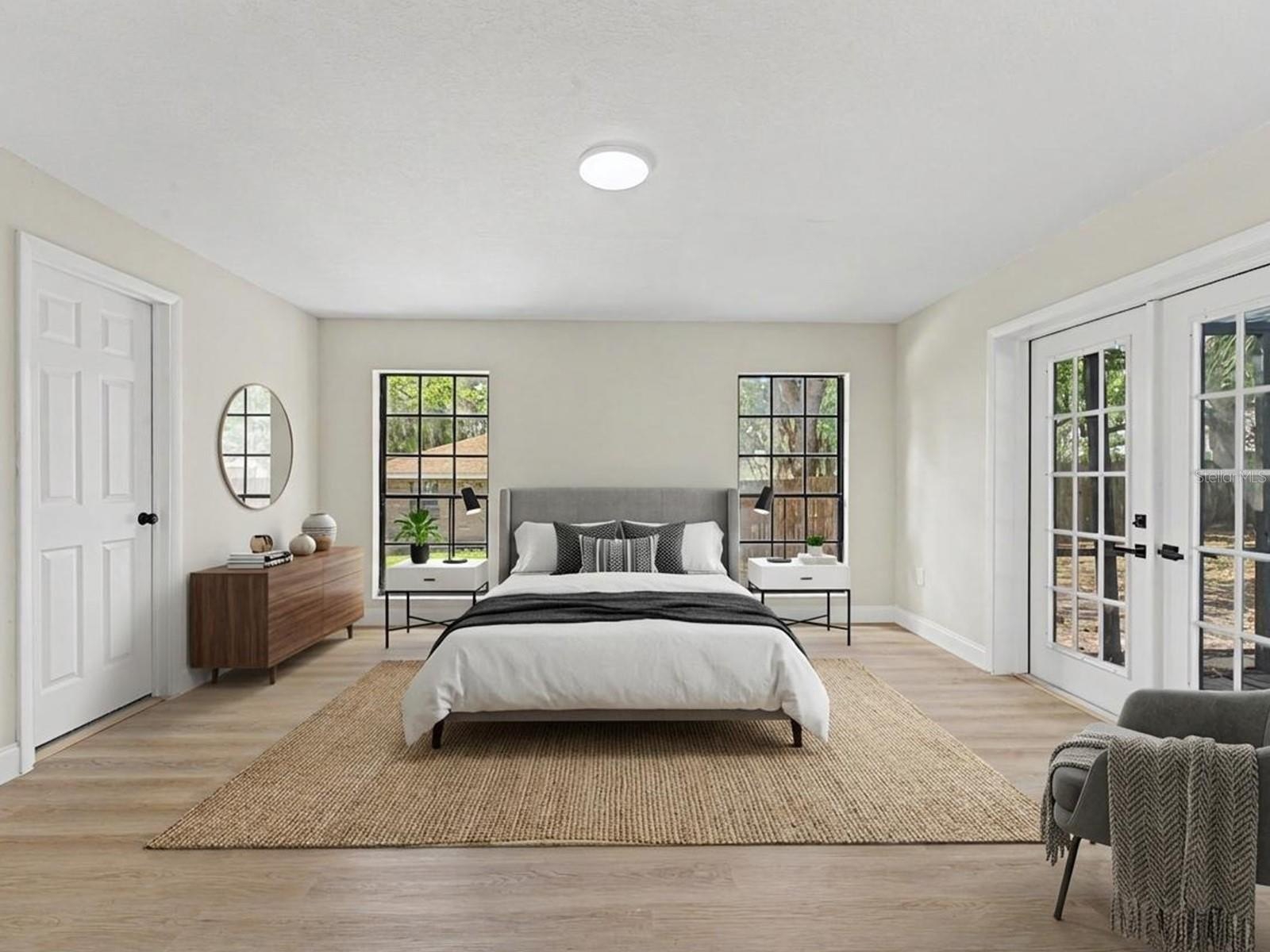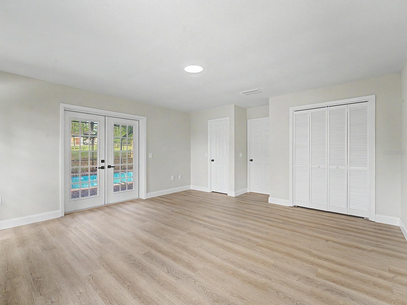 The spacious primary suite includes an ensuite bathroom with tile finishes, dual vanity, and French doors leading directly to the screened-in pool area. The living room also features French doors that open to the outdoor space, creating a seamless indoor-outdoor flow ideal for entertaining.