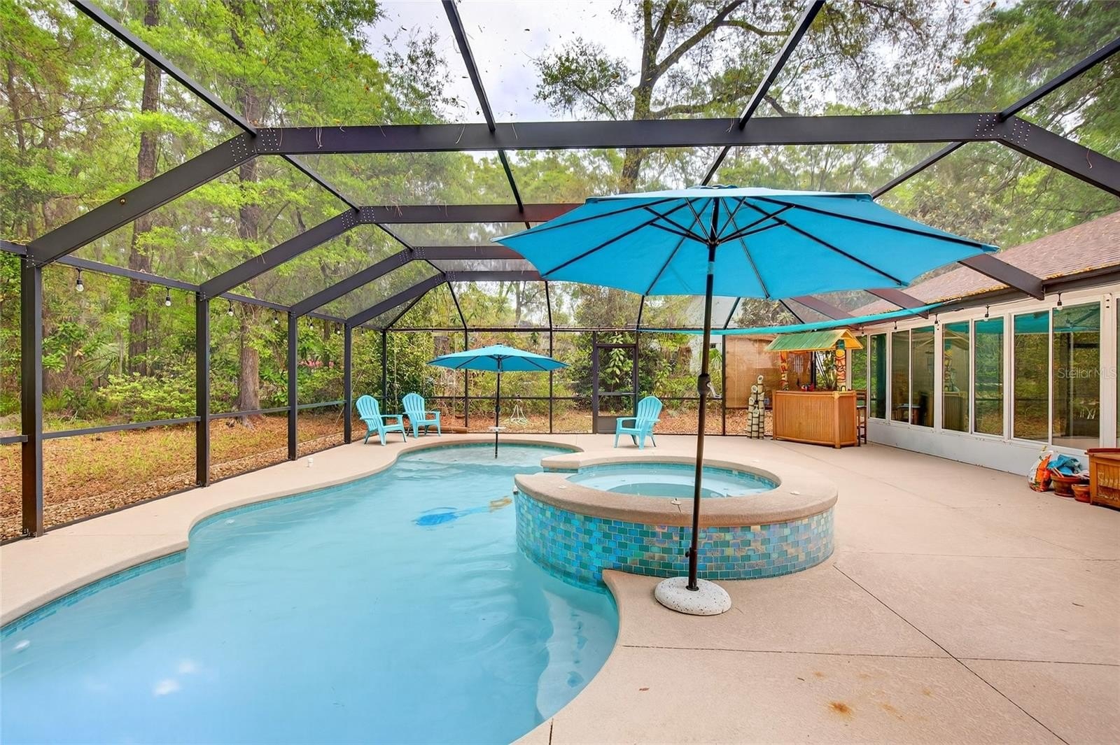 thoughtfully designed layout opens to a screened in pool oasis, complete with a hot tub for relaxation and equipped with a swim jet, this heated pool is transformed this into an "endless" lap pools by creating a continuous current to swim against. Maintenance is made easier with and automated pump (built in 2021)— perfect for year round enjoyment and effortless entertaining.