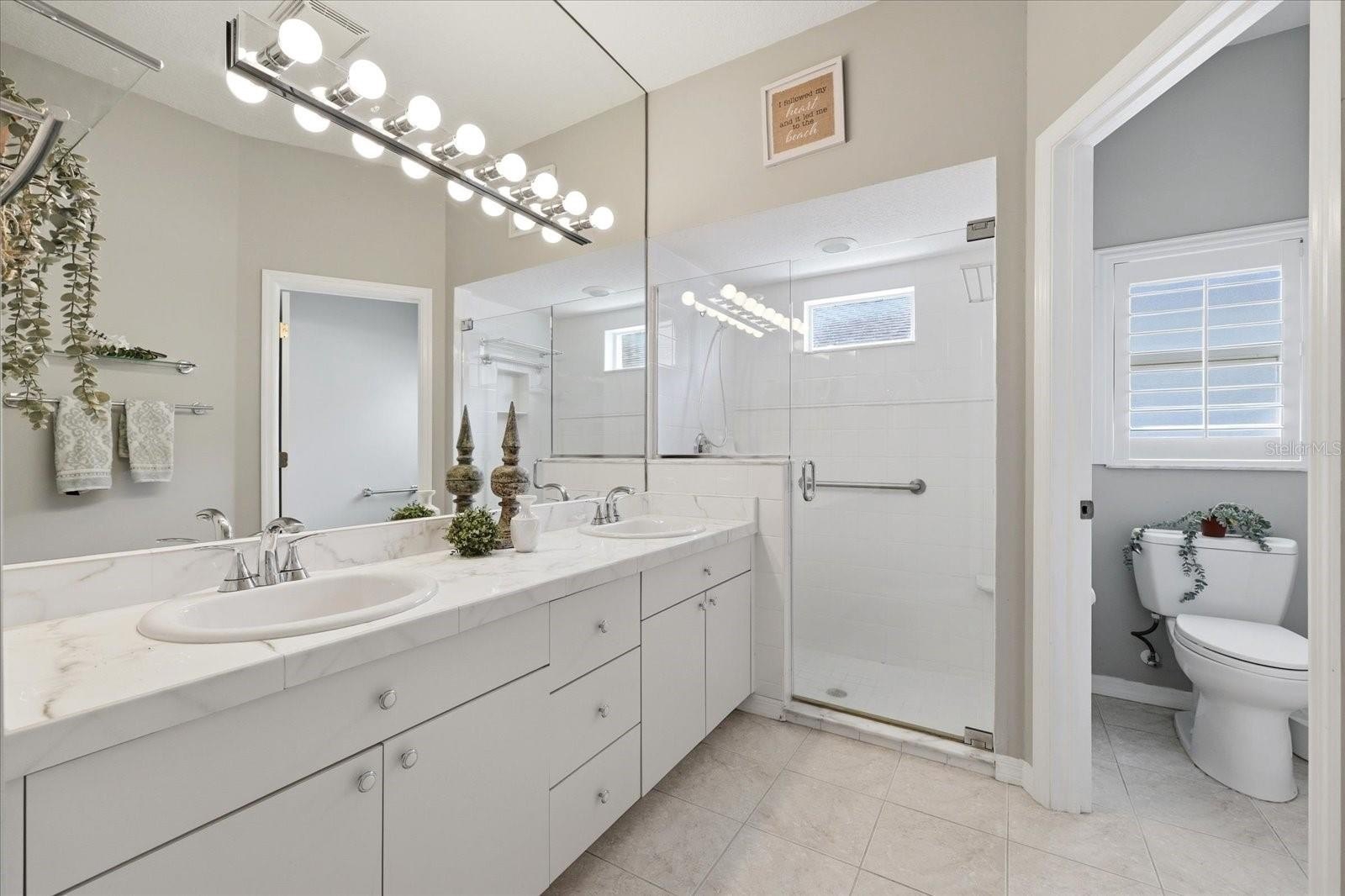 The primary suite is a true retreat, featuring a spacious bedroom and an en-suite bathroom with plenty of storage to keep everything organized.