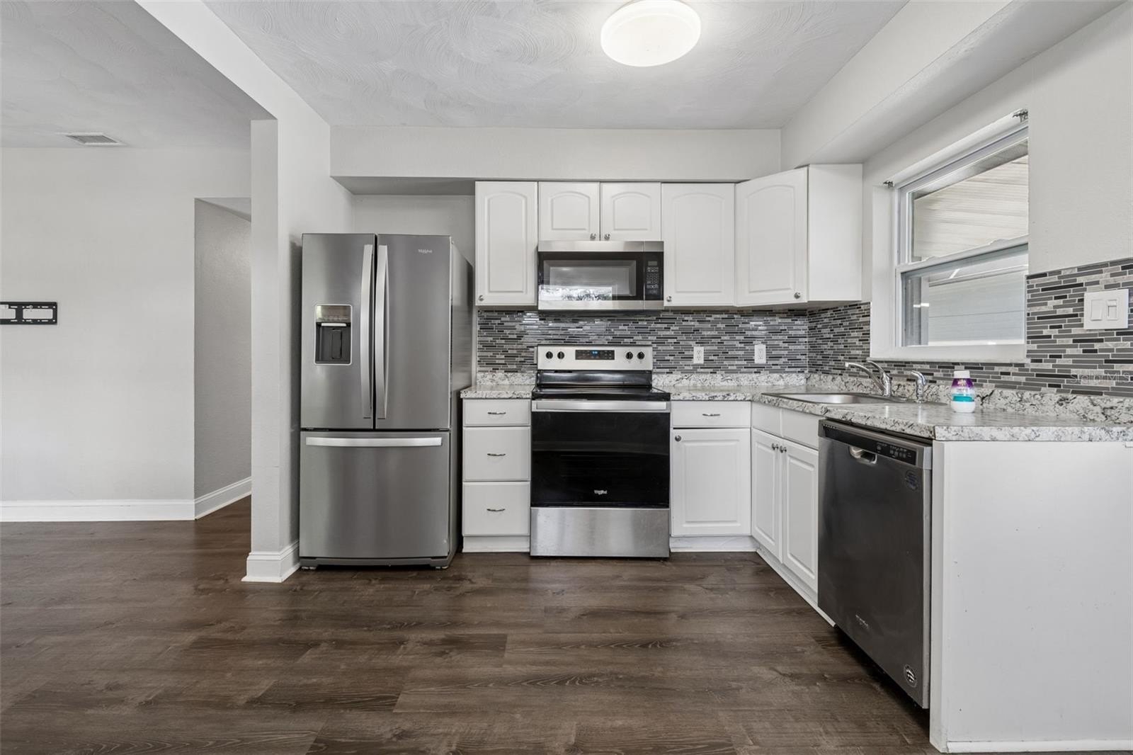Welcome to this move-in ready 3-bedroom, 1-bath home offering comfort, functionality, and a spacious fully fenced yard in a convenient Tampa location. This property features a bright open layout with durable wood-look flooring throughout, neutral interior finishes, and abundant natural light. The kitchen offers white cabinetry, stainless steel appliances, modern backsplash, and ample counter space, opening seamlessly to the main living and dining areas, creating an ideal space for everyday living and entertaining.