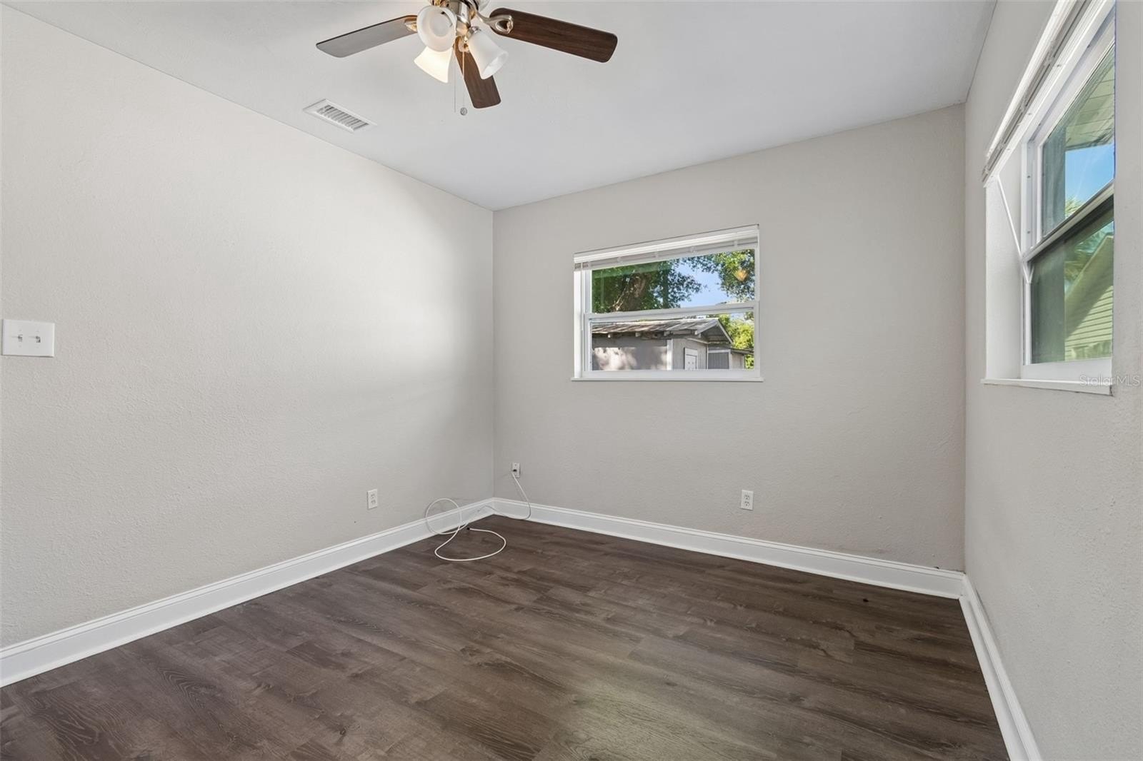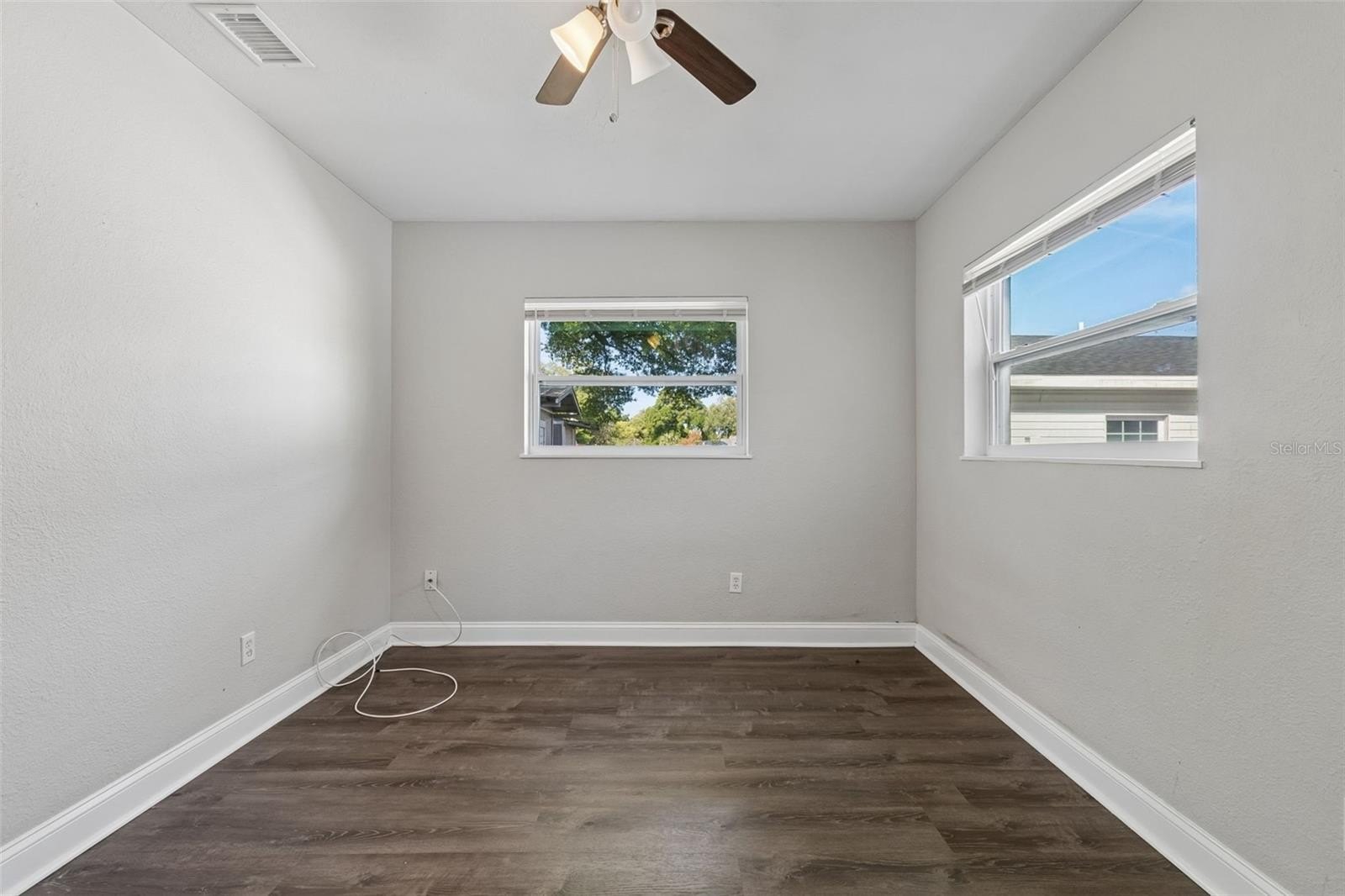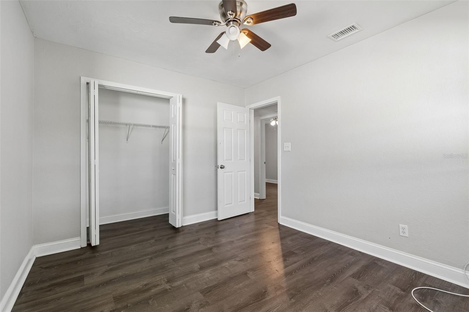 The home offers three well-proportioned bedrooms with ceiling fans, consistent flooring, and generous closet space. The bathroom features clean finishes and a functional layout. The interior provides a cohesive, low-maintenance feel throughout the home.