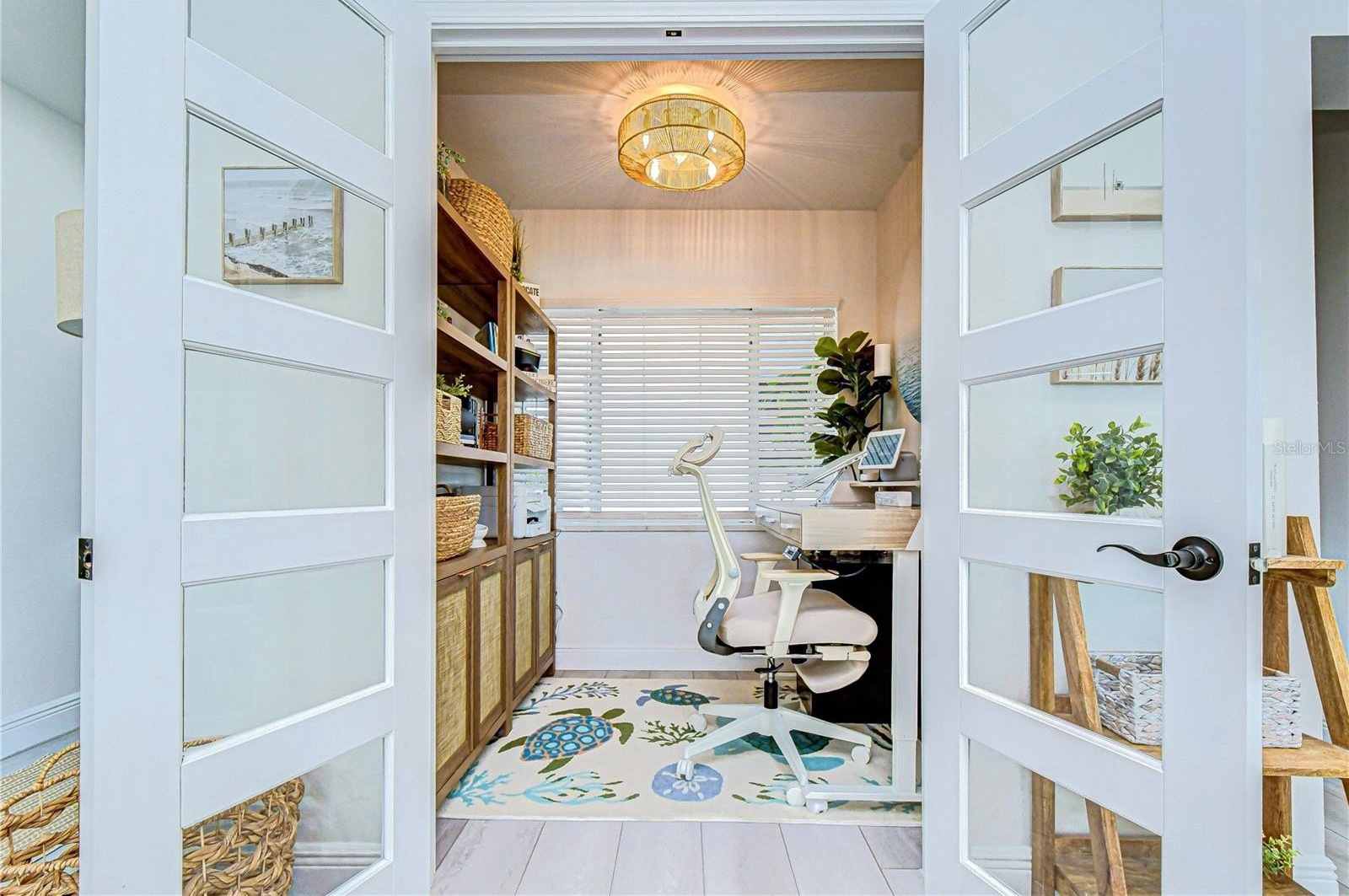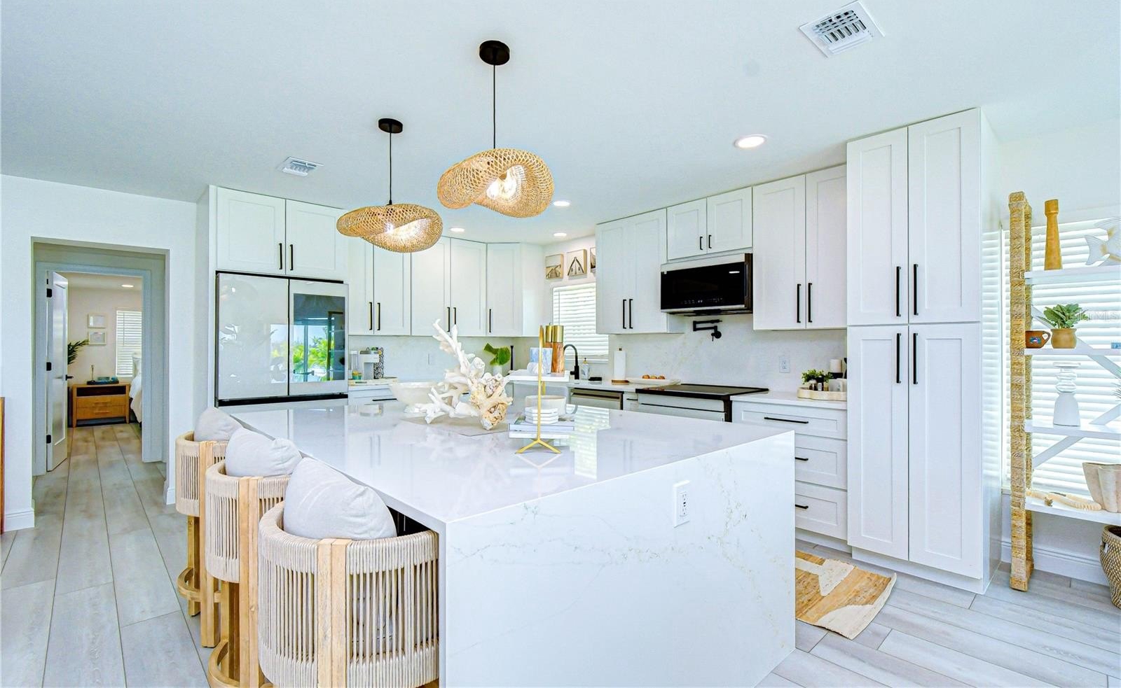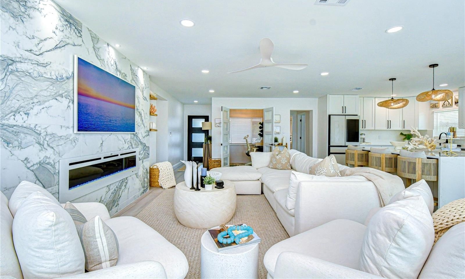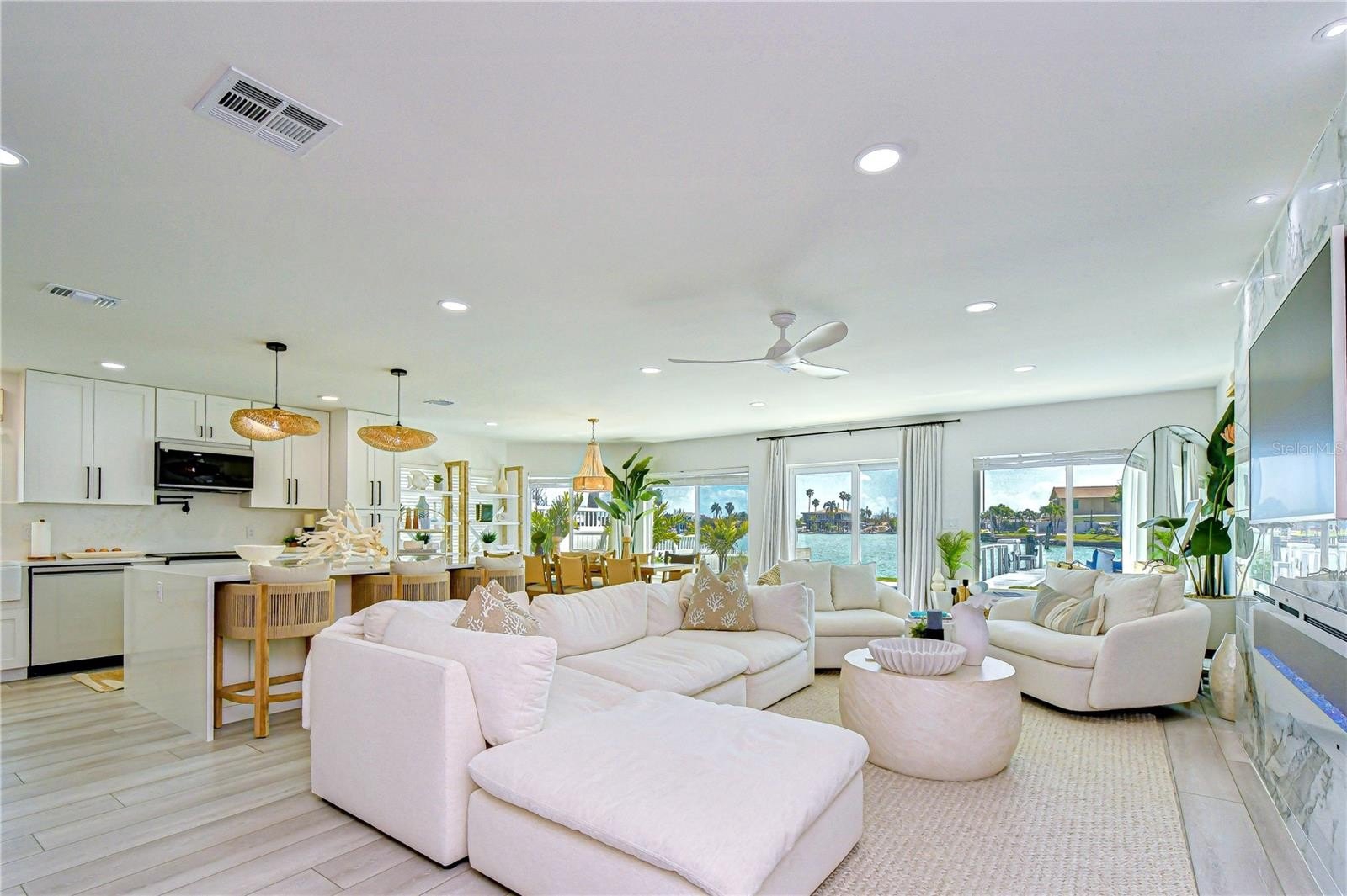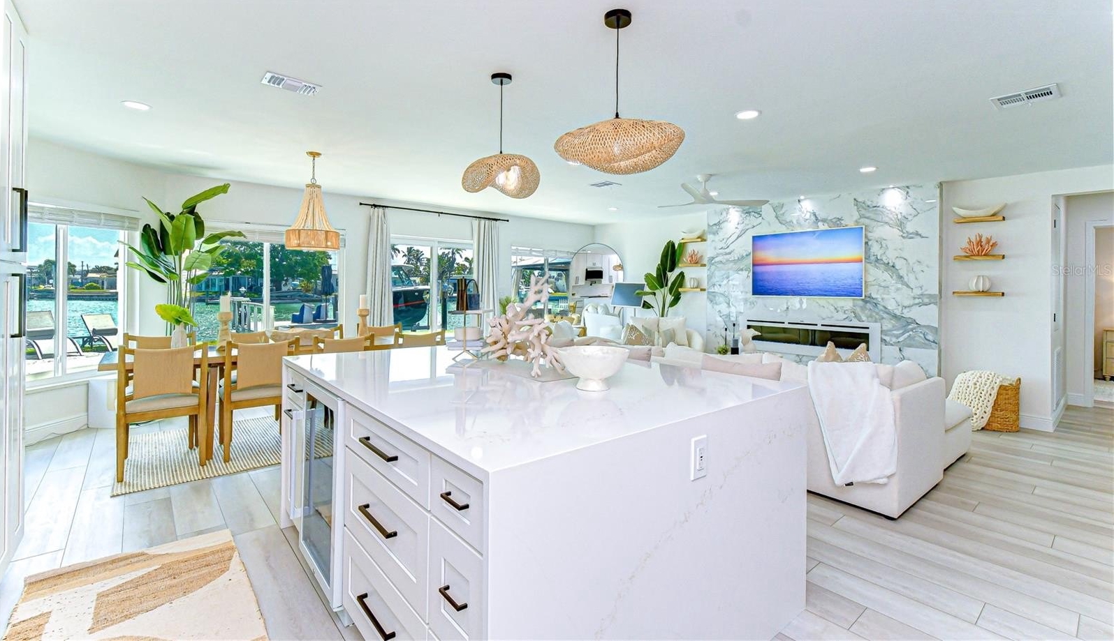 At the heart of the home, the designer kitchen showcases quartz countertops, custom bright cabinetry, a center island with seating, and stainless-steel appliances—ideal for everyday living and entertaining. Warm wood accents, curated coastal lighting, and refined finishes add depth and character, while expansive windows and sliding glass doors create a seamless connection to the waterfront. The open great room is a true showpiece, anchored by a dramatic floor-to-ceiling marble feature wall with a sleek linear fireplace, creating a focal point. Soft coastal tones and generous seating invite relaxation, while walls of glass frame serene water views and fill the space with natural light. The adjoining dining area is perfectly positioned to capture the view, completing the home’s indoor-outdoor flow.