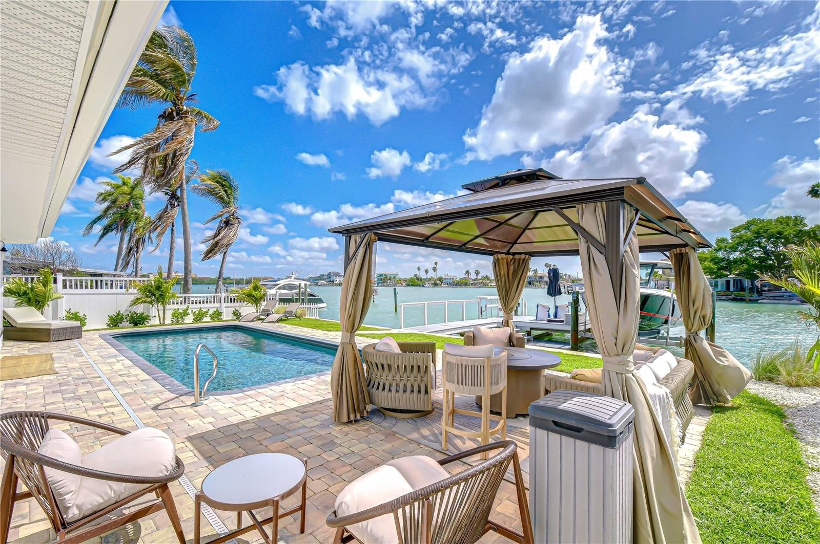 Step outside to your private waterfront oasis, where beautifully designed outdoor living spaces invite relaxation and entertaining. A sparkling pool is surrounded by expansive paver decking, offering multiple areas to lounge, dine, and enjoy the coastal breeze. A covered gazebo creates the perfect shaded retreat for morning coffee or evening cocktails, set against wide water views and swaying palms. The lush lawn and thoughtfully landscaped grounds add privacy and charm, enhancing the home’s resort-style ambiance.