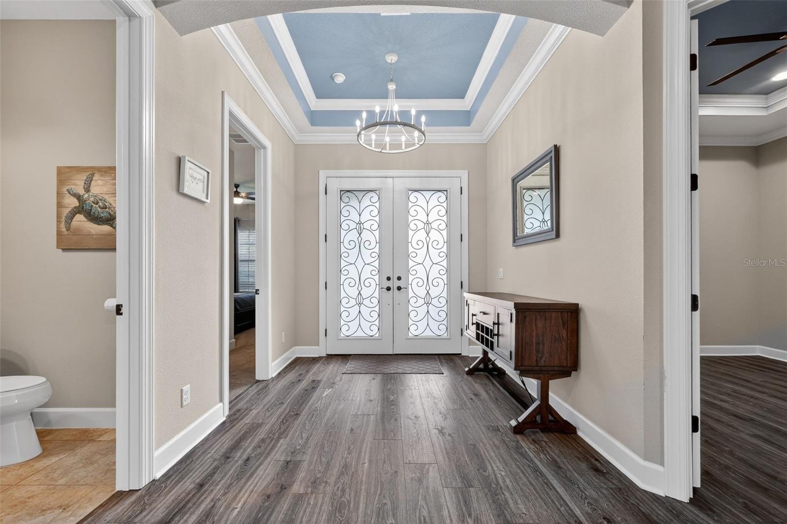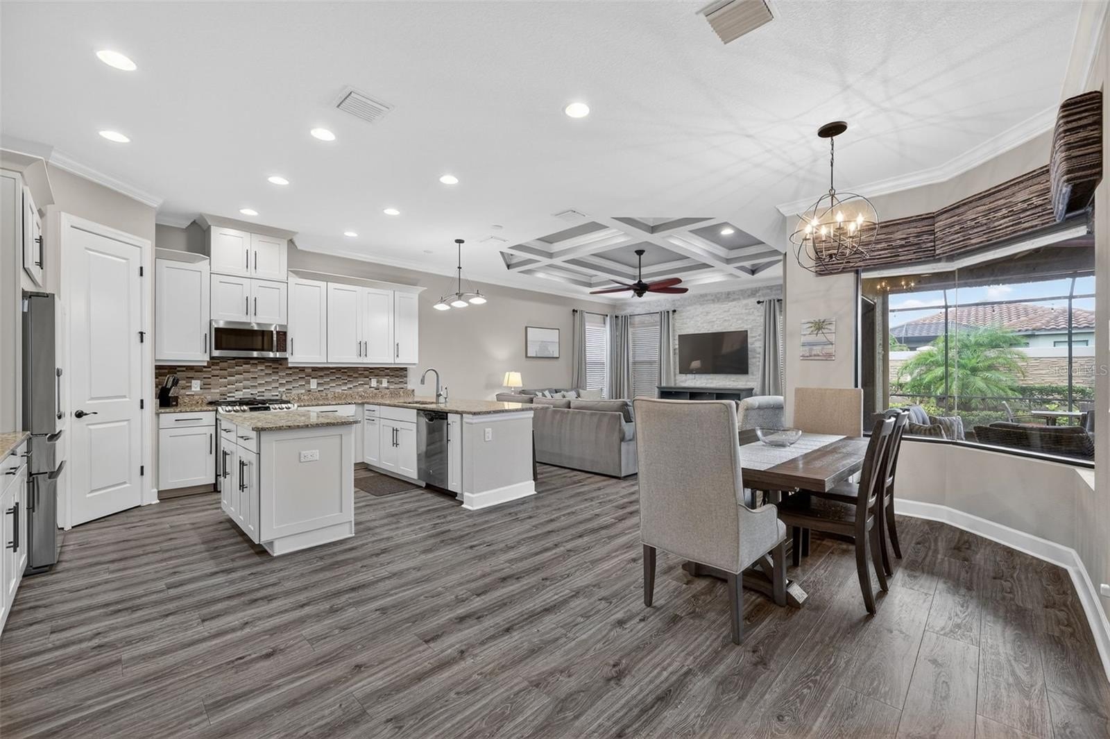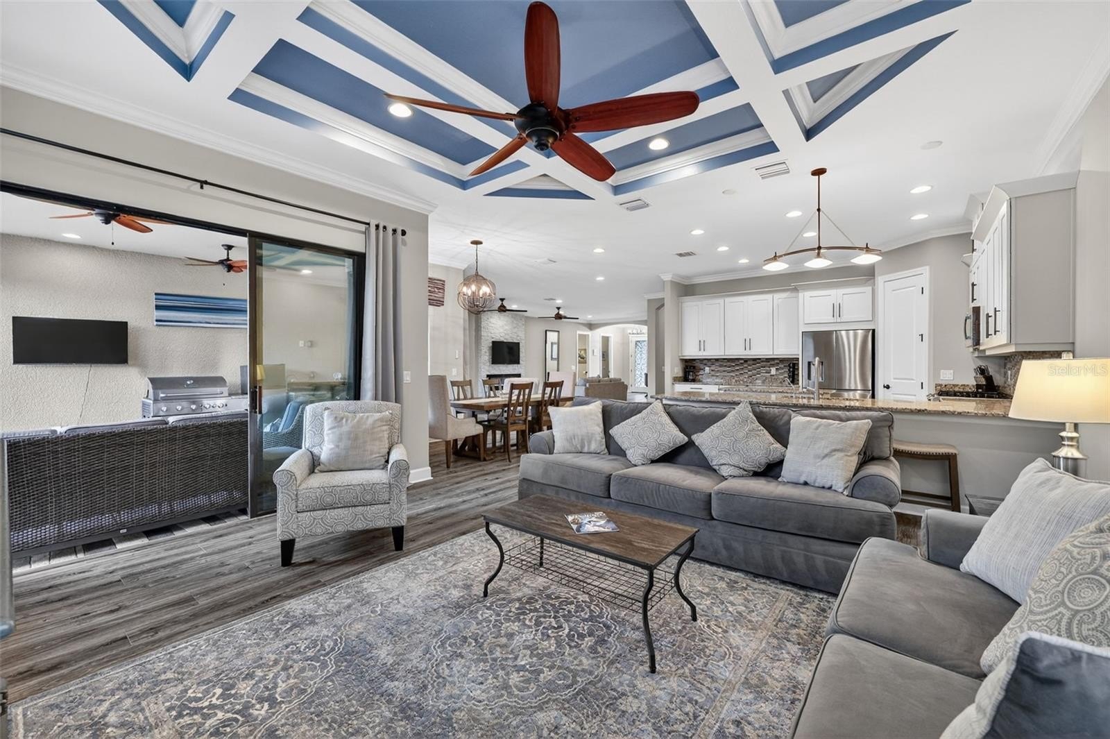 THIS IS A GOLF DEEDED HOME! TURNKEY!! Welcome to 5010 Tivoli Run, an elegant 3-bedroom, 3 full bathroom and half bath single family home with a den, offering nearly 3,000 square feet of thoughtfully designed living space. From the moment you enter, you are greeted by 10 ft ceilings, 8 ft doors, coffered ceilings, and crown molding that create a sense of openness and sophistication throughout. The home features multiple living spaces including a formal living area, family room, and dining room, ideal for both entertaining and everyday living. The living room showcases a striking stone accent wall with a fireplace, while the family room mirrors this design with its own stone feature wall, adding warmth and visual continuity. The main living areas are finished with wood laminate flooring, complemented by tile in the bathrooms and plush carpet in the guest bedrooms. The primary suite offers a refined retreat with wood laminate flooring and a spacious ensuite bath featuring dual sinks with a built-in make-up vanity, a relaxing garden tub, and a separate shower along with custom closets. Step outside to a spacious screened lanai complete with an outdoor kitchen, perfect for hosting gatherings or enjoying quiet evenings. One side of the lanai is fenced, offering additional flexibility for privacy or pets. This 3-bedroom single family home at 5010 Tivoli Run combines elegant design elements, functional living spaces, and inviting outdoor features to create a refined and comfortable lifestyle. Esplanade offers a wide array of amenities and activities such as an 18-hole championship golf course, two resort pools, hot tubs, resistance pool, pickleball, tennis, bocce ball, two fitness centers, exercise classes, two dog parks, firepit, spa/salon, an on-site lifestyle director, social events, and various clubs plus a Tiki bar. The state-of-the-art Culinary Center offers residents several dining options such as the Barrel House as well as wine tastings, and special events.