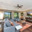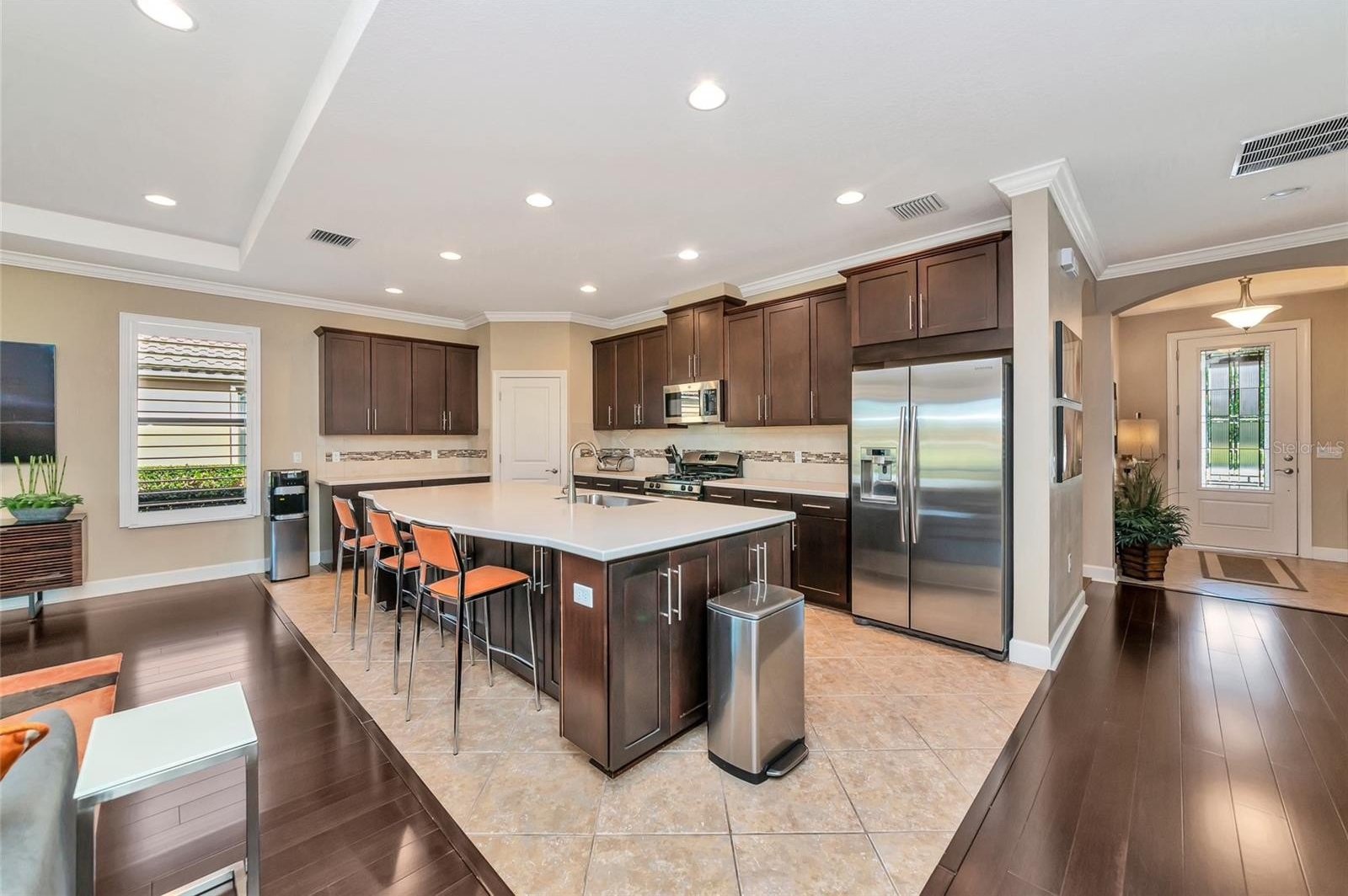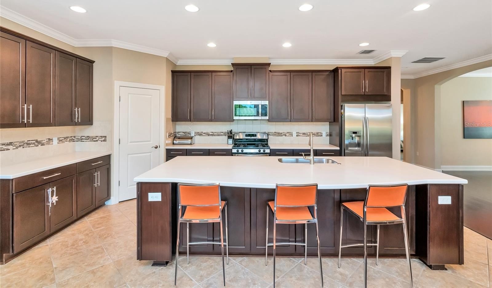 The kitchen sits at the center of the home with solid wood cabinetry, Corian countertops, a large island, stainless appliances, and a large pantry. It opens directly to the main living space and out to the lanai, keeping everything connected.