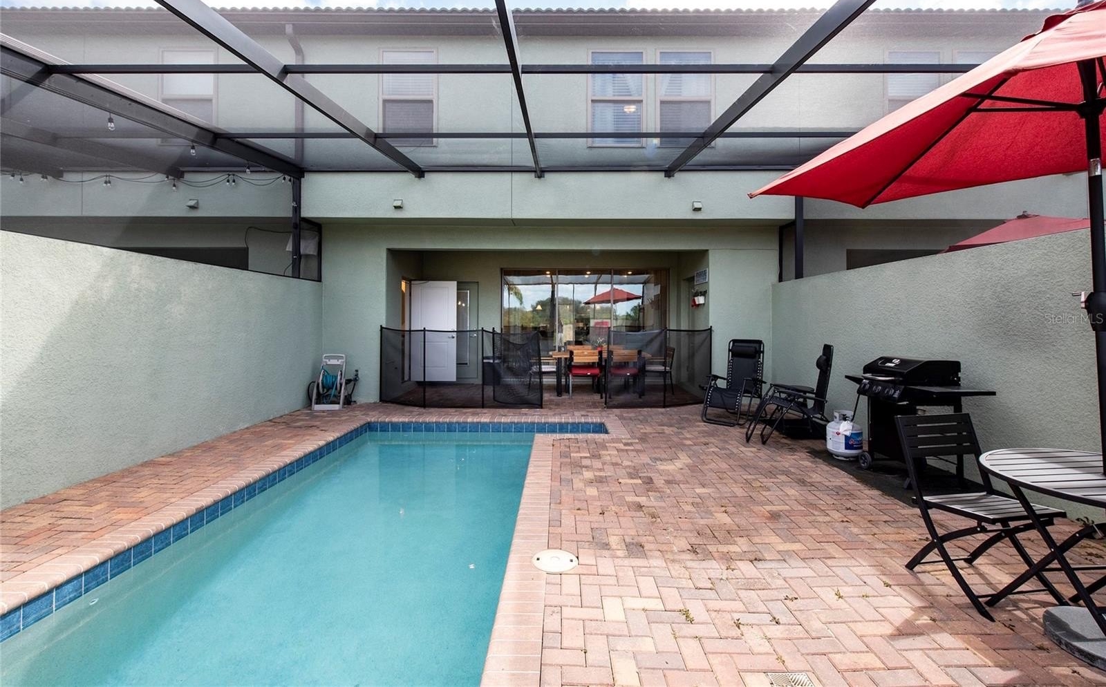 Enjoy a covered patio and private pool with pond views, providing both privacy and a relaxing outdoor setting.