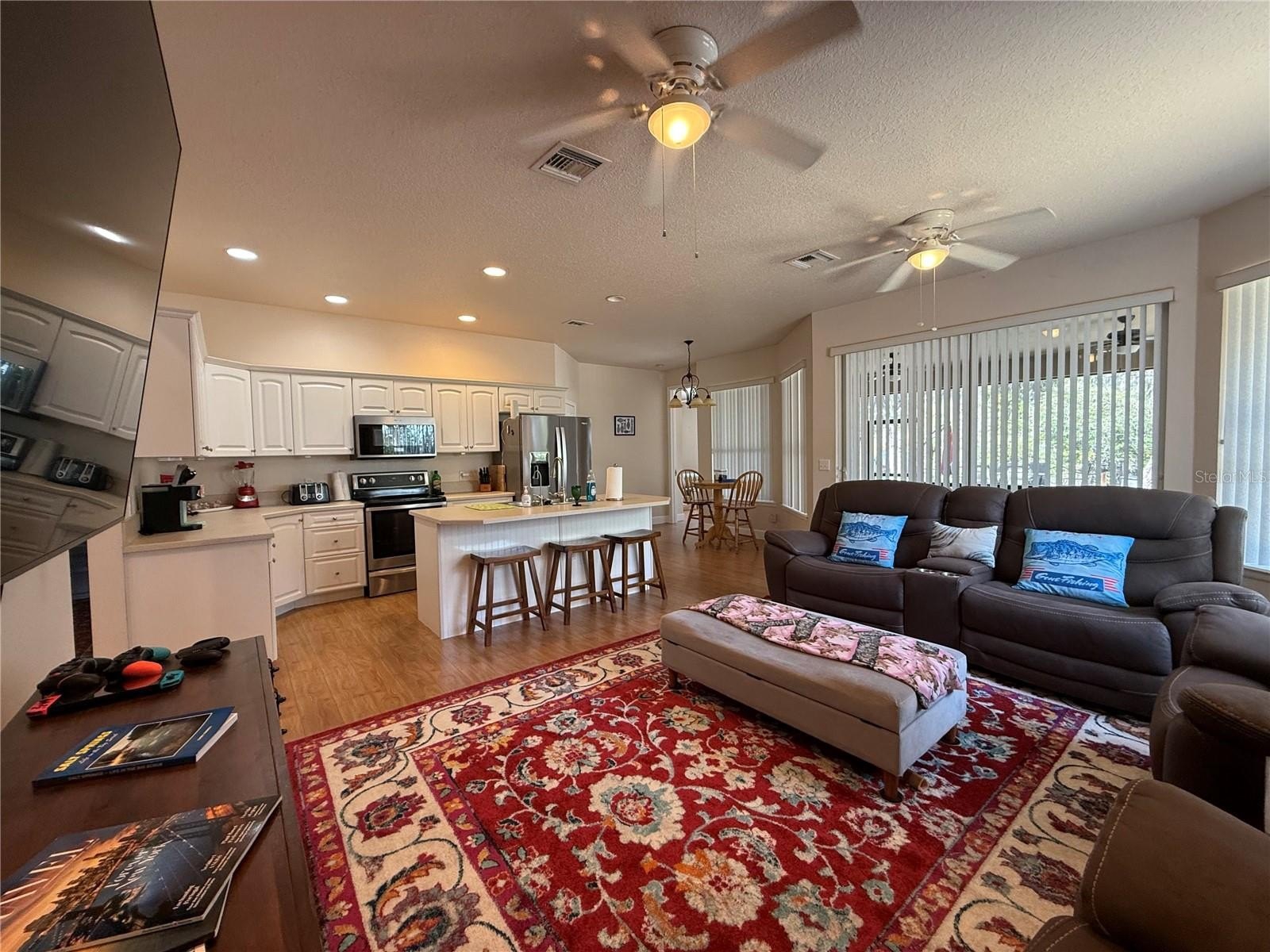 The thoughtfully designed interior offers a wealth of space for large families or those seeking a versatile getaway. The main floor features a formal dining room—complete with a large extendable table and the home’s unique conversation piece, "Buffy the Buffalo"—which flows into a fully equipped, open-concept kitchen and family room. Chef-ready and perfect for entertaining, the kitchen boasts stainless steel appliances, a center island for extra seating, a walk-in pantry, and a breakfast nook. The main level also hosts a dedicated home office with an adjustable standing desk, a laundry room, and three generous bedrooms. The primary suite serves as a true sanctuary, offering a king-sized bed, private lanai access, and a spa-like en suite featuring a soaking tub, separate shower, and a high-end Japanese bidet toilet with a heated seat.