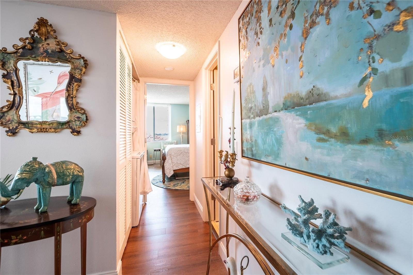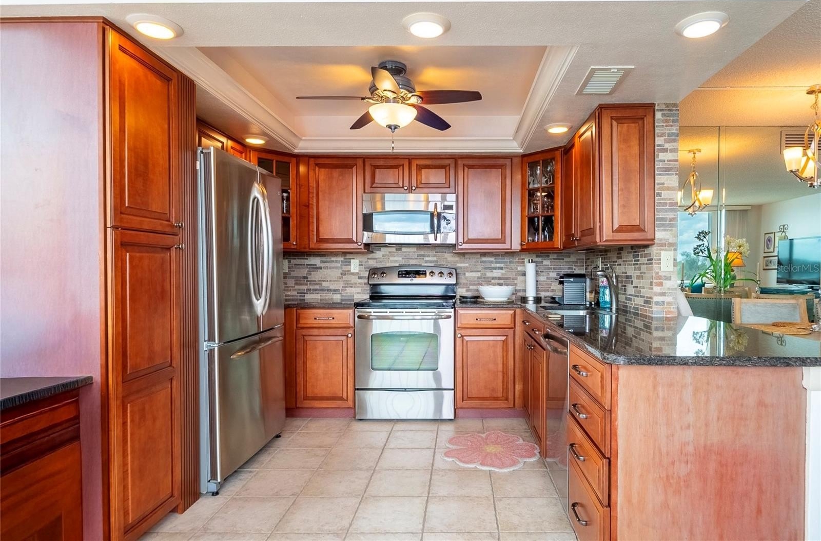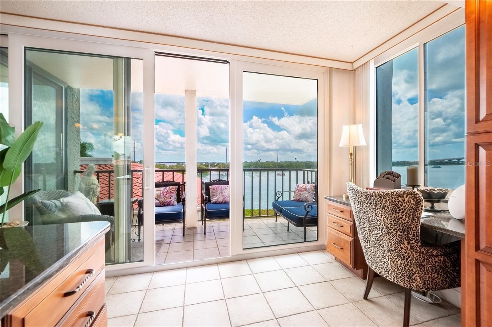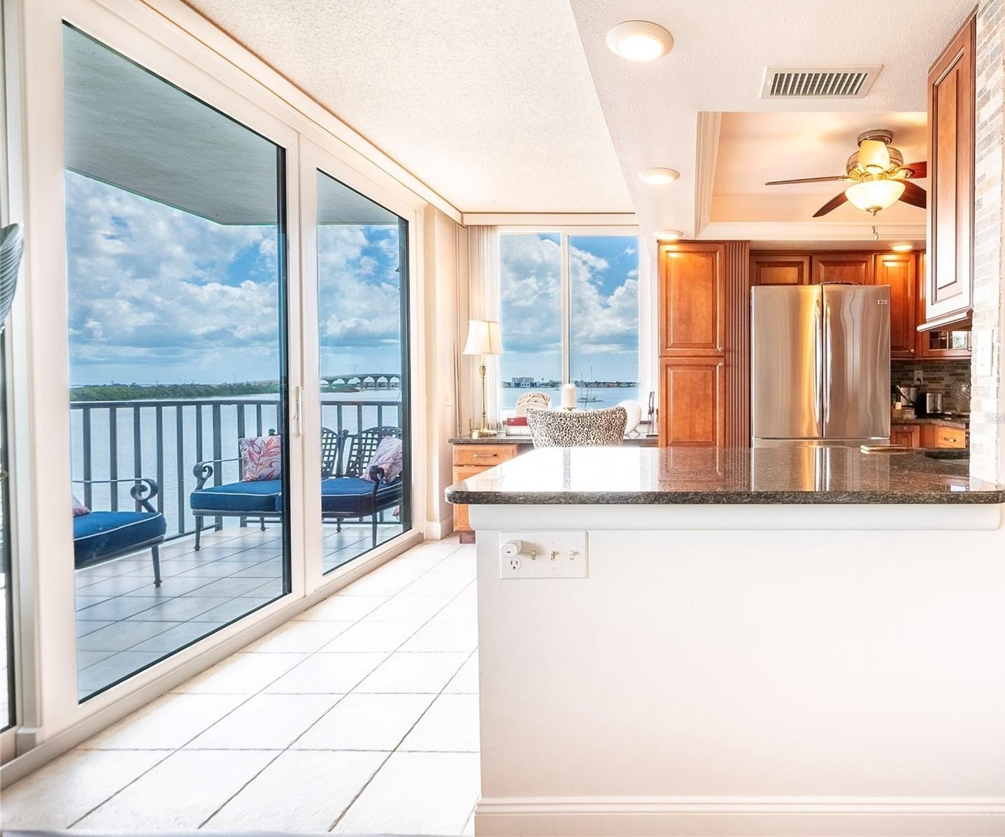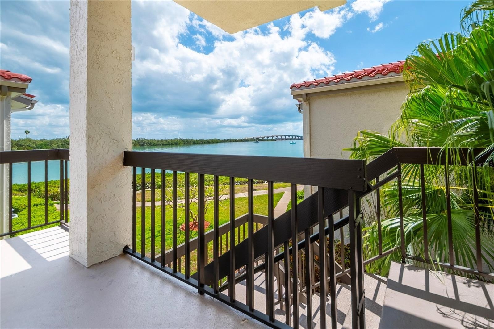 Spectacular waterfront living on Boca Ciega Bay defines this beautifully updated 2-bedroom, 2-bath, 1050 sq-ft condo in the desirable Bahia Del Mar community. From the moment you enter, you are greeted by sparkling blue water views framed by large windows and sliding glass doors (ALL NEWLY REPLACED IN 2025) that fill the home with natural light. The open floor plan seamlessly connects the kitchen, dining, and living areas – ideal for entertaining or simply enjoying the tranquil coastal setting. The renovated kitchen features soft-close wood cabinetry, granite counter-tops, stainless-steel appliances, a tiled backsplash, and added features like a pull-up bar, a pantry with pull-out drawers, and a built-in desk area. Both bedrooms provide privacy, with the guest room positioned near the main bath and showcasing its own water view. The primary suite sits at the back of the unit, capturing sweeping bay vistas, and includes a walk-in closet and an updated en-suite bathroom featuring a widened shower - an upgrade not found in similar units – along with a large granite-topped vanity with generous storage space. ADDITIONAL HIGHLIGHTS INCLUDE: NEWLY INSTALLED A/C (2024) - in unit washer/dryer – updated vinyl flooring and baseboards - covered, under the building parking space conveniently located near the lobby entrance and the elevator – extra storage closet conveys with this unit as well. Step on to your private balcony to enjoy colorful sunrises, watch dolphins, manatees, coastal birds and boating activity on the bay. In the distance you can see the Skyway Bridge or take in the views of the Tierra Verde bridge evening lights.