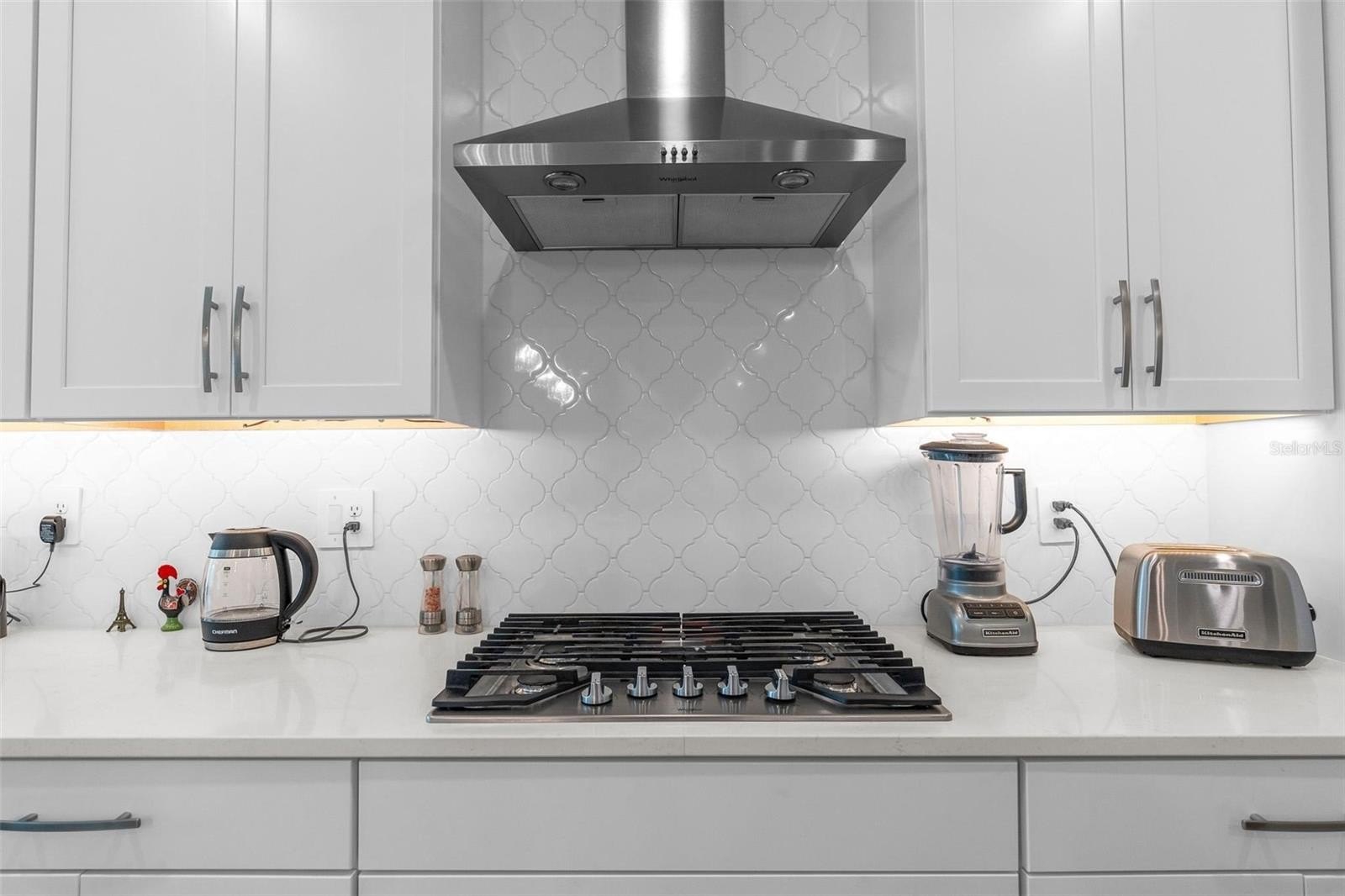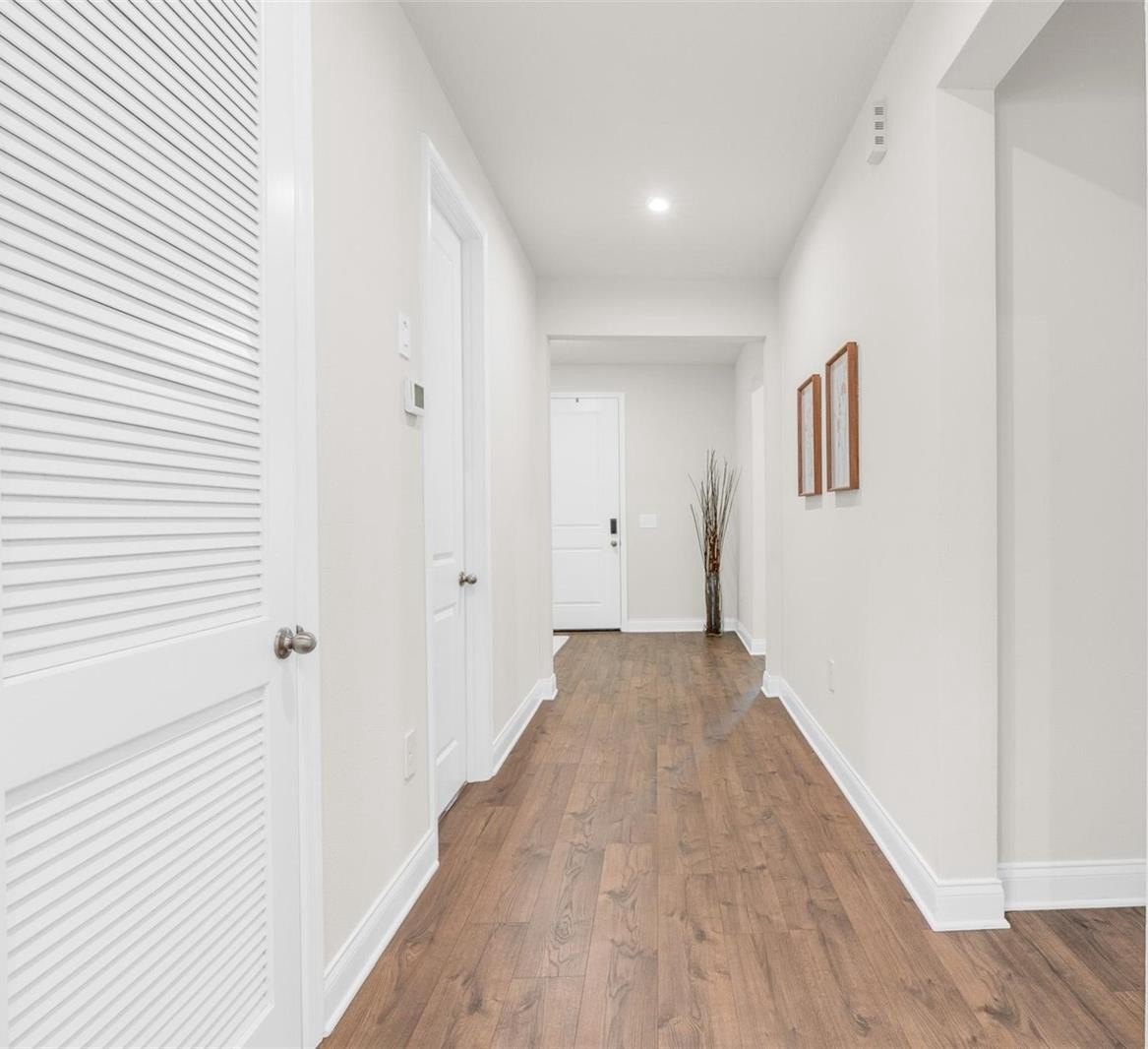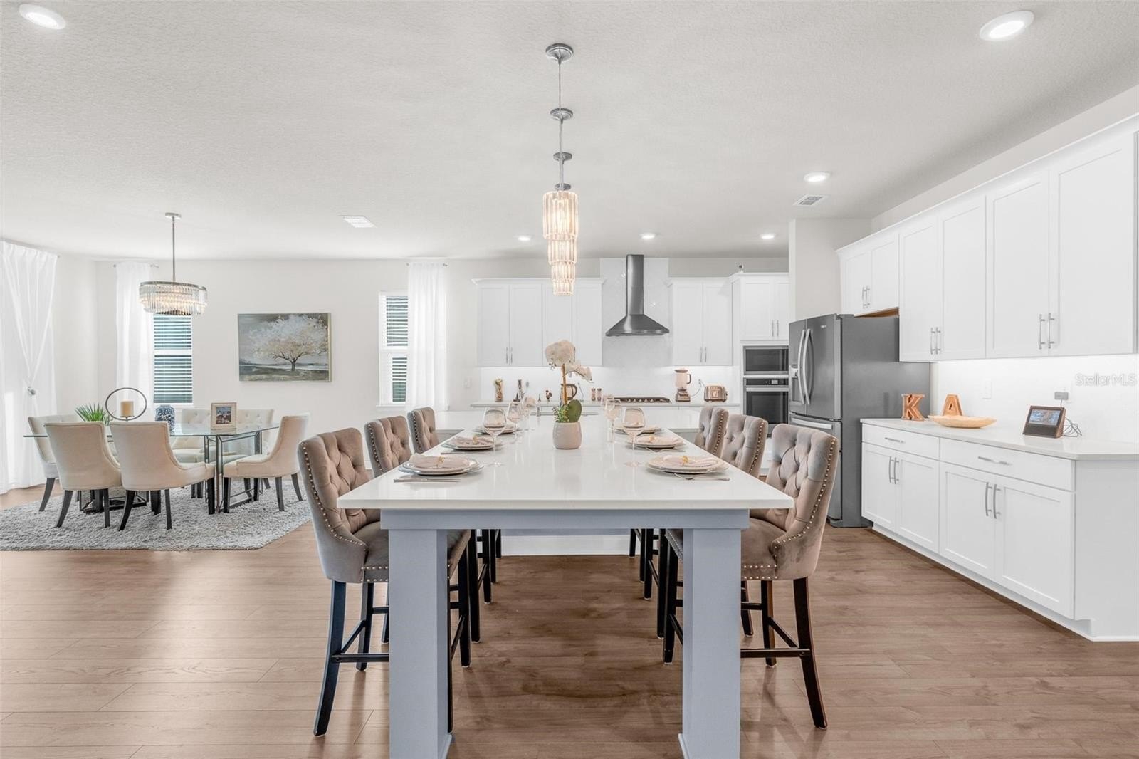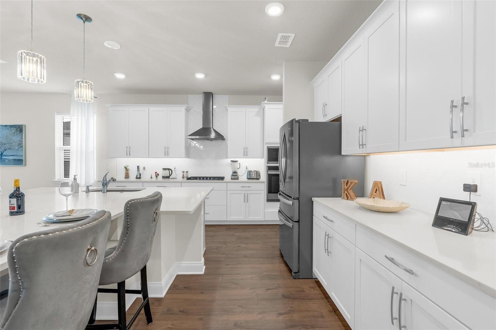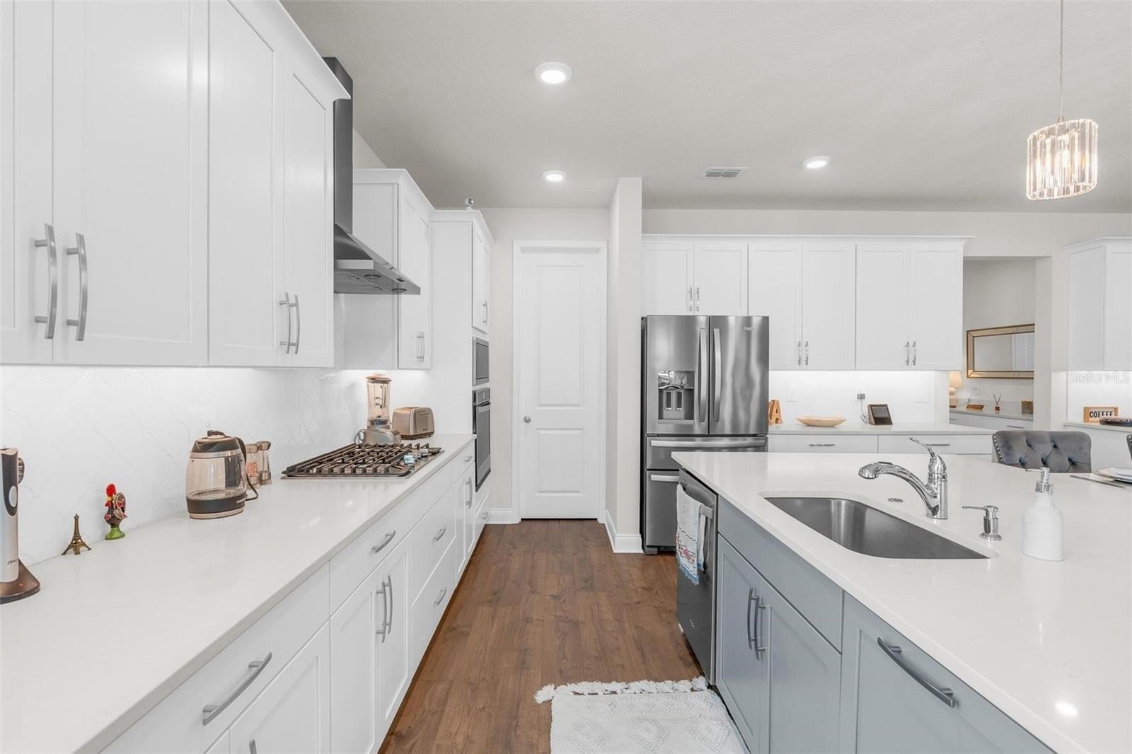 From the moment you walk in, the difference is clear. 8-foot interior doors, luxury laminate plank flooring throughout the main living areas and bedrooms (no carpet!), and an open-concept layout designed for real family life. The gourmet culinary kitchen is the heart of the home. Featuring 42" stacked upper cabinets with premium Sonoma finish, Carrara Oro quartz countertops, a full designer arabesque backsplash carried all the way up the hood wall, under-cabinet lighting, cooktop with wall oven and microwave combo, vent hood, and a full upgraded stainless steel appliance package: refrigerator, washer, and dryer included.