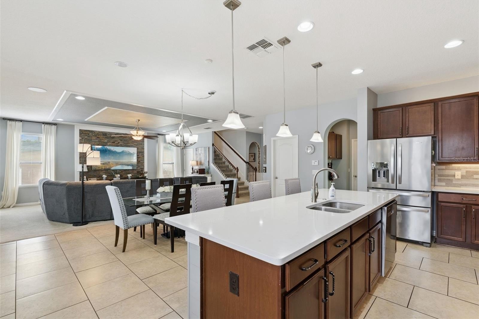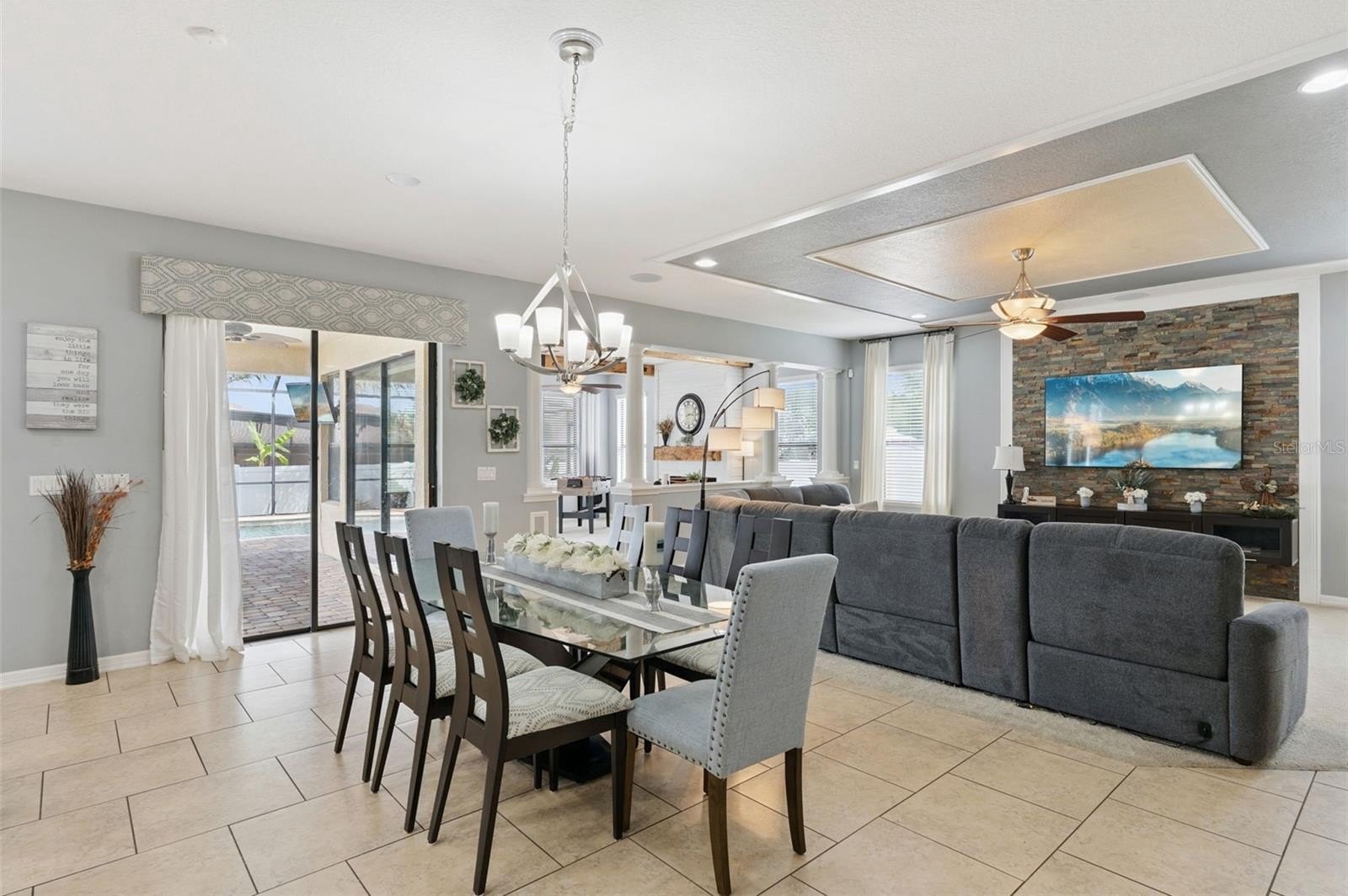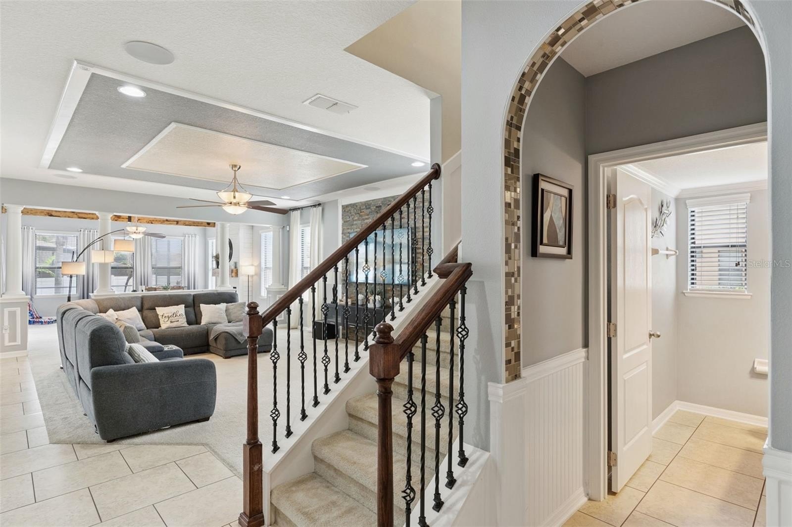 This thoughtfully designed home features a 4-foot rear extension, a versatile bonus room, tropical landscaping, and an extended three-car paver driveway. Inside, you’ll find a light-filled interior with crown molding, decorative trim, and elegant finishes throughout. A private office with a half bath sits at the front of the home, while the spacious great room—complete with a 5.1 surround sound system, faux tray ceiling, and stone accent wall—is perfect for entertaining.
