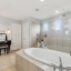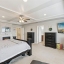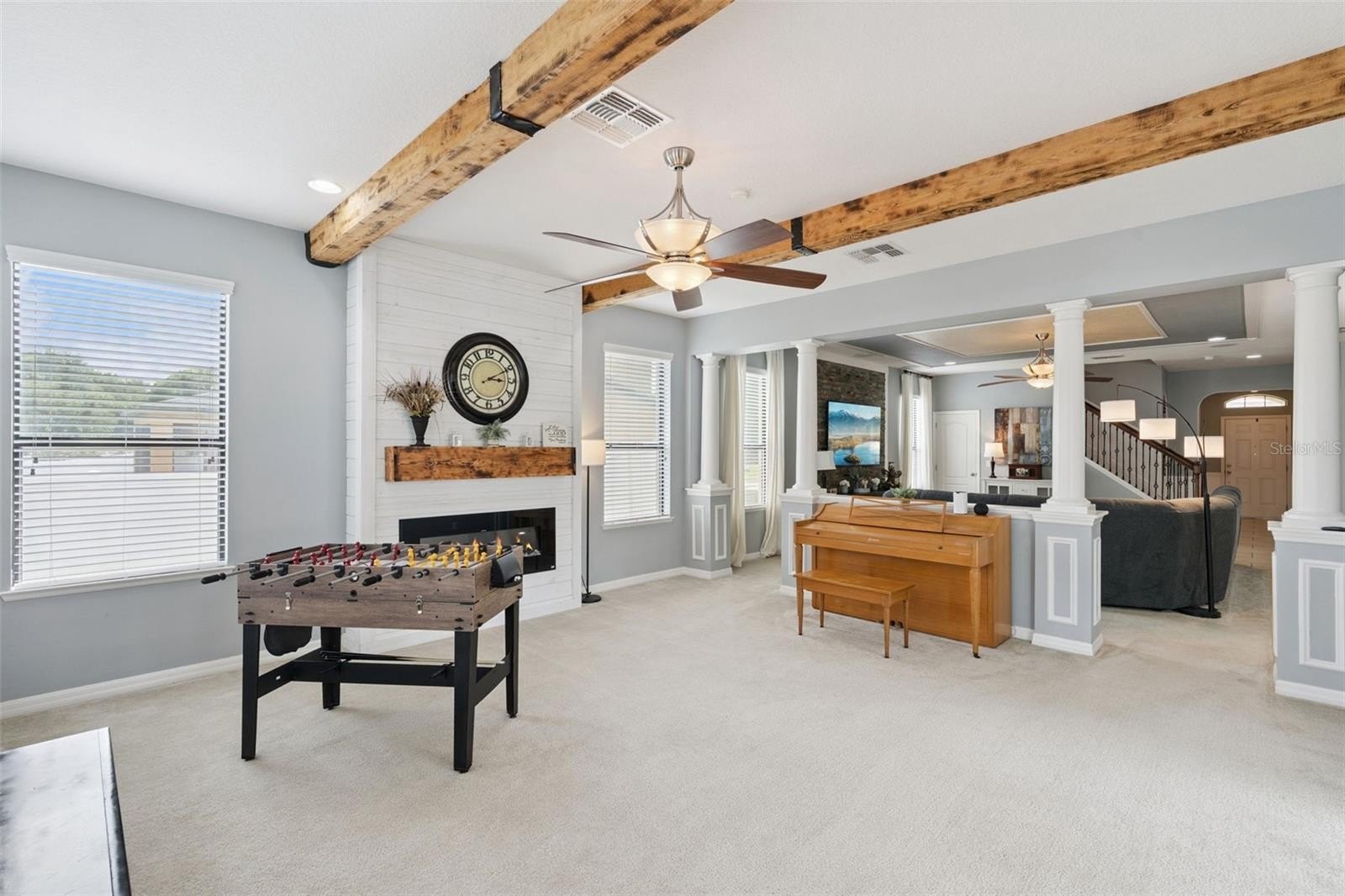 Upstairs, the oversized primary suite includes a sitting area, coffered ceiling with wood trim, electric fireplace, and abundant natural light. The spa-like bath features a huge walk in frameless glass shower, large jetted garden tub, dual vanities, private water closet, and a large walk-in closet. Three additional bedrooms and a guest bathroom featuring a dual-sink vanity and tub-shower combination provide comfortable accommodations for family or guests, while plenty of storage is thoughtfully incorporated throughout the home.