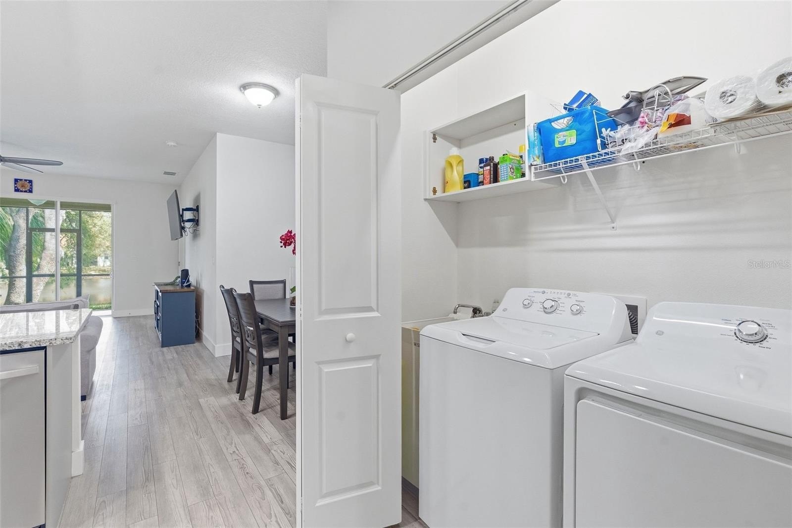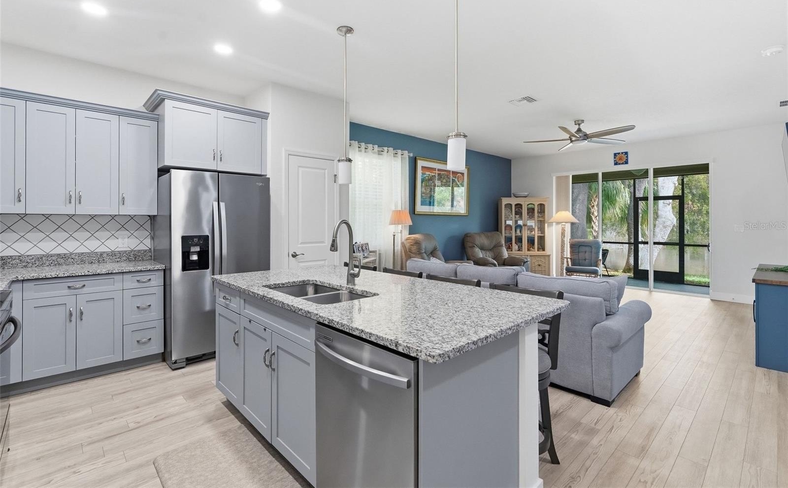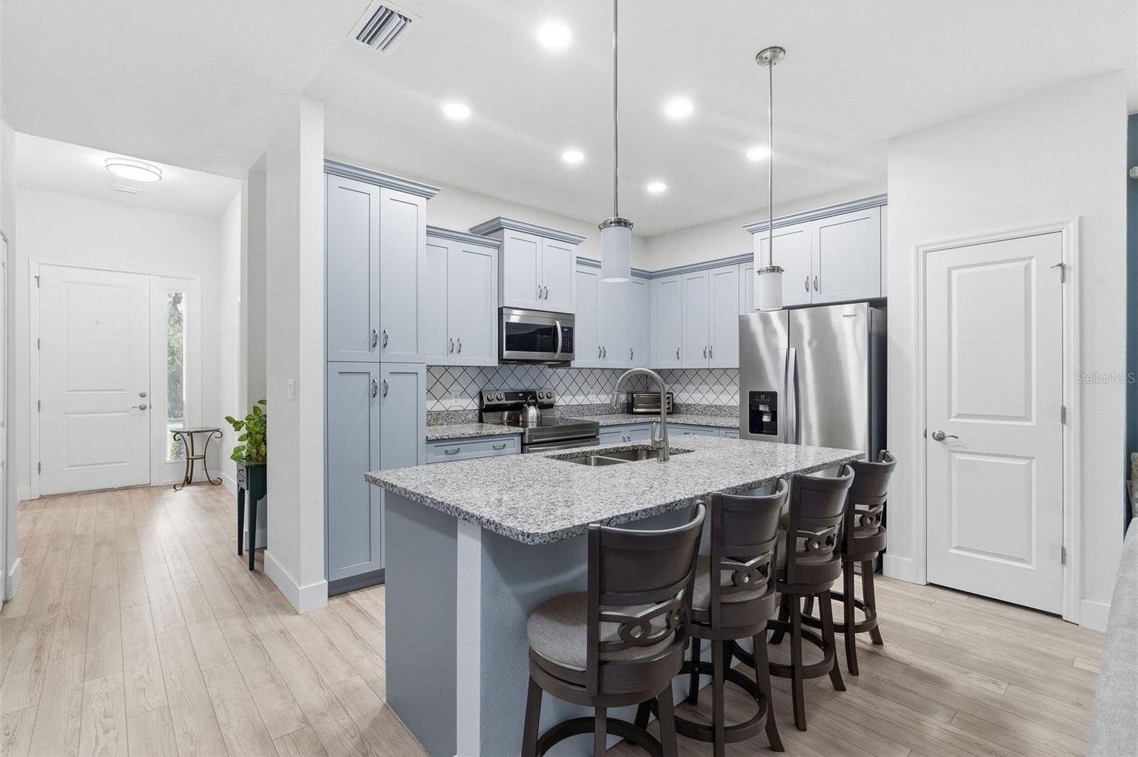 The open concept floor plan seamlessly connects the kitchen, dining, and living areas. The kitchen is equipped with a large granite island with bar seating, 36" shaker cabinets with soft-close hardware, a built-in pantry, and LG stainless steel appliances. Luxury vinyl plank flooring throughout and over 9ft ceilings enhance the home’s bright, open feel.