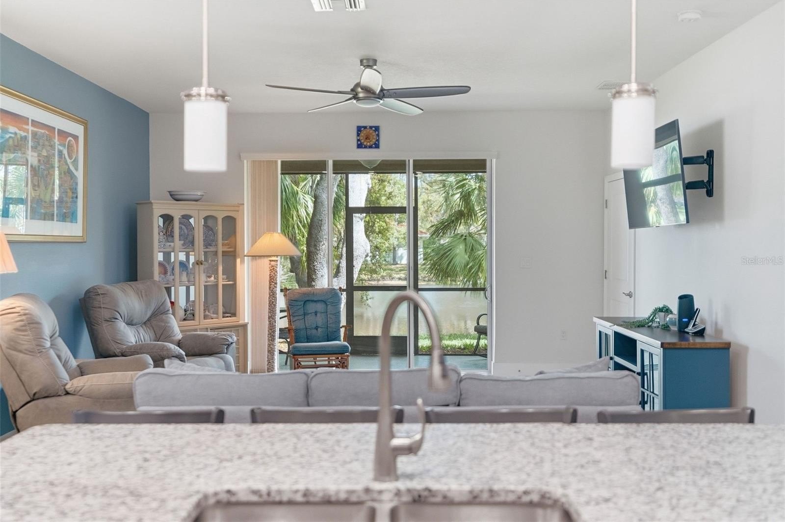 Step outside to a private screened lanai overlooking a lake, offering a peaceful and private setting. A truly special spot to enjoy your morning coffee while watching the Whistling ducks swim by.