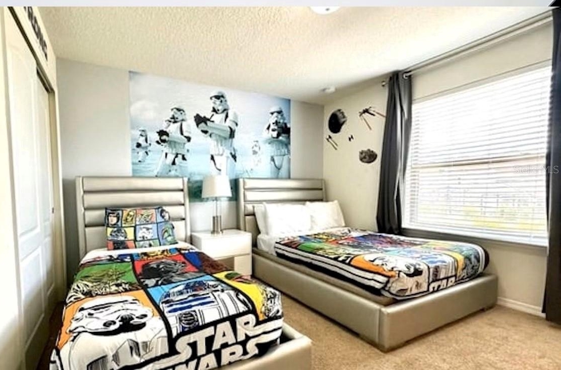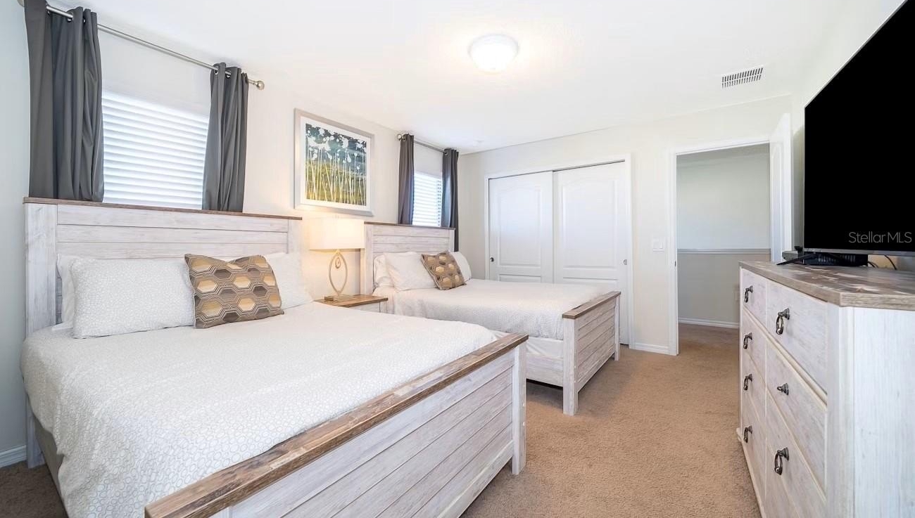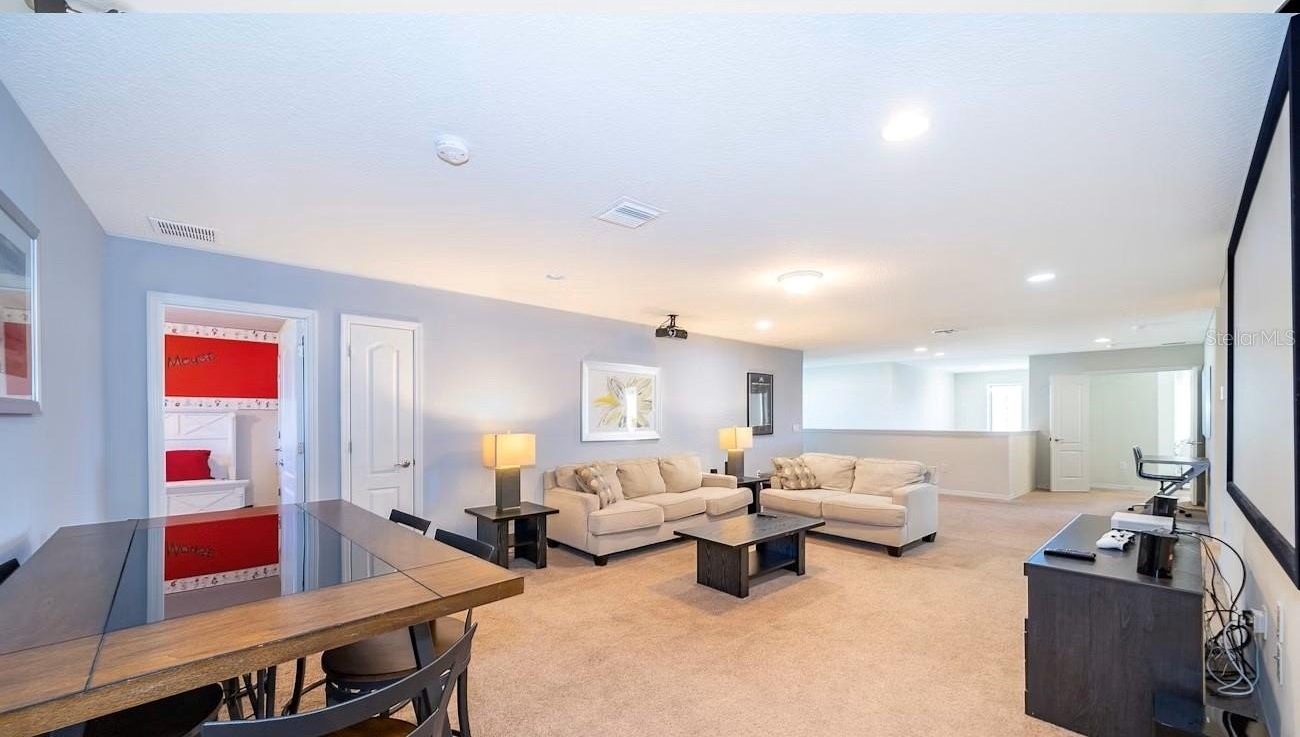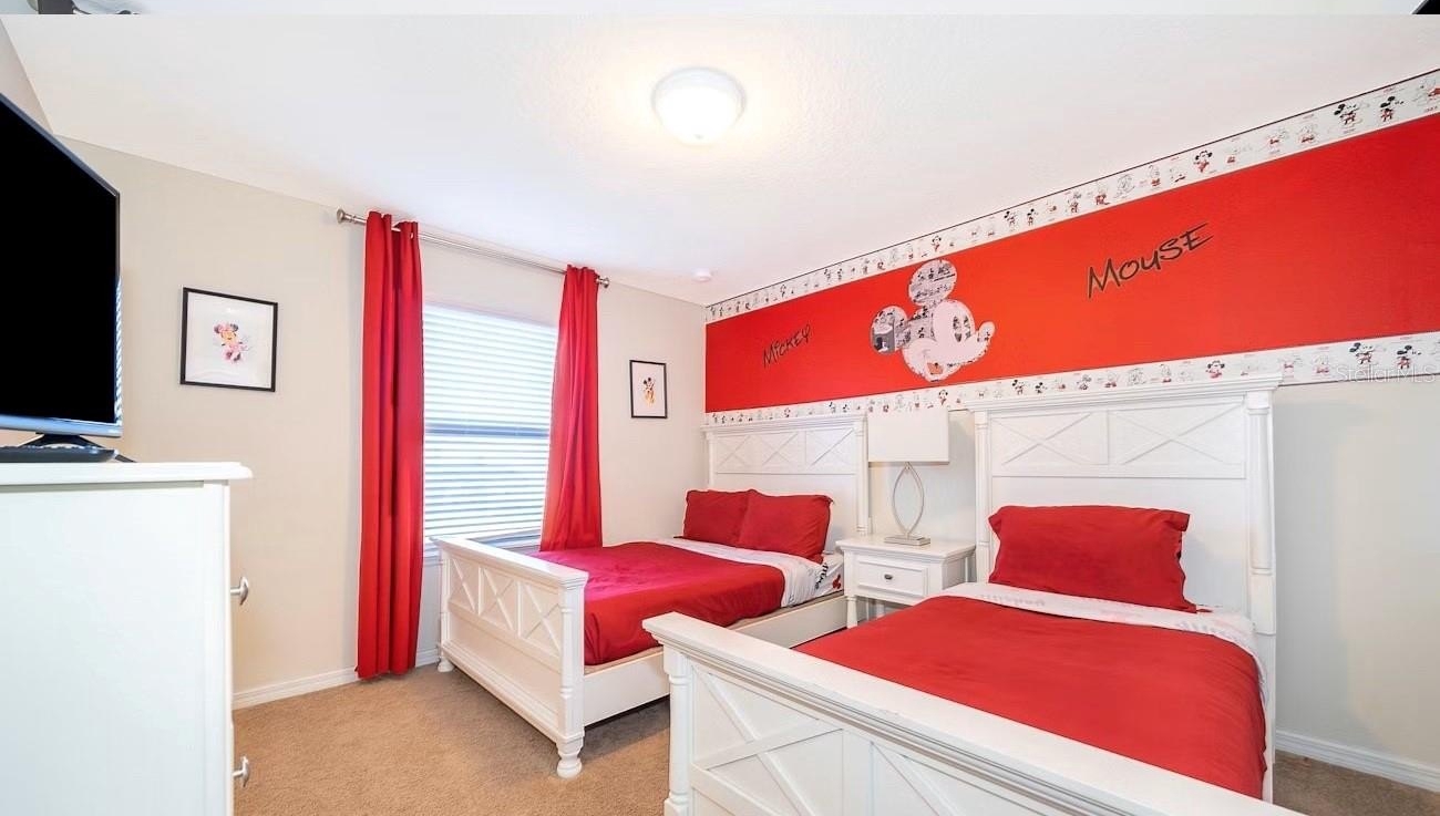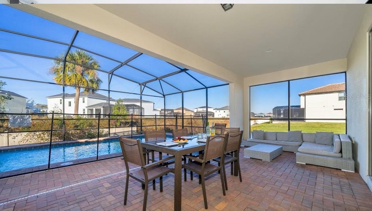 Turnkey 8-bedroom, 6-bath fully furnished pool home located in the highly desirable Windsor at Westside Resort. This well-maintained property offers over 4,000 sq ft of living space with a functional and spacious layout ideal for short-term rental use. The home features an open-concept main floor with a large kitchen, breakfast bar, formal dining area, and expansive living room. A first-floor bedroom and full bath provide convenience, along with a rear primary suite offering direct pool access and functioning as a pool bath. The covered lanai overlooks a private setting with no rear neighbors and a pond to the side. Upstairs includes a large loft/game area with projector and gaming stations. The second floor consists of 6 bedrooms and 4 bathrooms, including multiple themed rooms, a Jack-and-Jill bathroom with dual vanities, and additional ensuite configurations. In total, the property offers 3 ensuite bedrooms. The garage has been converted into a game room, enhancing rental appeal. Located just minutes from major theme parks, shopping, and dining. Windsor at Westside offers resort-style amenities including a 10,000 sq ft clubhouse, pool, lazy river, restaurant/bar, fitness center, sports courts, and more. HOA includes gated access, lawn care, daily valet trash service, cable, internet, and full access to amenities. Property has strong rental potential and is being sold fully furnished and ready for immediate use or income production.