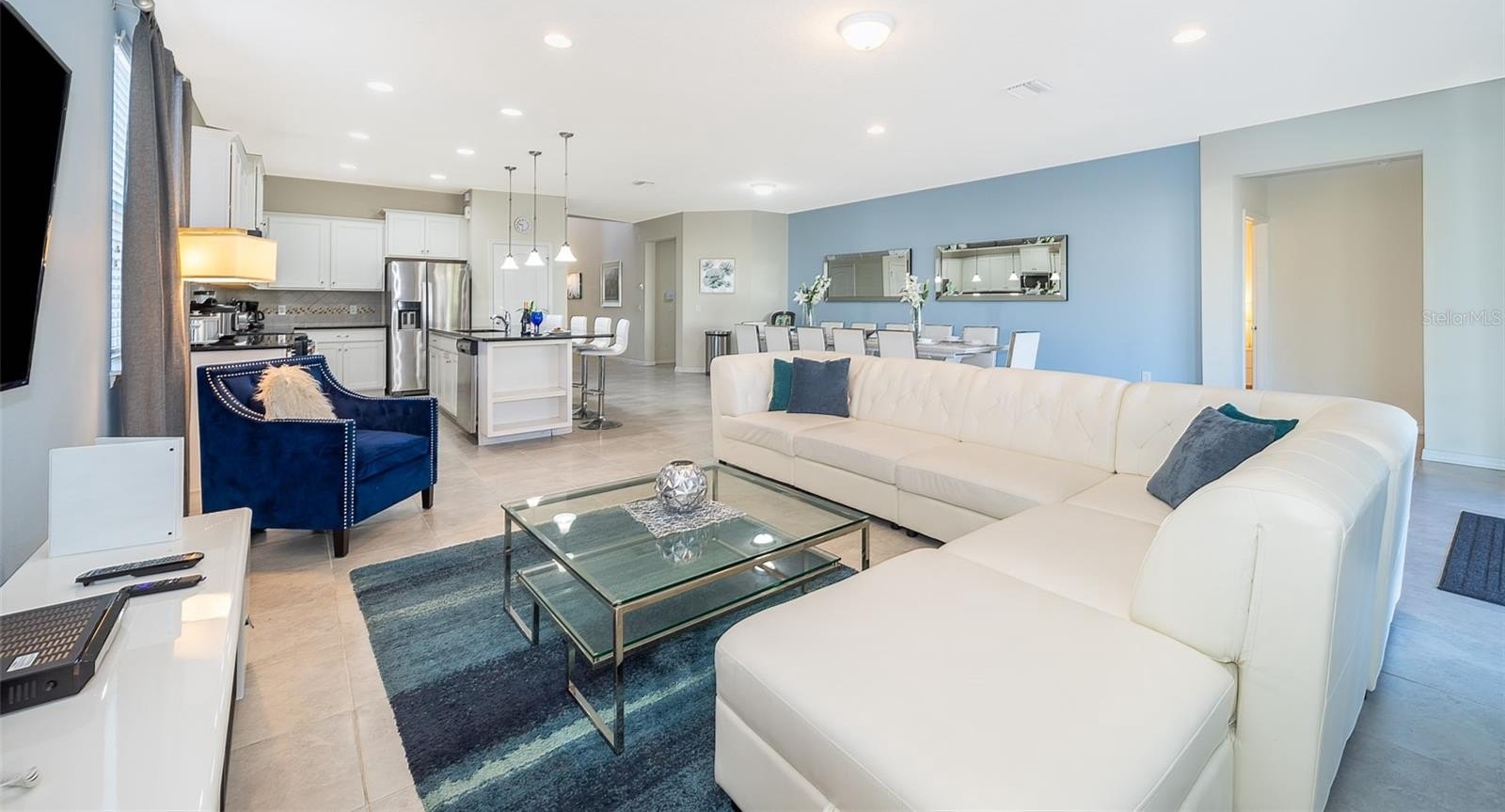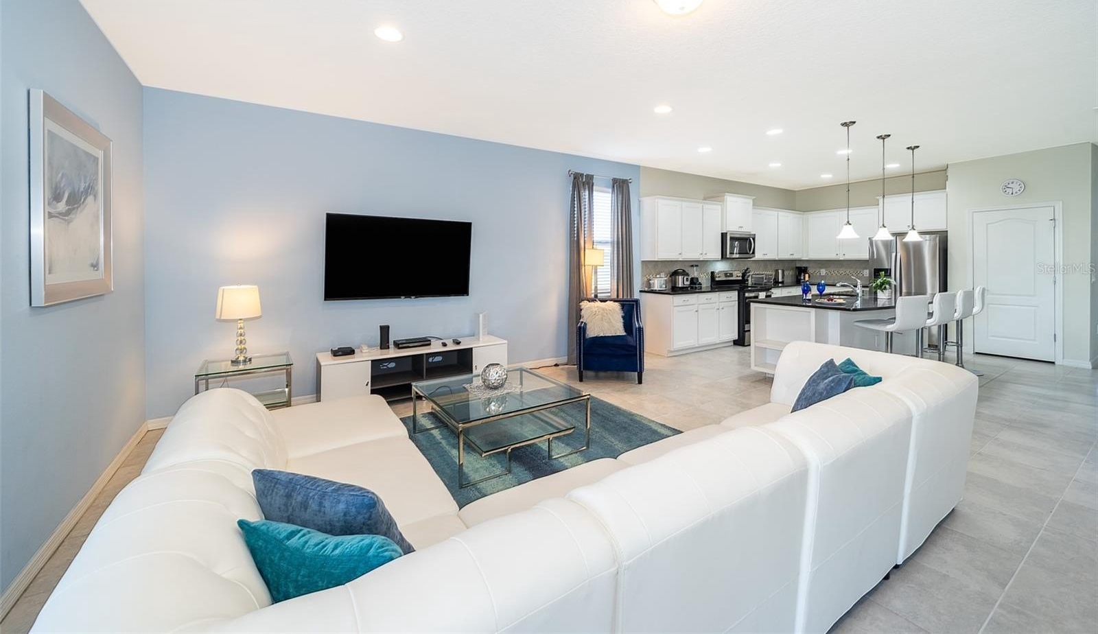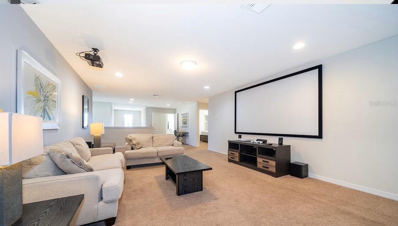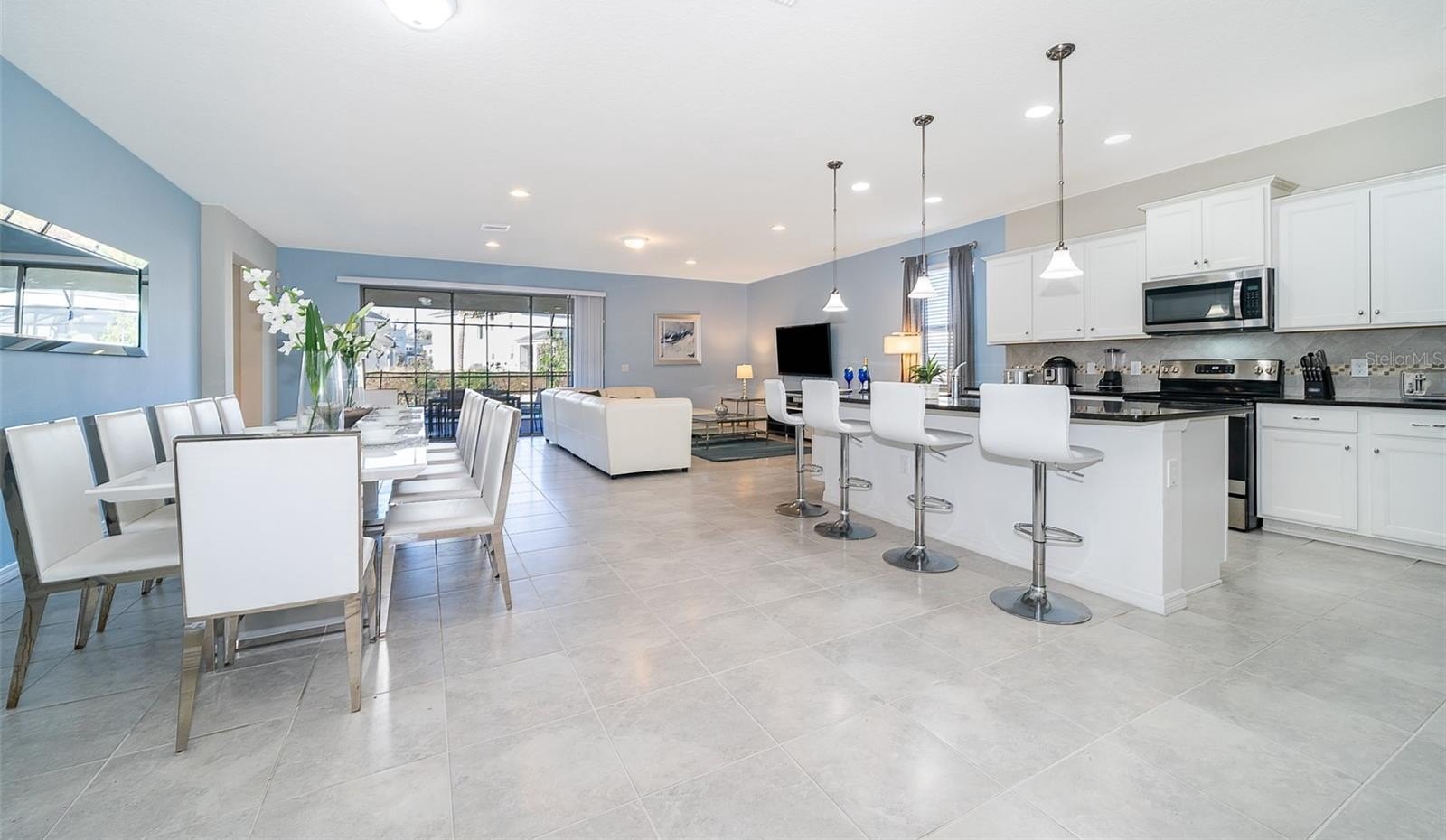 Turnkey 8-bedroom, 6-bath fully furnished pool home located in the highly desirable Windsor at Westside Resort. This well-maintained property offers over 4,000 sq ft of living space with a functional and spacious layout ideal for short-term rental use. The home features an open-concept main floor with a large kitchen, breakfast bar, formal dining area, and expansive living room. A first-floor bedroom and full bath provide convenience, along with a rear primary suite offering direct pool access and functioning as a pool bath. The covered lanai overlooks a private setting with no rear neighbors and a pond to the side. Upstairs includes a large loft/game area with projector and gaming stations. The second floor consists of 6 bedrooms and 4 bathrooms, including multiple themed rooms, a Jack-and-Jill bathroom with dual vanities, and additional ensuite configurations. In total, the property offers 3 ensuite bedrooms. The garage has been converted into a game room, enhancing rental appeal. Located just minutes from major theme parks, shopping, and dining. Windsor at Westside offers resort-style amenities including a 10,000 sq ft clubhouse, pool, lazy river, restaurant/bar, fitness center, sports courts, and more. HOA includes gated access, lawn care, daily valet trash service, cable, internet, and full access to amenities. Property has strong rental potential and is being sold fully furnished and ready for immediate use or income production.