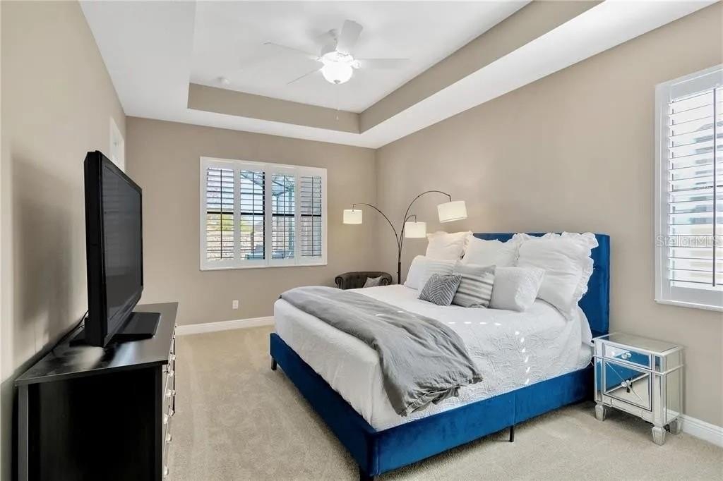 Unwind in the private primary suite, complete with a tray ceiling, custom walk-in closet, and direct pool access. The en-suite bath features a dual-sink granite vanity, garden tub, and separate shower.