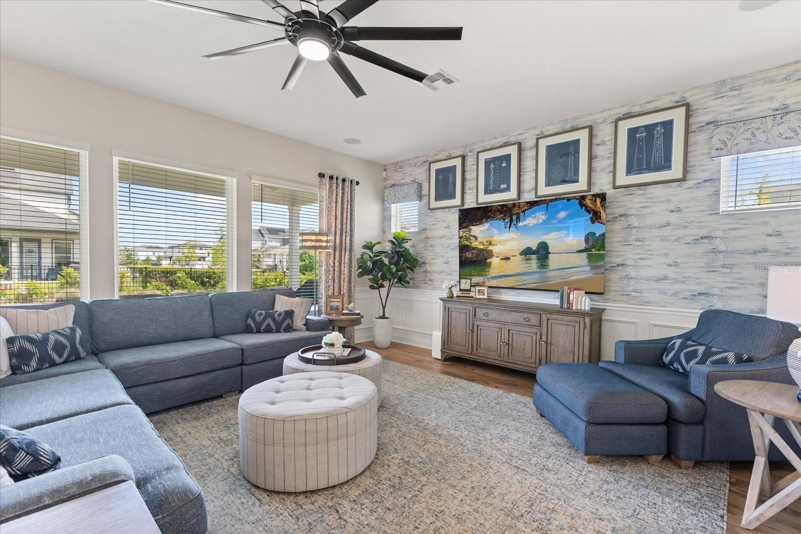 Offering over 3,200 square feet, this five bedroom, three bathroom home features fully paid off solar panels for energy efficiency and long term savings. The open concept layout is filled with natural light, highlighted by oversized windows and spacious living areas with luxury LVP flooring.
