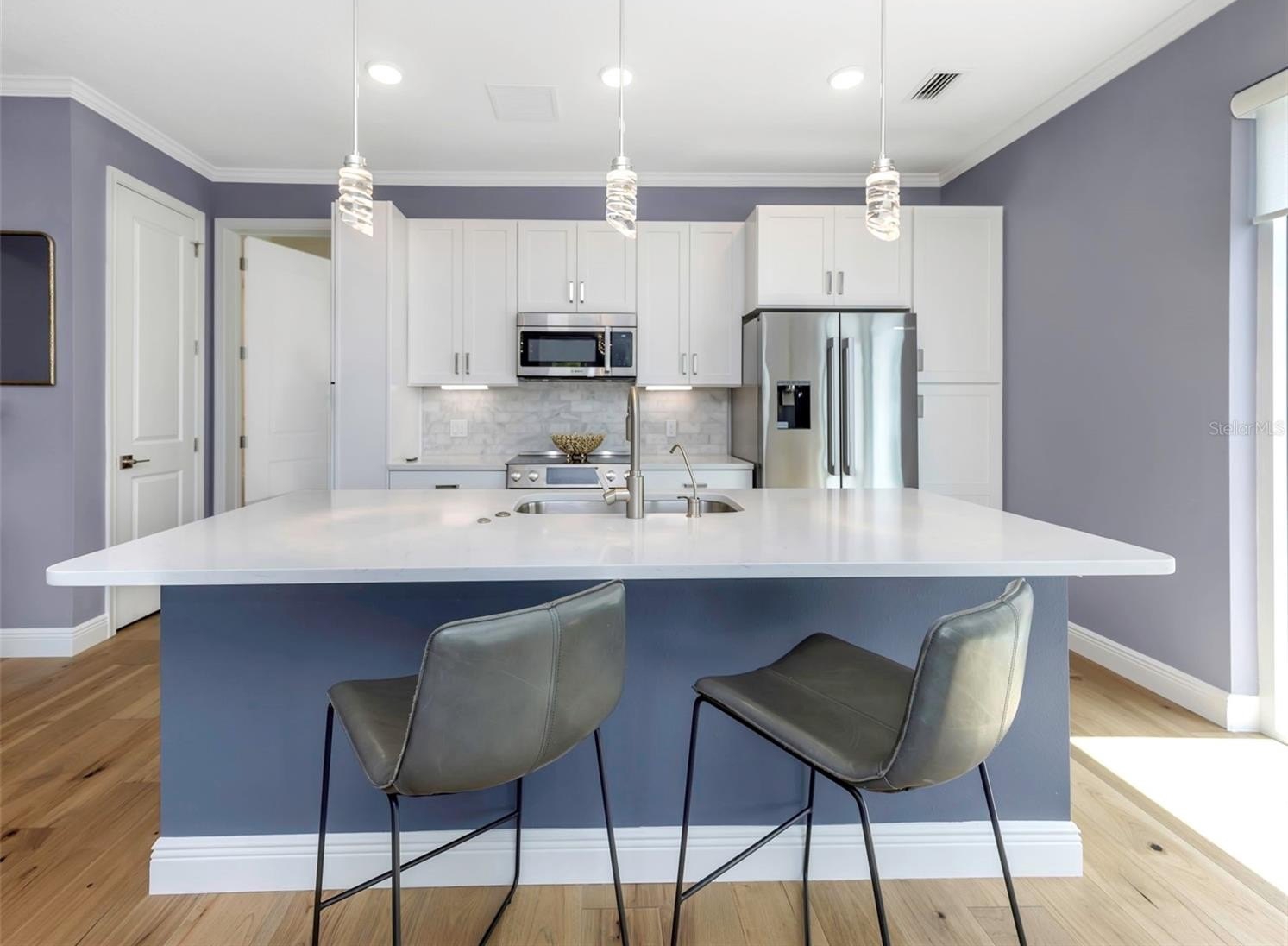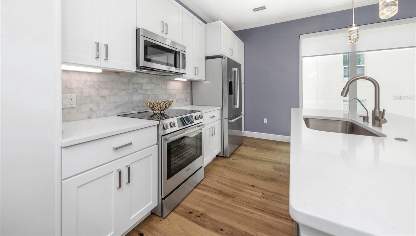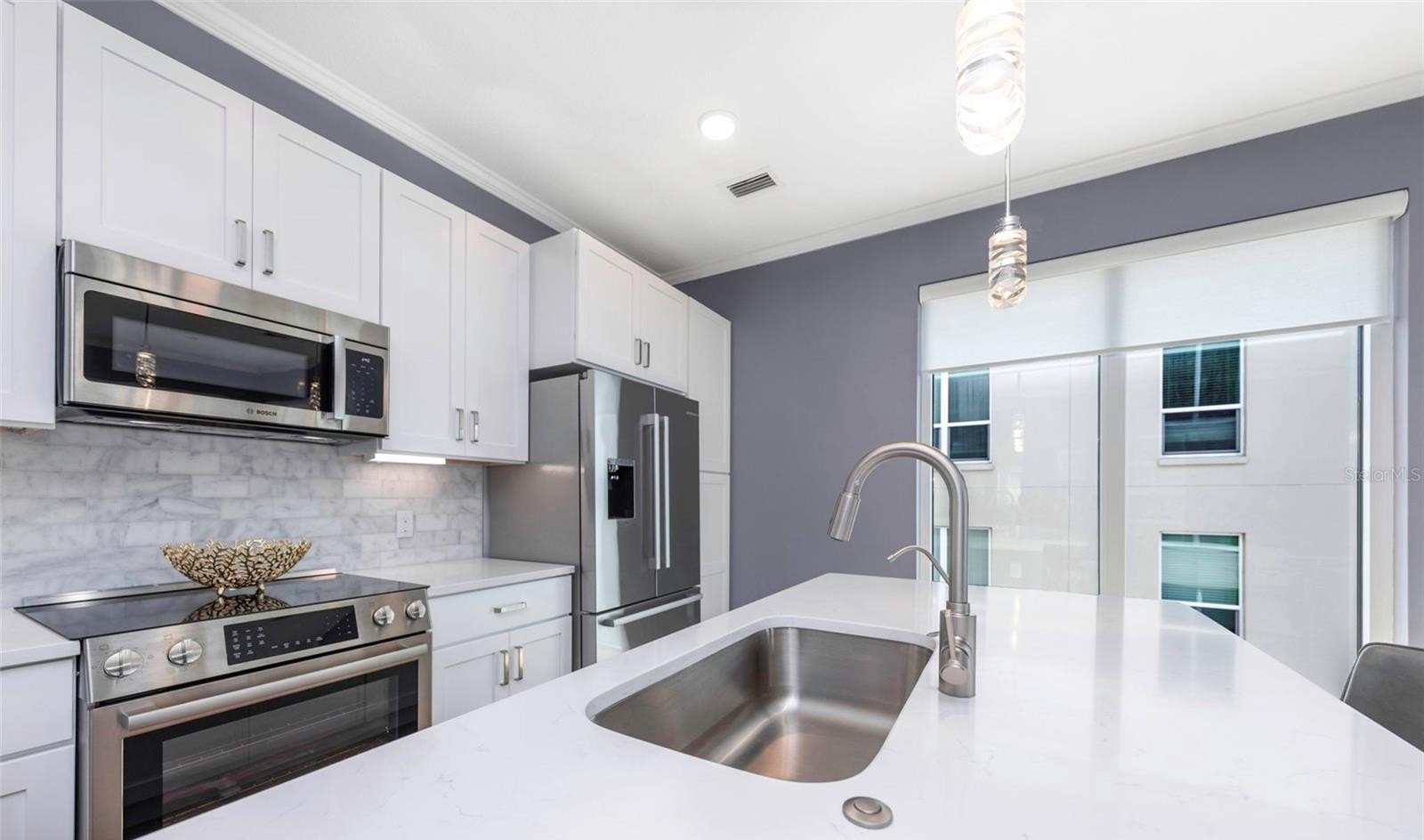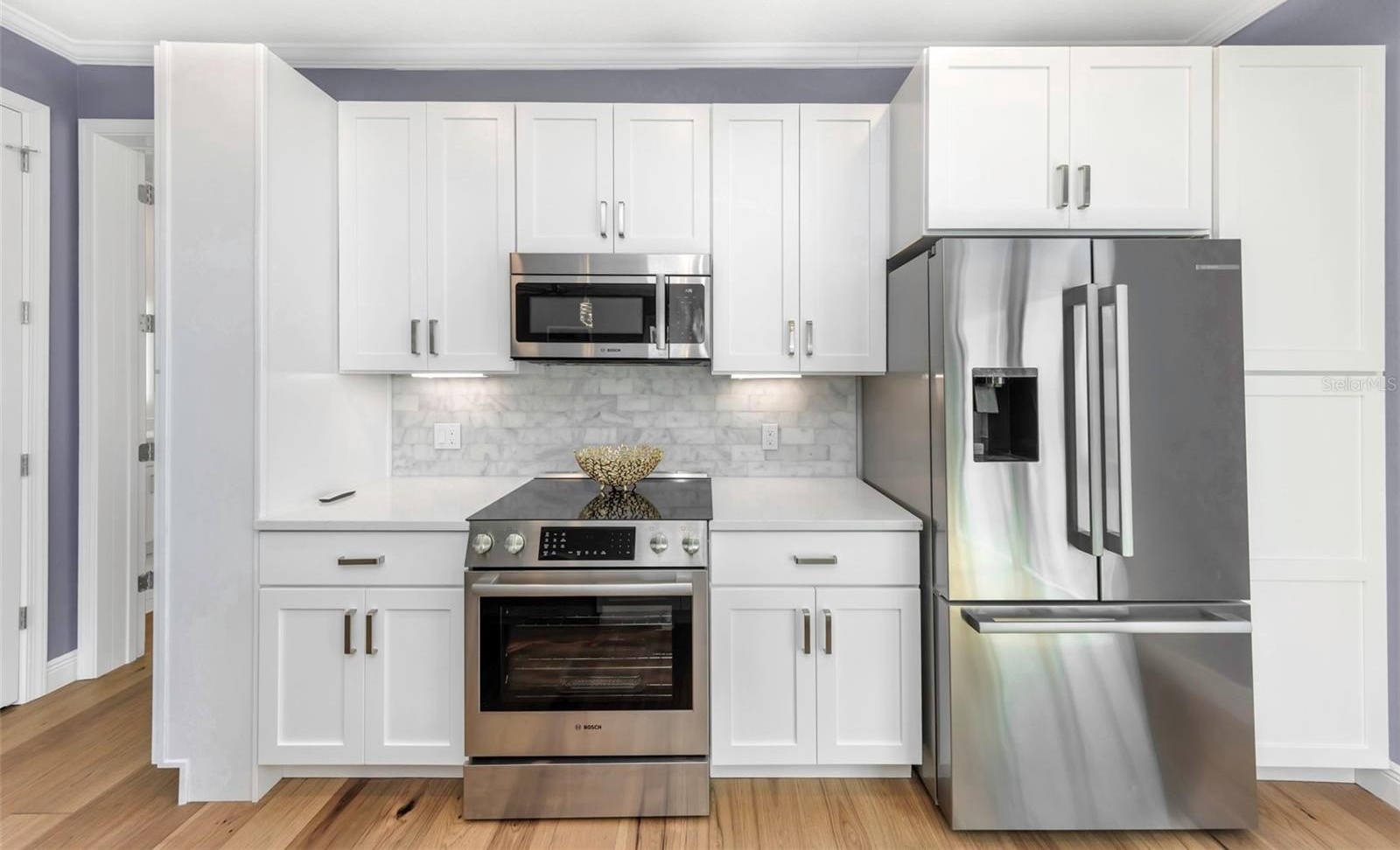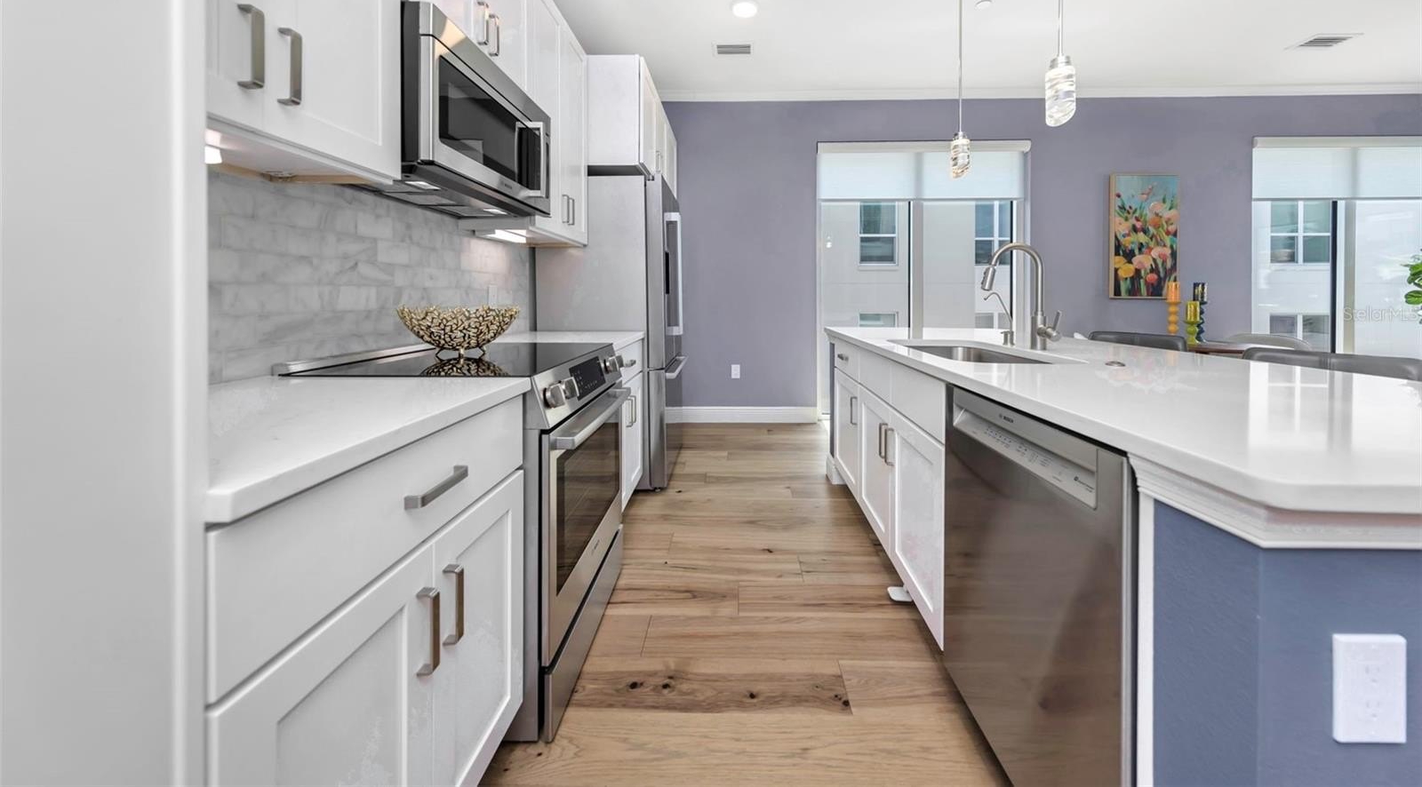 The Stunning kitchen includes Bosch stainless steel appliances, quartz countertops, solid wood soft-close cabinetry, marble backsplash, and designer pendant lighting.