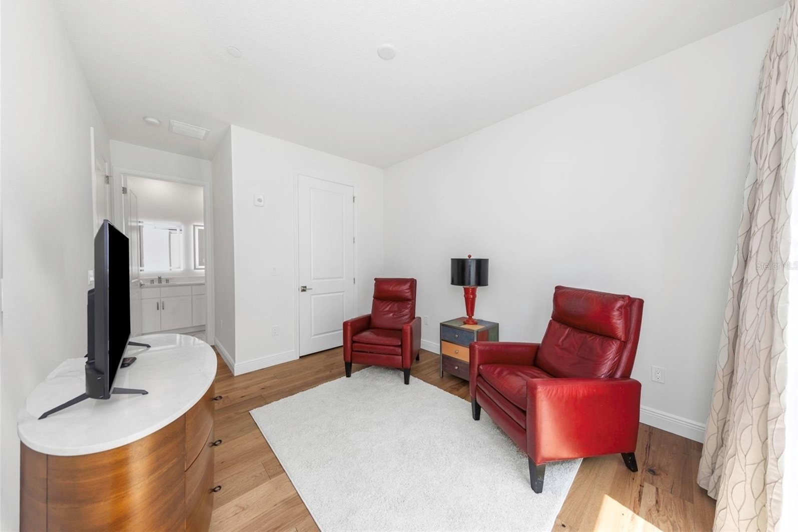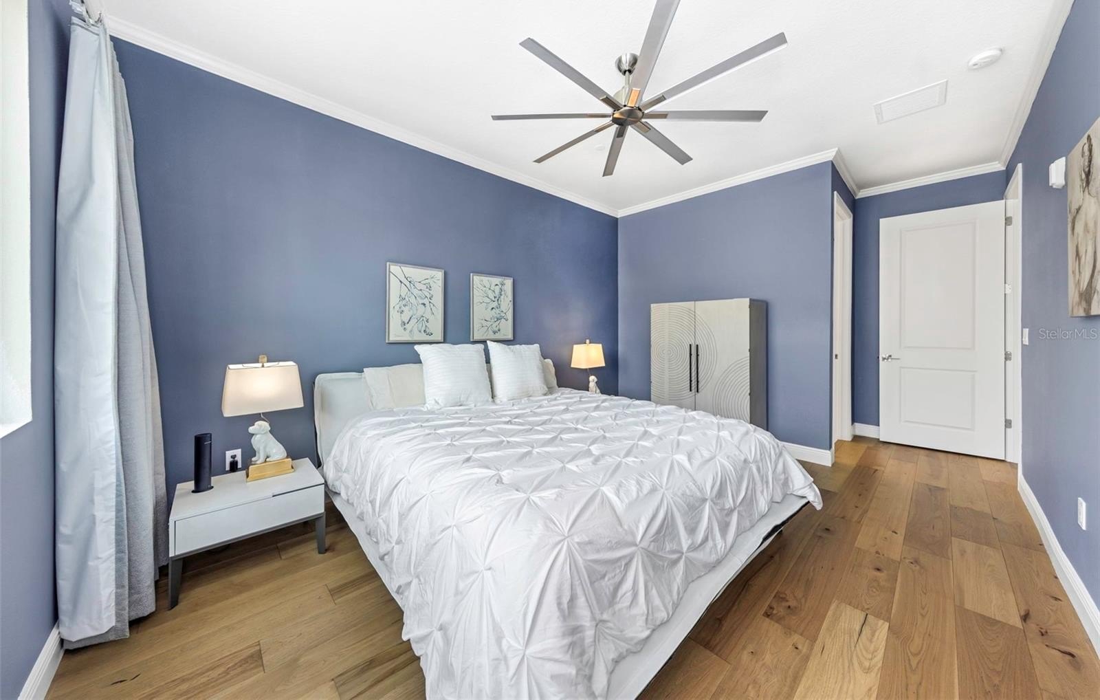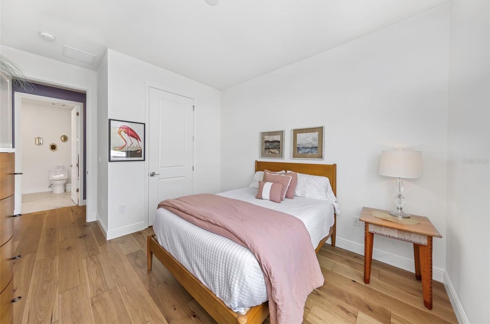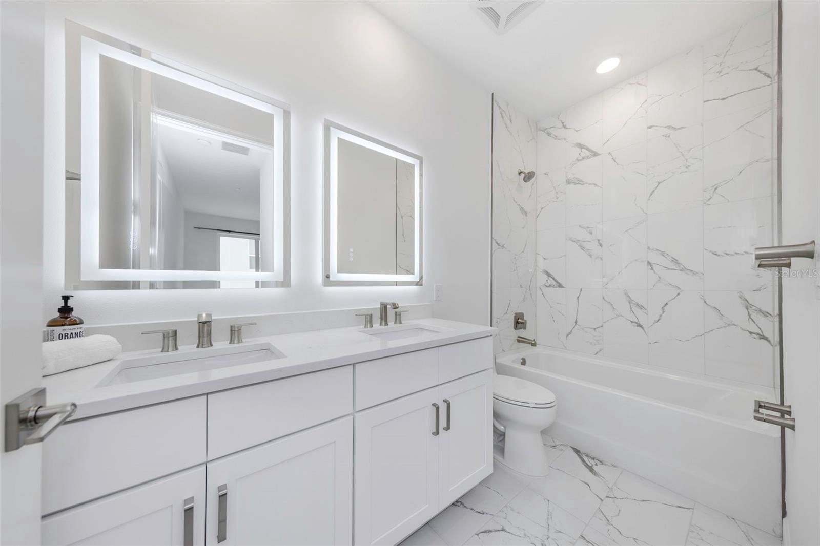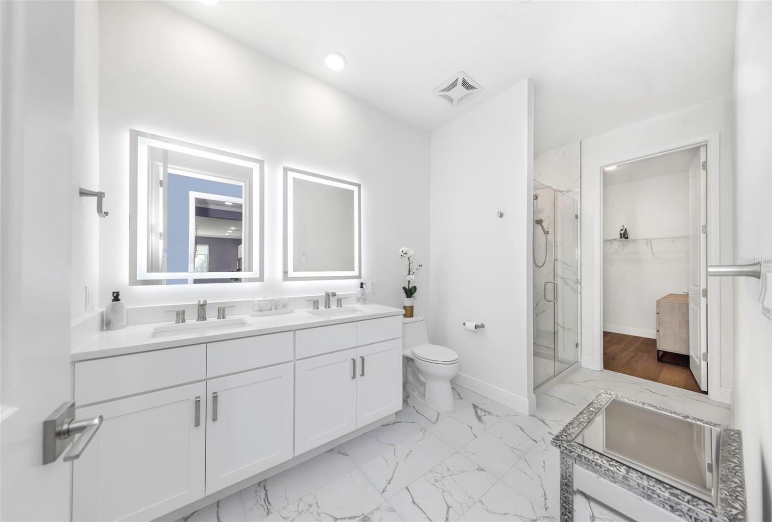 Spacious bedrooms offer ensuite baths with quartz counters, dual vanities, and Carrara-style tile and huge walk-in closets for all three rooms.
