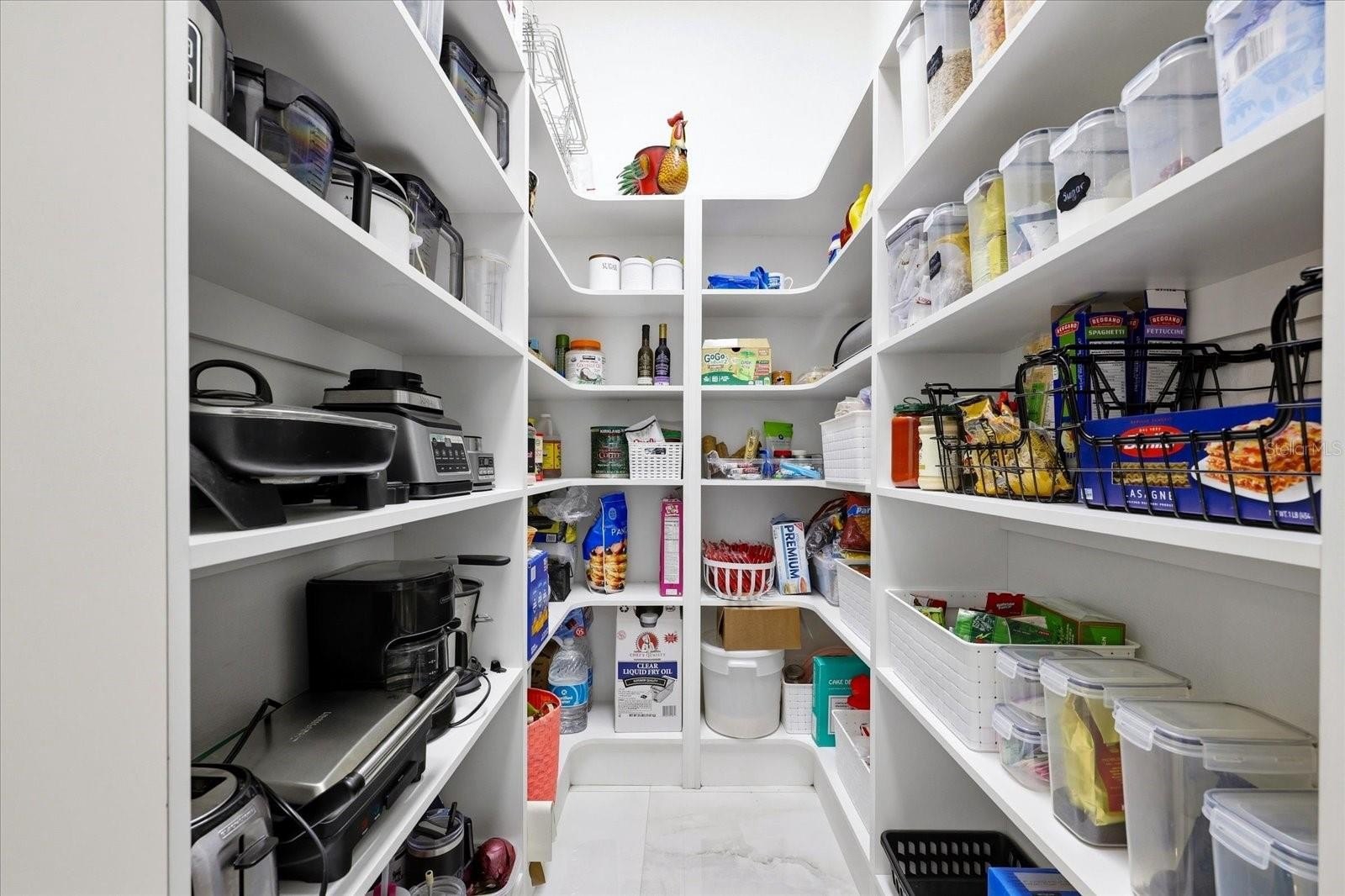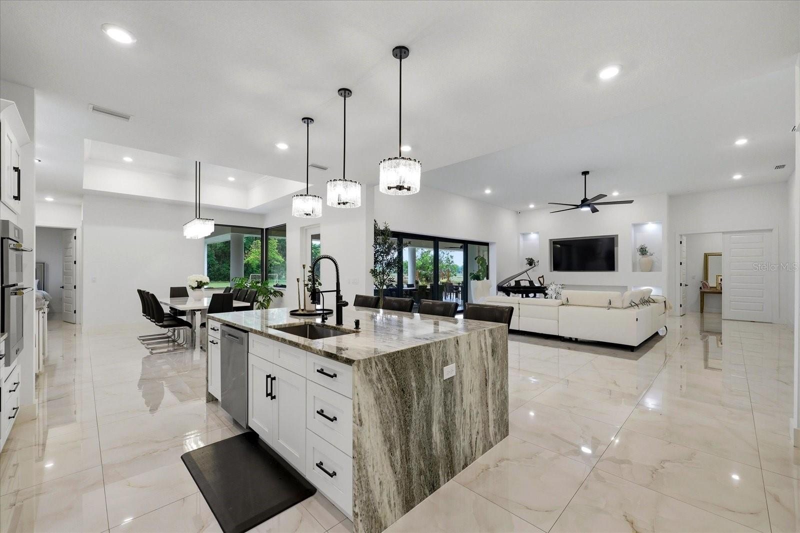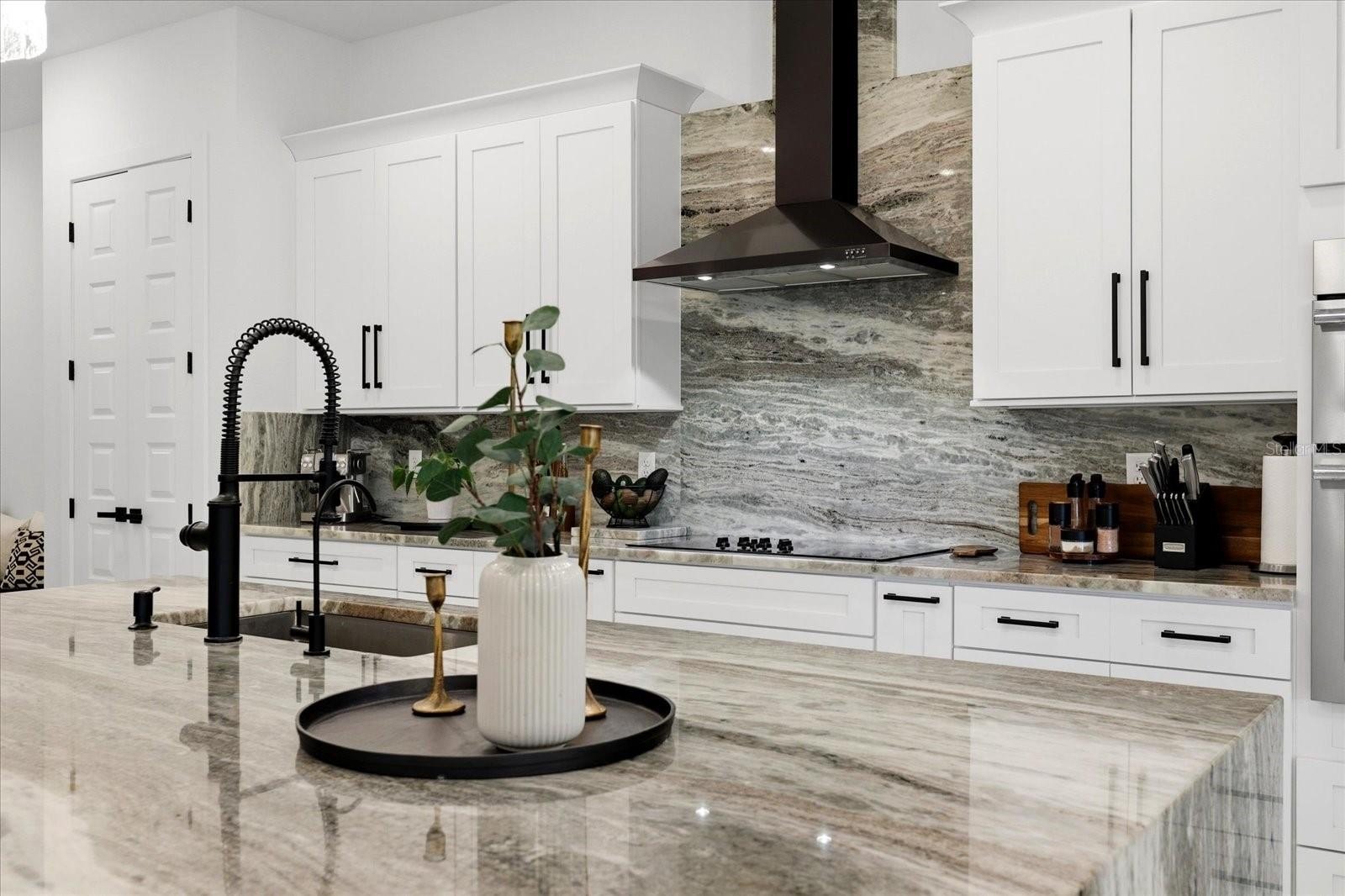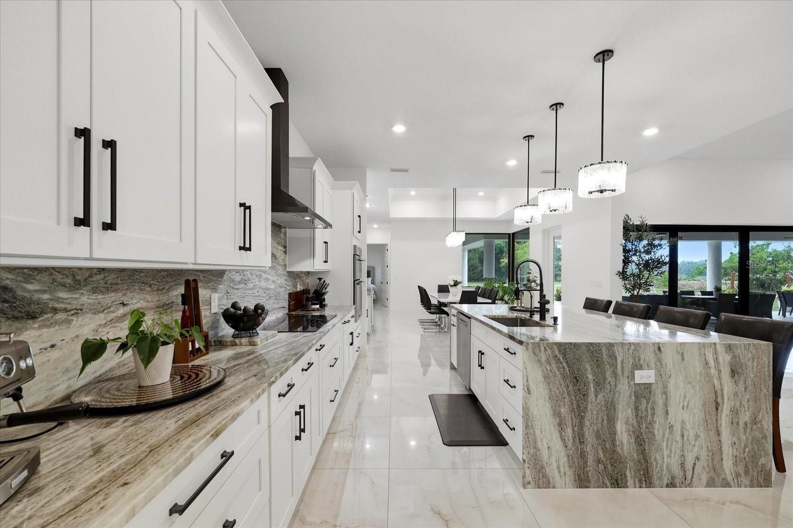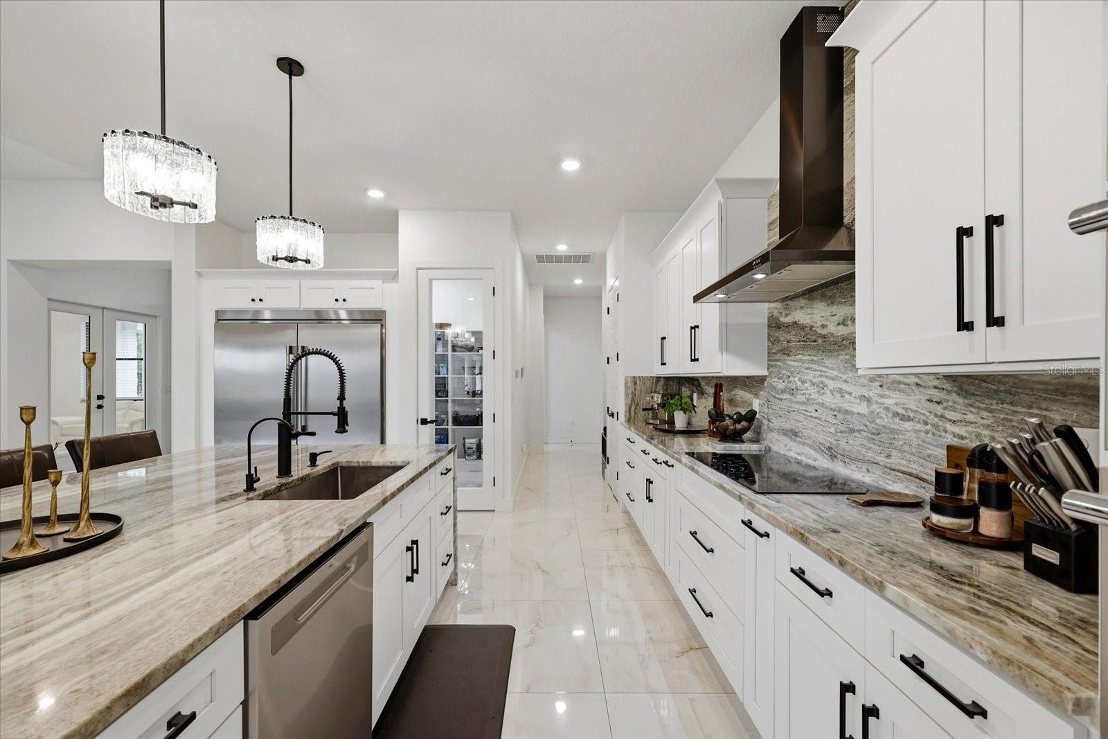 The chef’s kitchen is the heart of the home, showcasing a waterfall stone island, 36-inch cooktop, built-in oven and microwave, and a spacious walk-in pantry—perfect for everyday living and hosting.