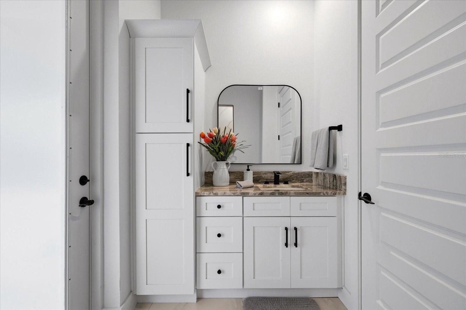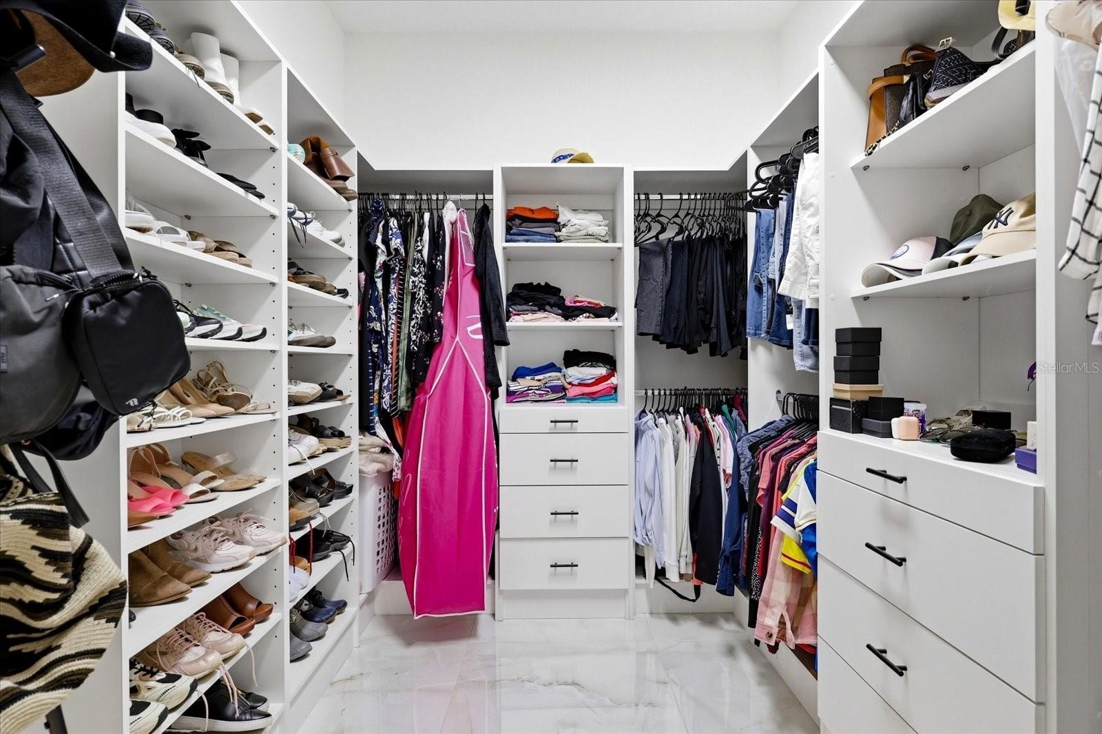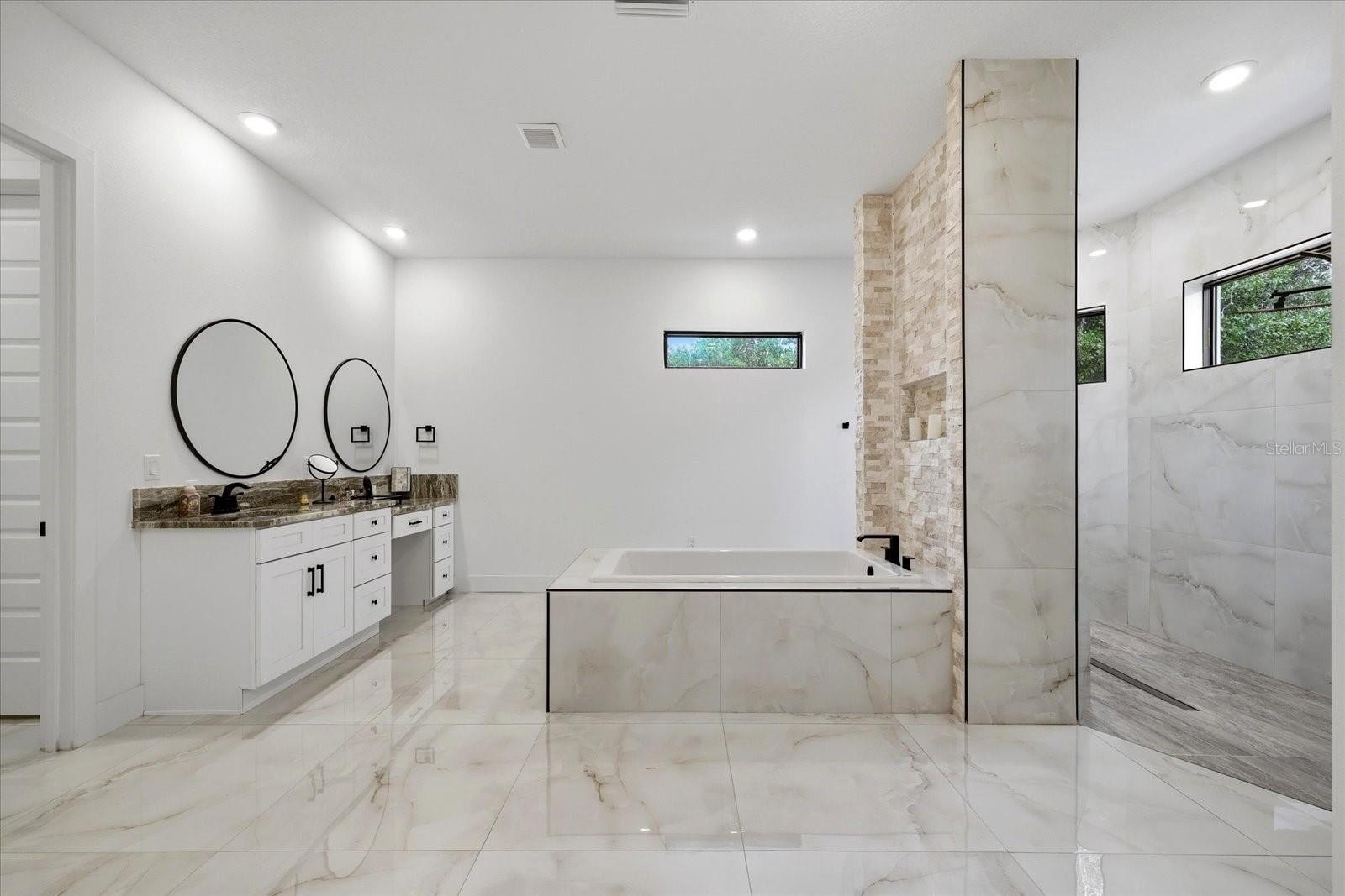 The spa-inspired owner’s suite offers a private retreat with sitting area, dual custom walk-in closets, and direct access to the backyard. The owner’s bathroom is designed for relaxation, featuring a Jacuzzi tub, dual showerheads, private water closet, and dual vanities with a dedicated makeup station.