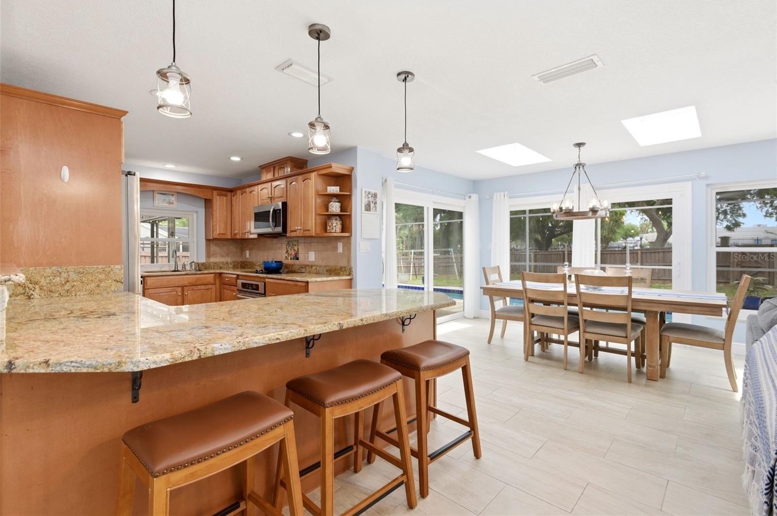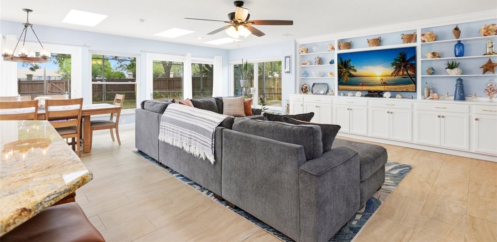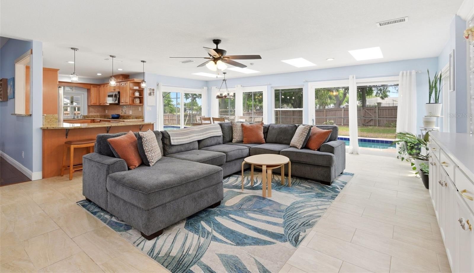 One or more photo(s) has been virtually staged. Welcome to Orange Tree Country Club, a highly sought-after gated golf course community in the heart of Dr. Phillips, Southwest Orlando. This move-in ready, single-story residence features 4 bedrooms, 2 bathrooms, and 2,131 square feet of thoughtfully designed living space, ideally situated on a quiet street. Step through the double front doors into a spacious foyer and sitting area highlighted by vaulted ceilings, with a private office to the left—perfect for working from home. The open-concept layout flows seamlessly into the kitchen, dining area, and great room, all enhanced by sliding glass doors and new skylights that flood the home with natural light and provide inviting views of the outdoor living space. Enjoy Florida living at its finest with a fully screened 50-foot lap pool, covered patio, and an expansive fenced backyard with tropical fruit trees—an area ideal for entertaining, relaxing, or everyday enjoyment with family, friends and pets. The tastefully updated kitchen features granite countertops, stainless steel appliances, ample cabinetry, generous counter space, and a convenient breakfast bar. The split-bedroom floor plan provides added privacy, with a spacious primary suite showcasing vaulted ceilings, a walk-in closet, and a beautifully appointed ensuite bath complete with dual sinks, custom cabinetry, a garden tub, and a walk-in shower. Recent updates include a new roof (2023), HVAC system (2022), water heater (2024), and exterior paint (2024), offering peace of mind for years to come. Residents of Orange Tree enjoy exceptional amenities, including a lakefront recreation center on Lake Marsha featuring a heated outdoor pool, fitness center, tennis, pickleball, basketball, racquetball, and volleyball courts, along with a playground, saunas, and meeting rooms. The community also hosts year-round events—all just a short walk from your front door. Ideally located near top-rated schools, the YMCA, Restaurant Row, Trader Joe’s, Whole Foods, Orlando International Airport, premier shopping, outlet malls, and world-renowned theme parks, this home offers an exceptional blend of comfort, convenience, and community. Discover the lifestyle you’ve been looking for—Welcome Home!