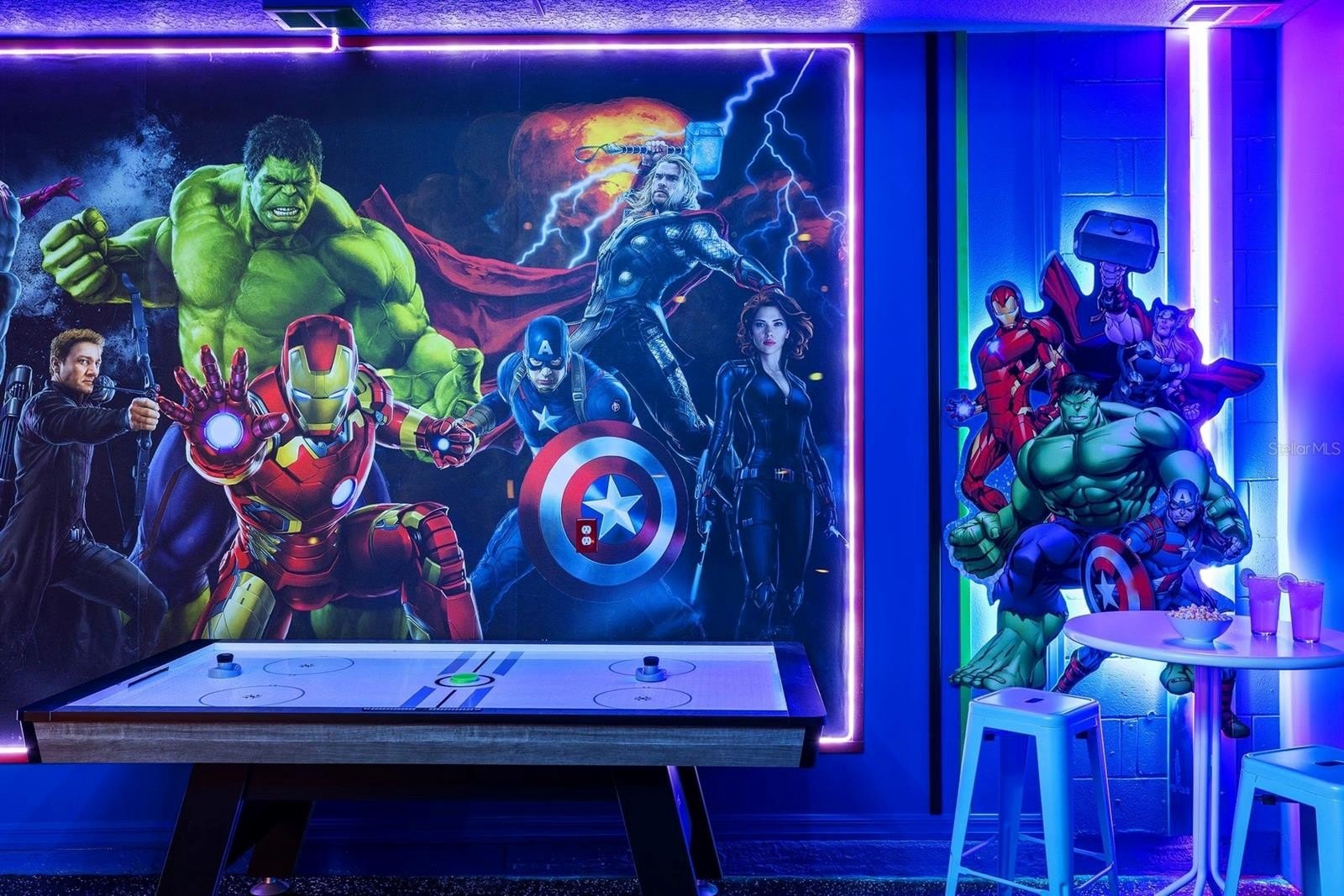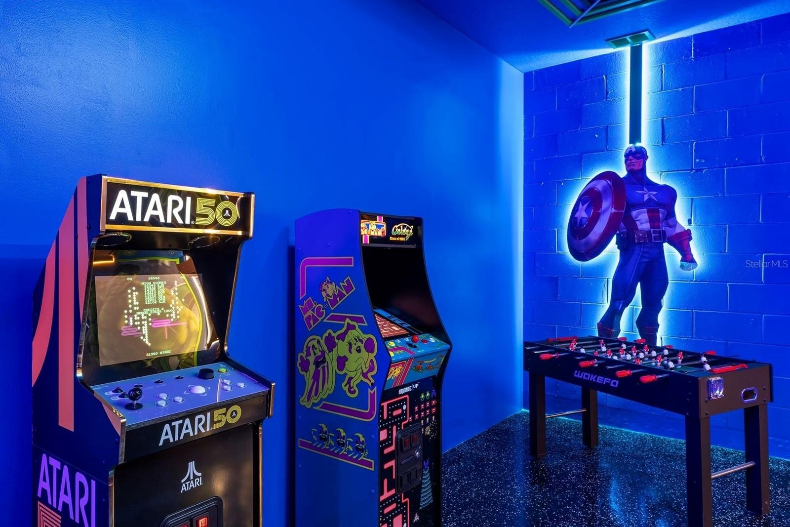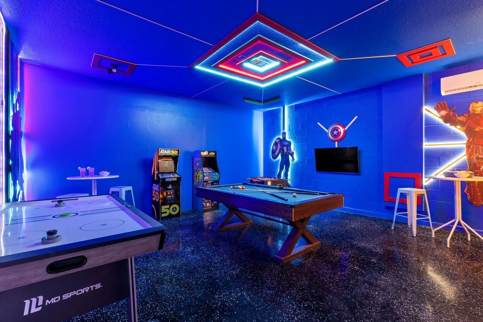 Entertainment is built in, with a fully equipped game room featuring air hockey, foosball, a pool table, and an Xbox, along with themed bedrooms designed to enhance the guest experience. Step outside to an extended lanai with a private pool and spa, offering a spacious outdoor setting for relaxing or entertaining.